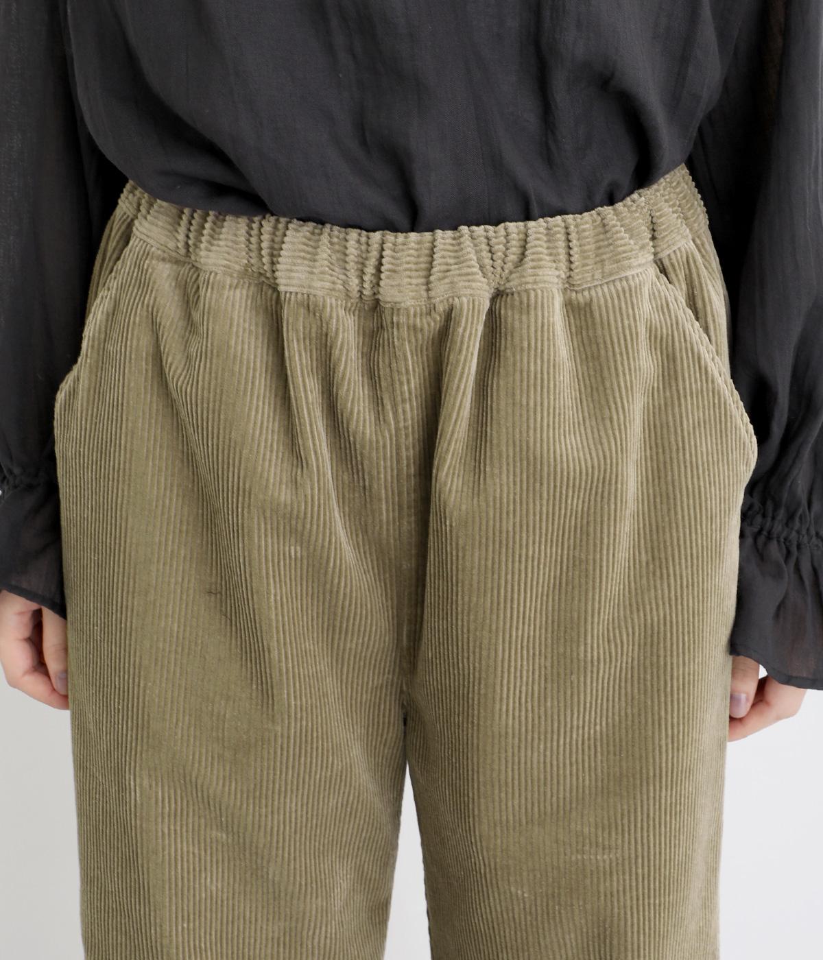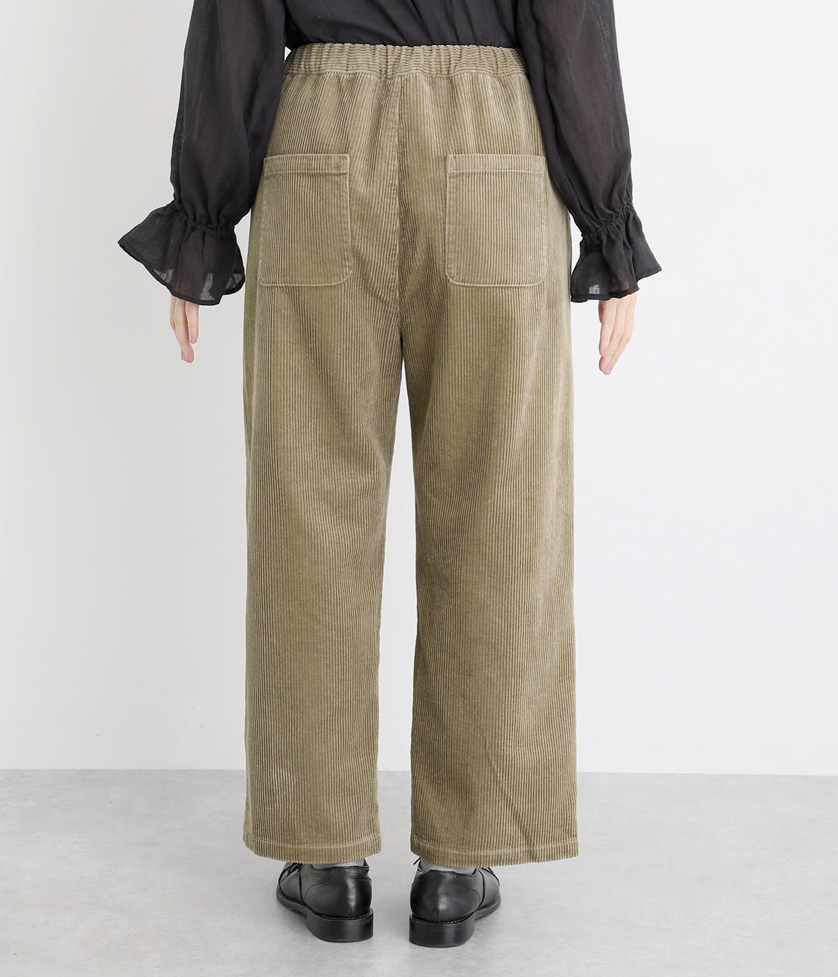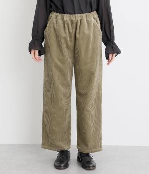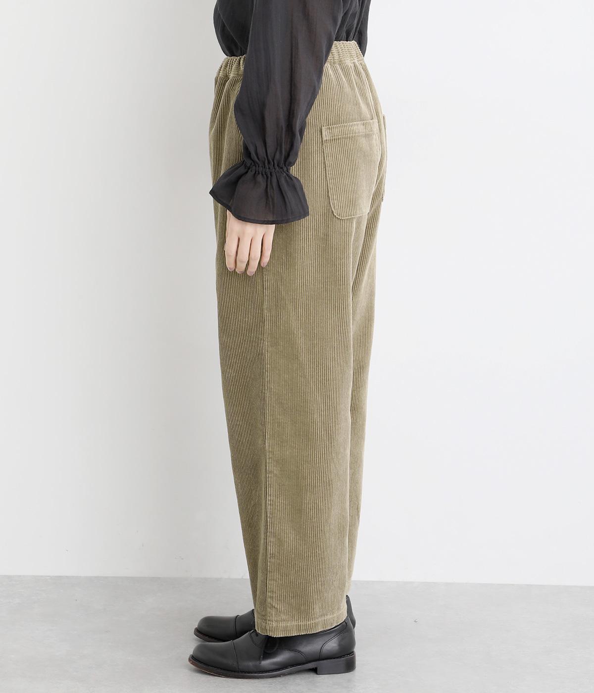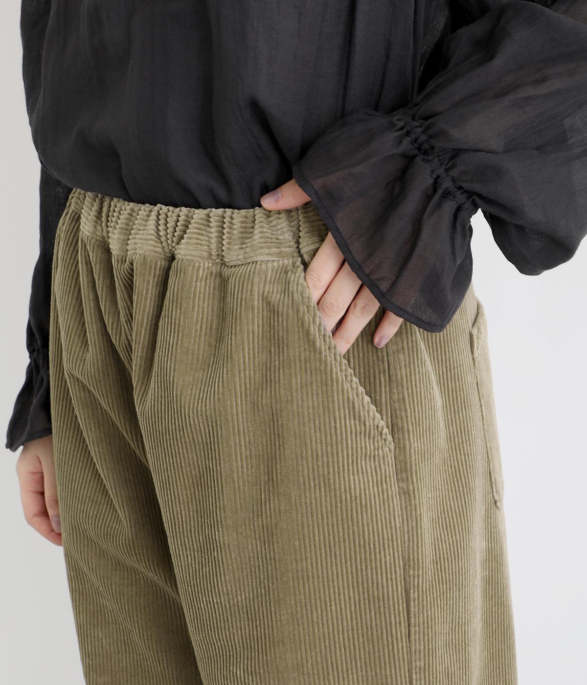 生地の持つ雰囲気や表情を活かしてシンプルに仕立てました。しっかりとした素材でワイドながらもすっきりとした印象に。ウエストはぐるりとゴムを入れた安定感のある作りで、内紐で微調整も可能。ヒップポケットがカジュアルポイントです。