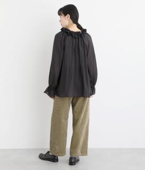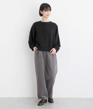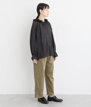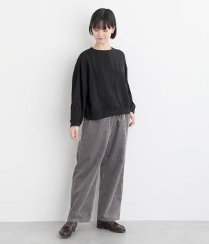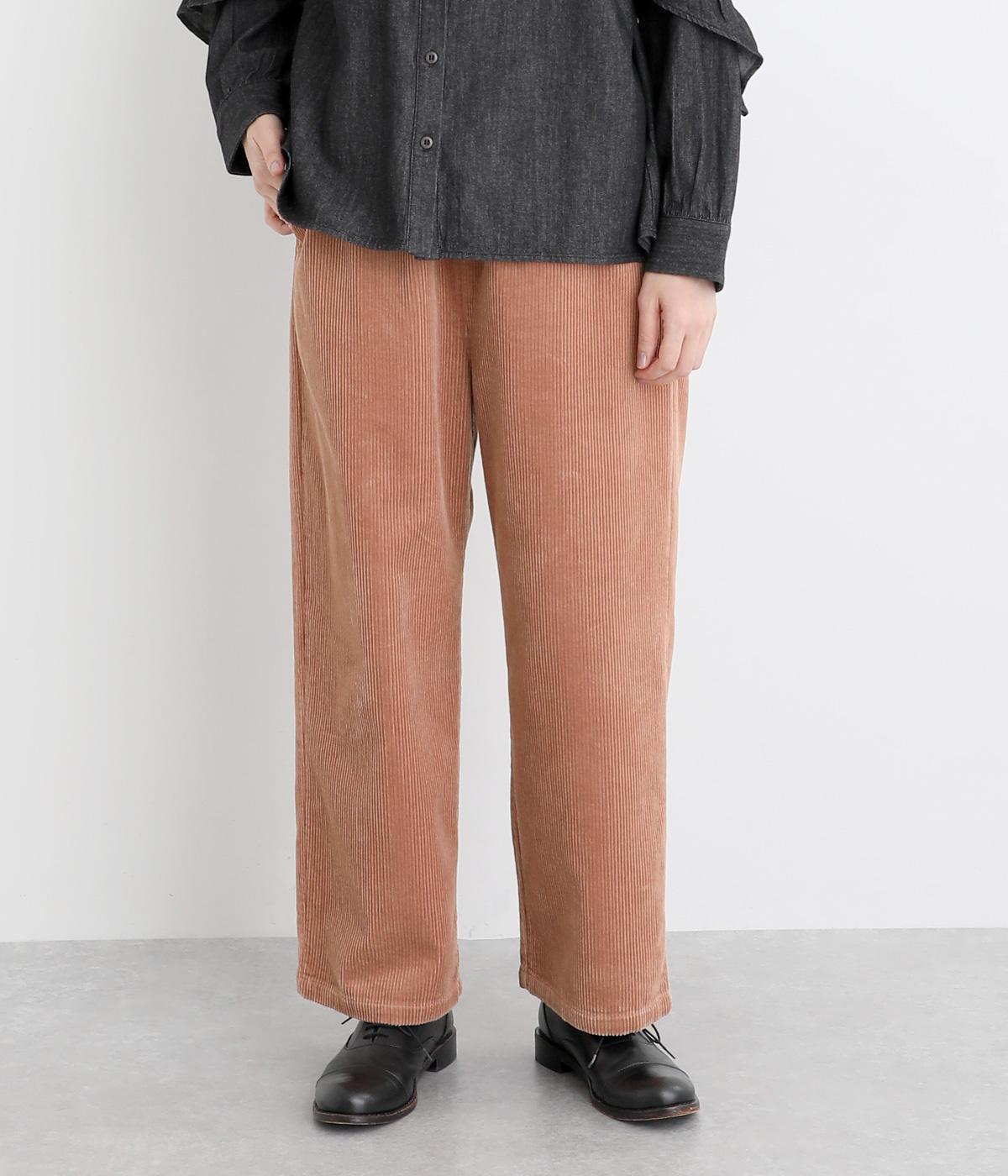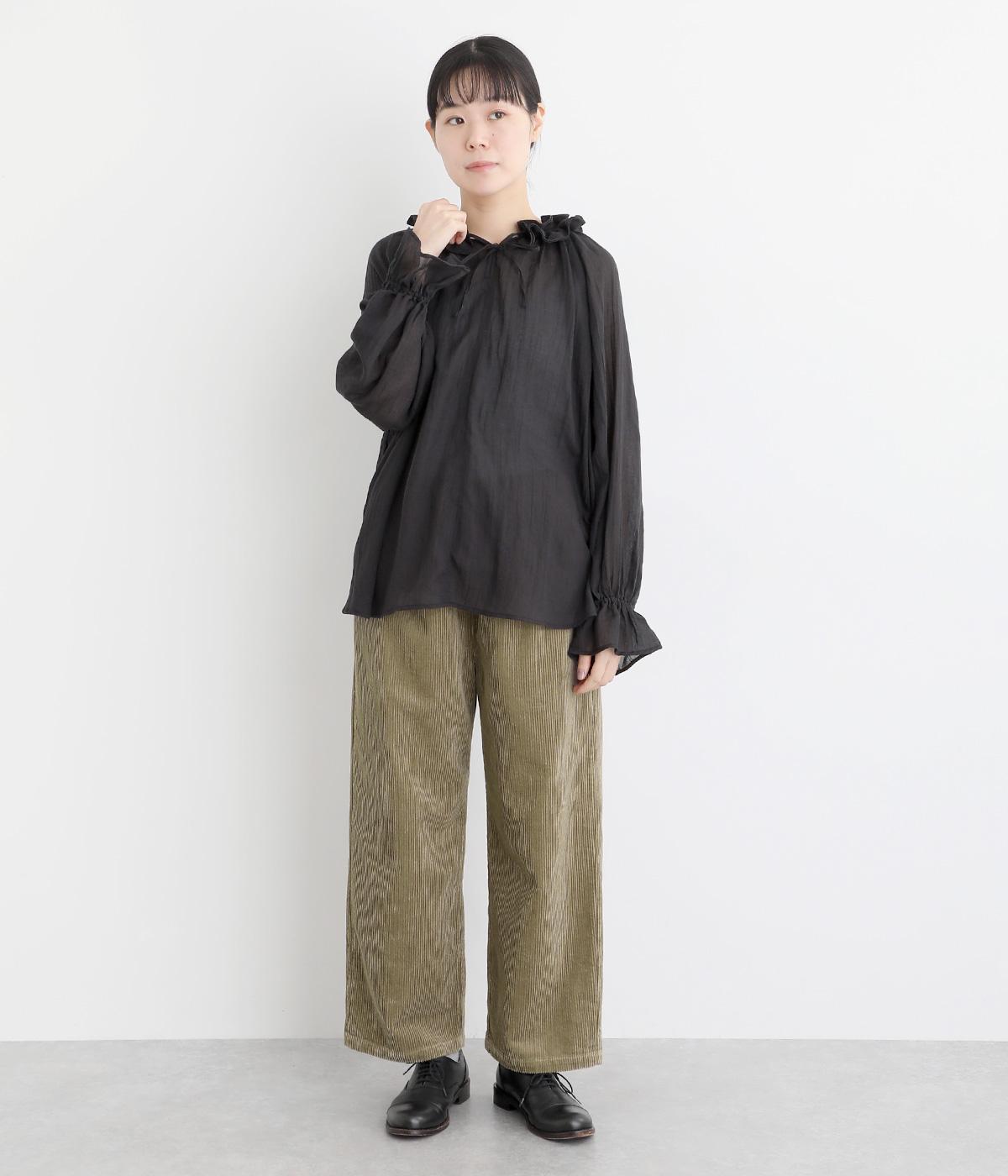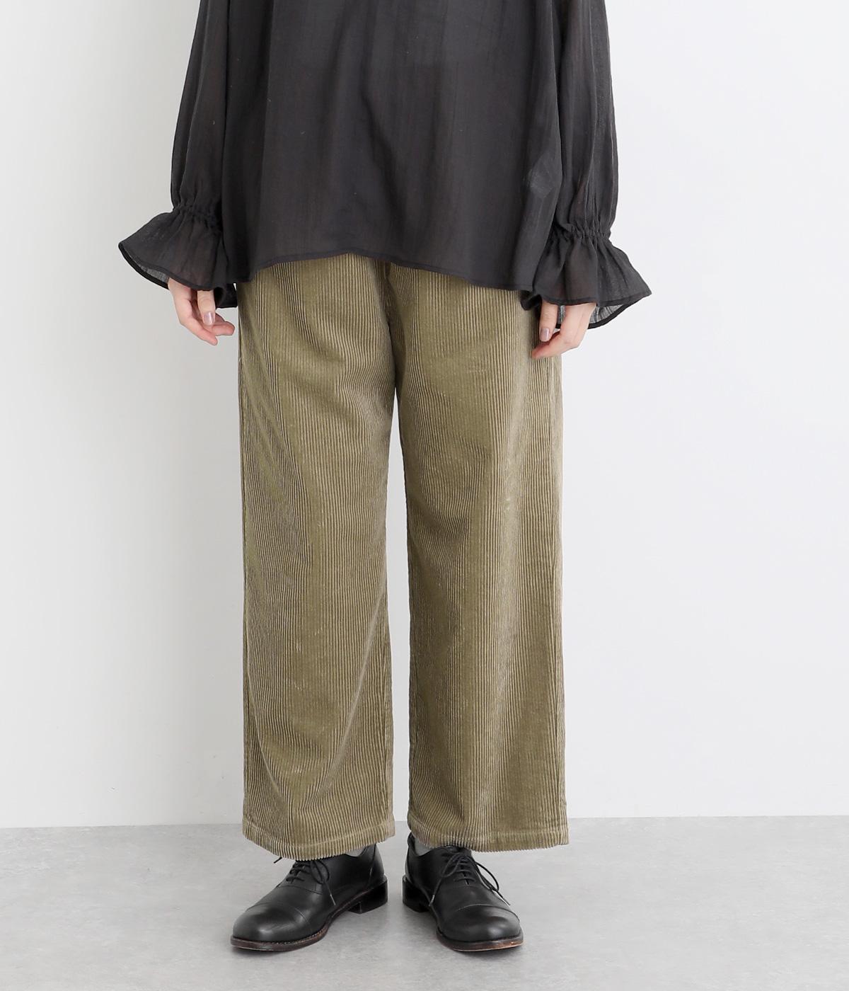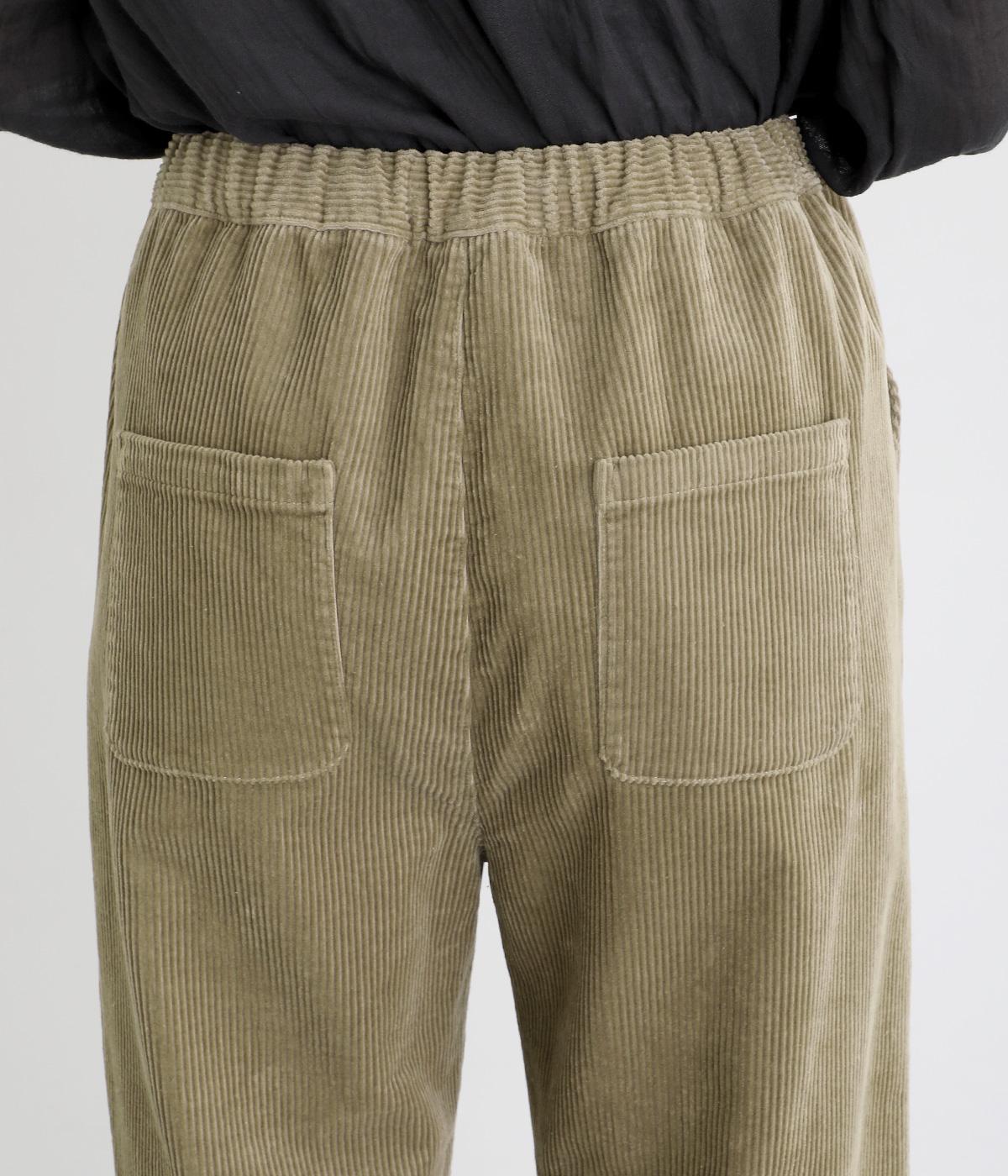 生地の持つ雰囲気や表情を活かしてシンプルに仕立てました。しっかりとした素材でワイドながらもすっきりとした印象に。ウエストはぐるりとゴムを入れた安定感のある作りで、内紐で微調整も可能。ヒップポケットがカジュアルポイントです。