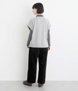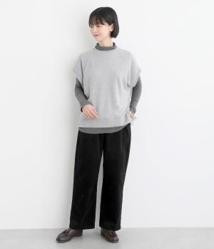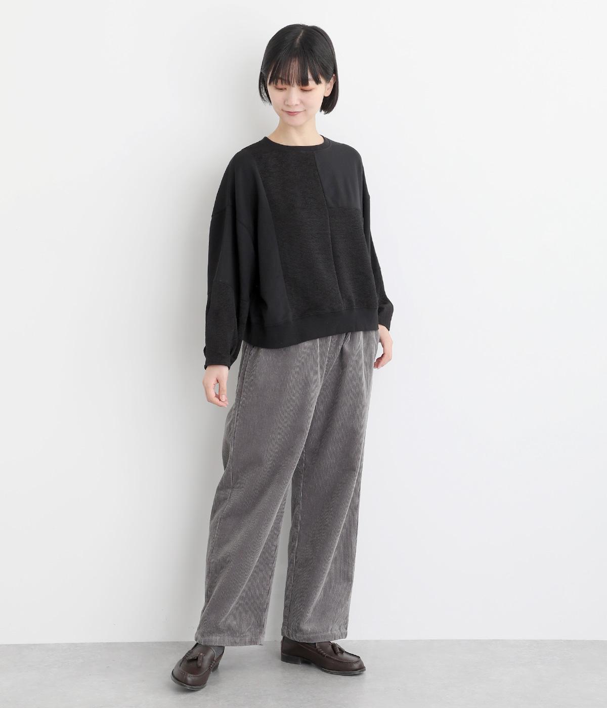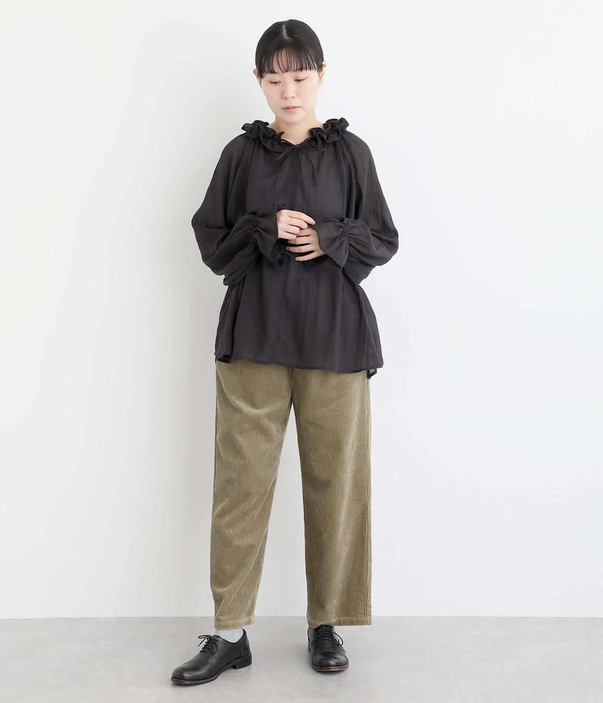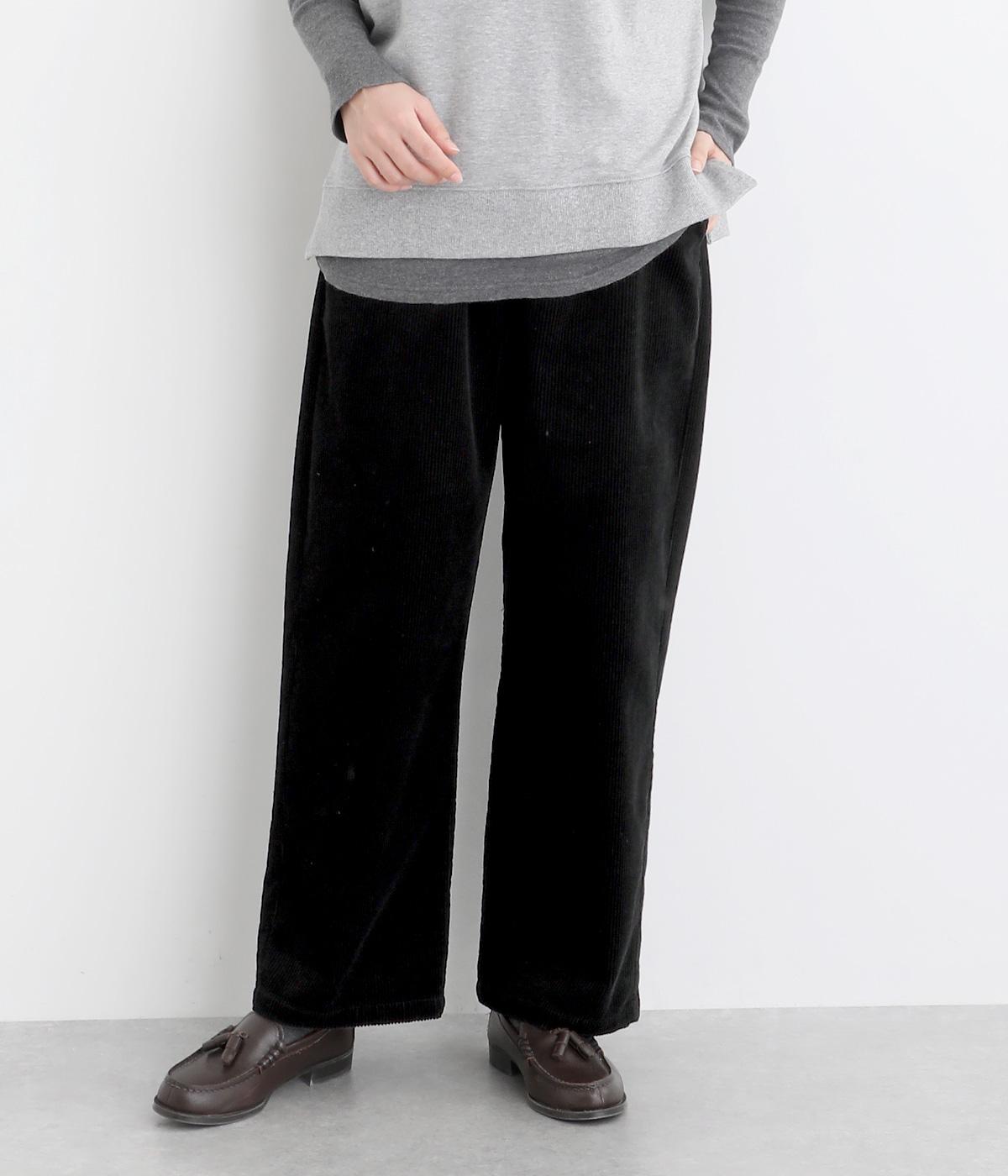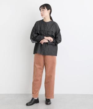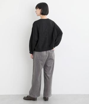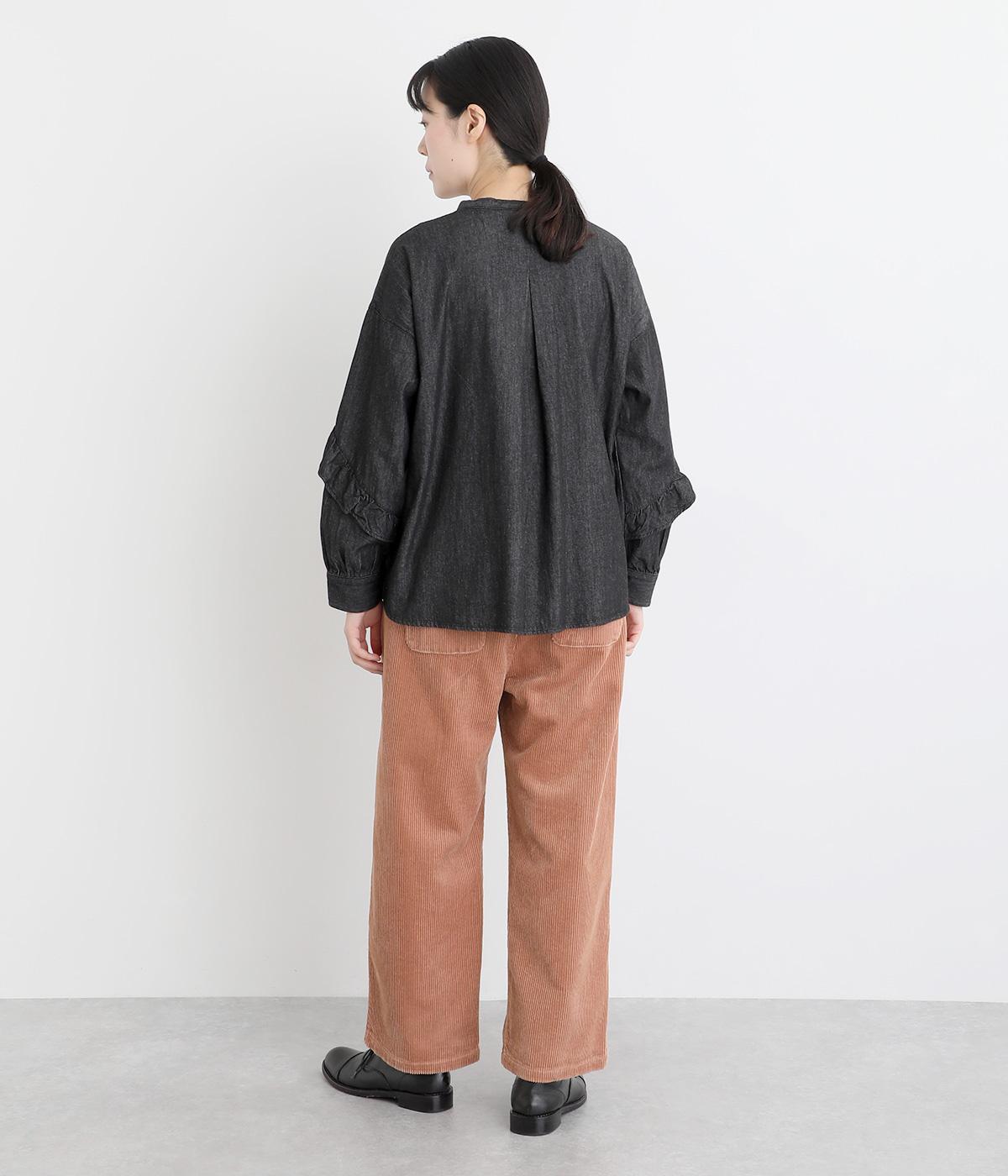 生地の持つ雰囲気や表情を活かしてシンプルに仕立てました。しっかりとした素材でワイドながらもすっきりとした印象に。ウエストはぐるりとゴムを入れた安定感のある作りで、内紐で微調整も可能。ヒップポケットがカジュアルポイントです。