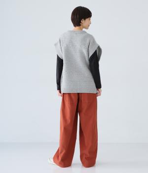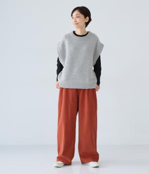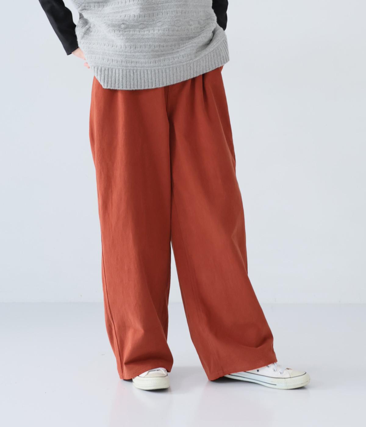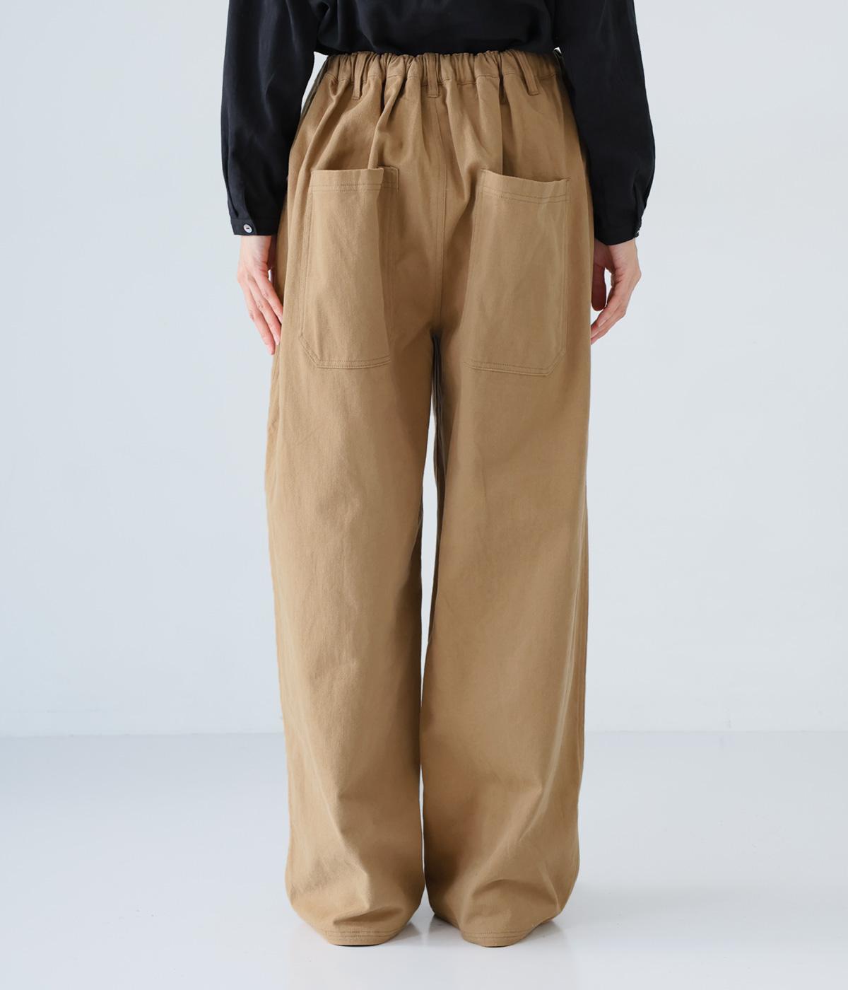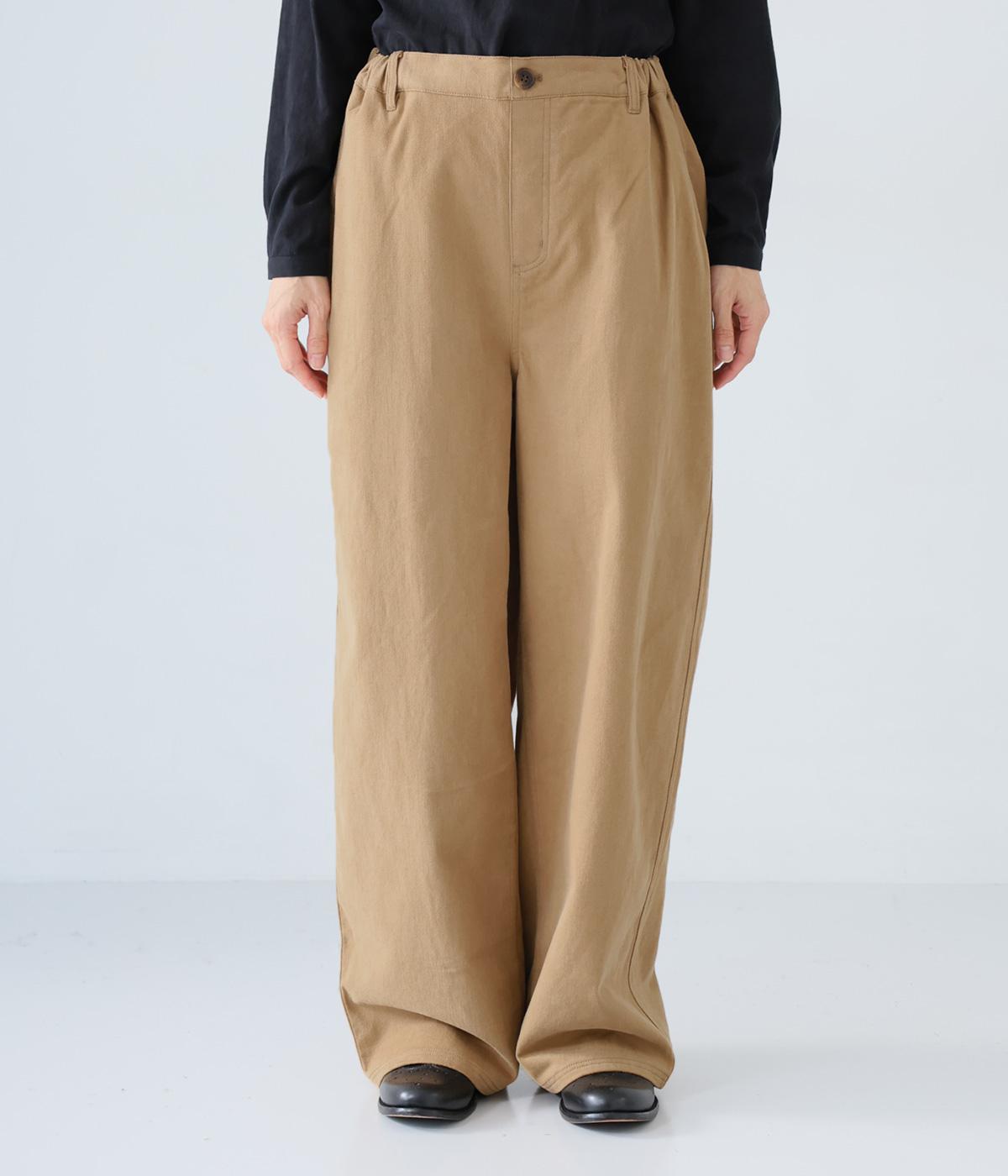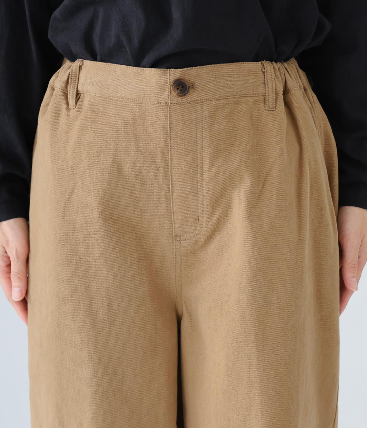 ゆったりとしたワイドなストレートシルエットが大人カジュアルな装いに最適なパンツ。ウエストは後ろゴムに内紐を通しているので脱ぎはきもスムーズ。こなれ感のあるロング丈で、スニーカー合わせでラフに、ヒールシューズできれいめに合わせるのも◎。