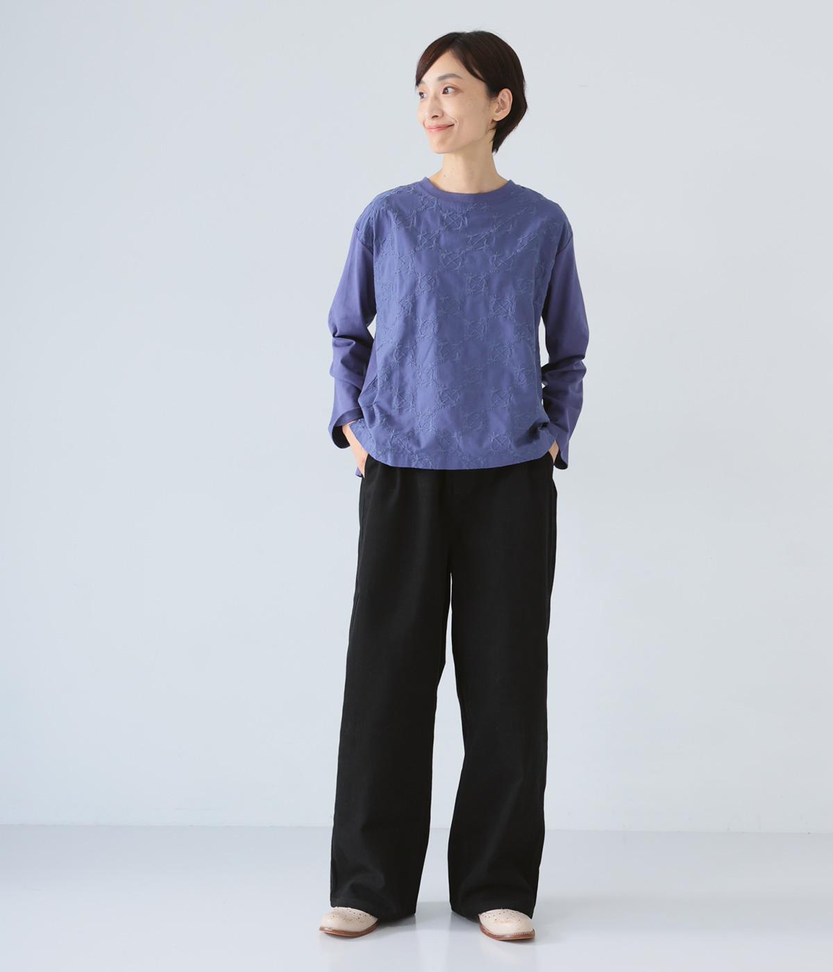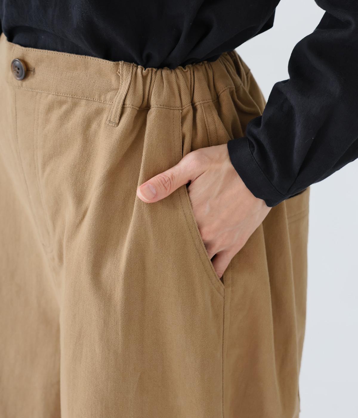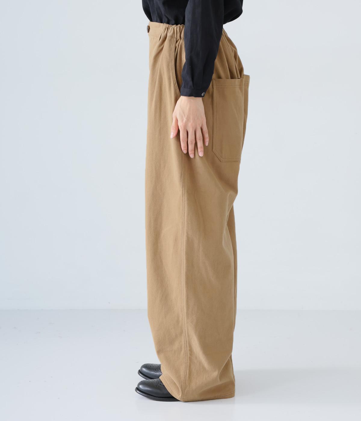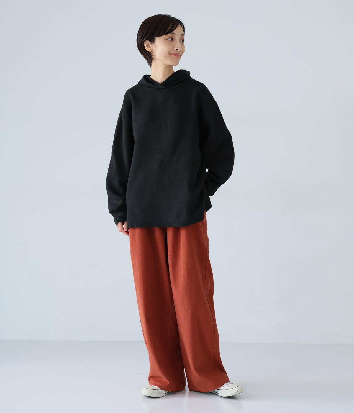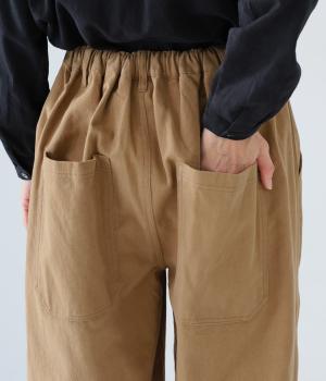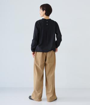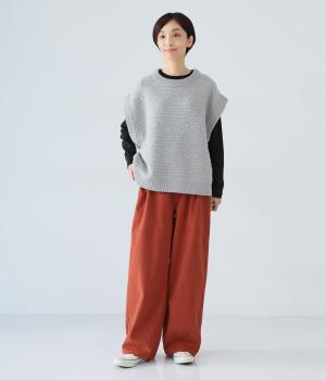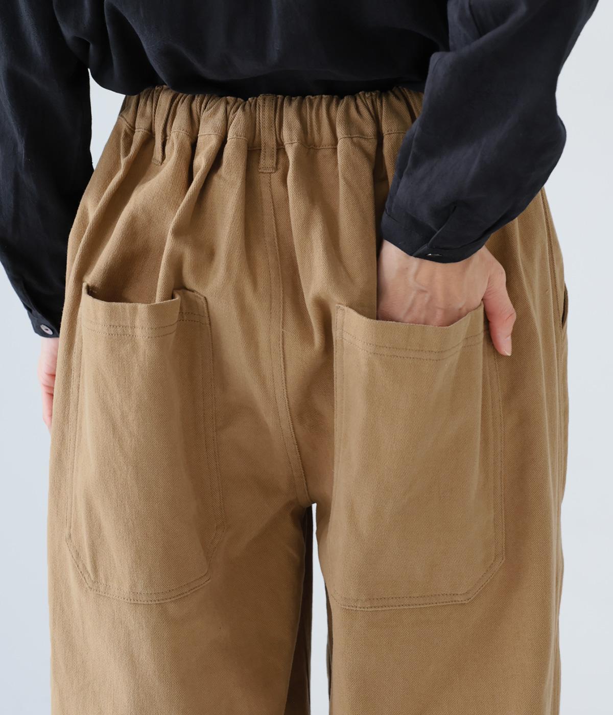 ゆったりとしたワイドなストレートシルエットが大人カジュアルな装いに最適なパンツ。ウエストは後ろゴムに内紐を通しているので脱ぎはきもスムーズ。こなれ感のあるロング丈で、スニーカー合わせでラフに、ヒールシューズできれいめに合わせるのも◎。