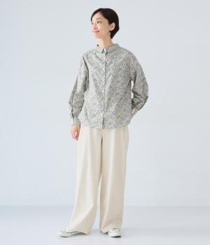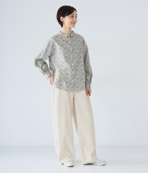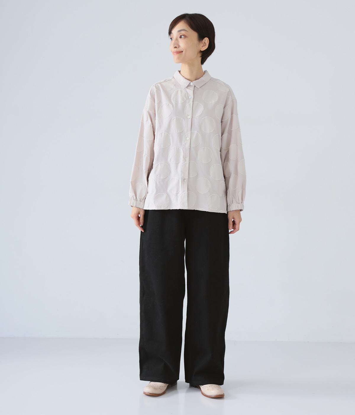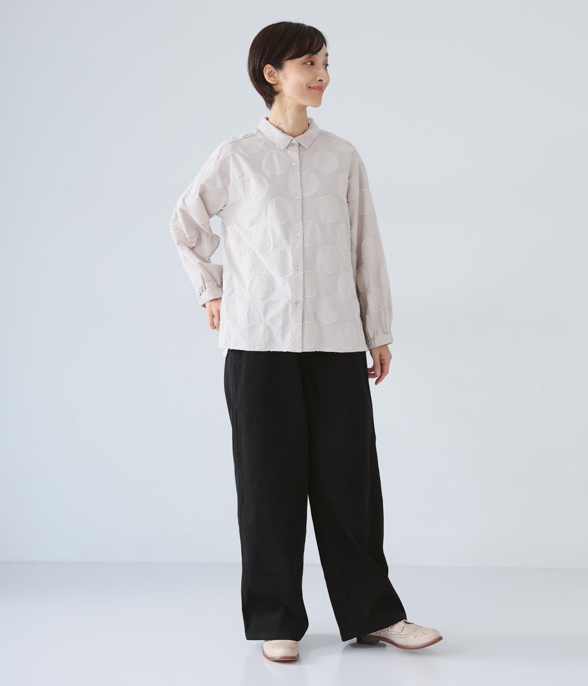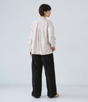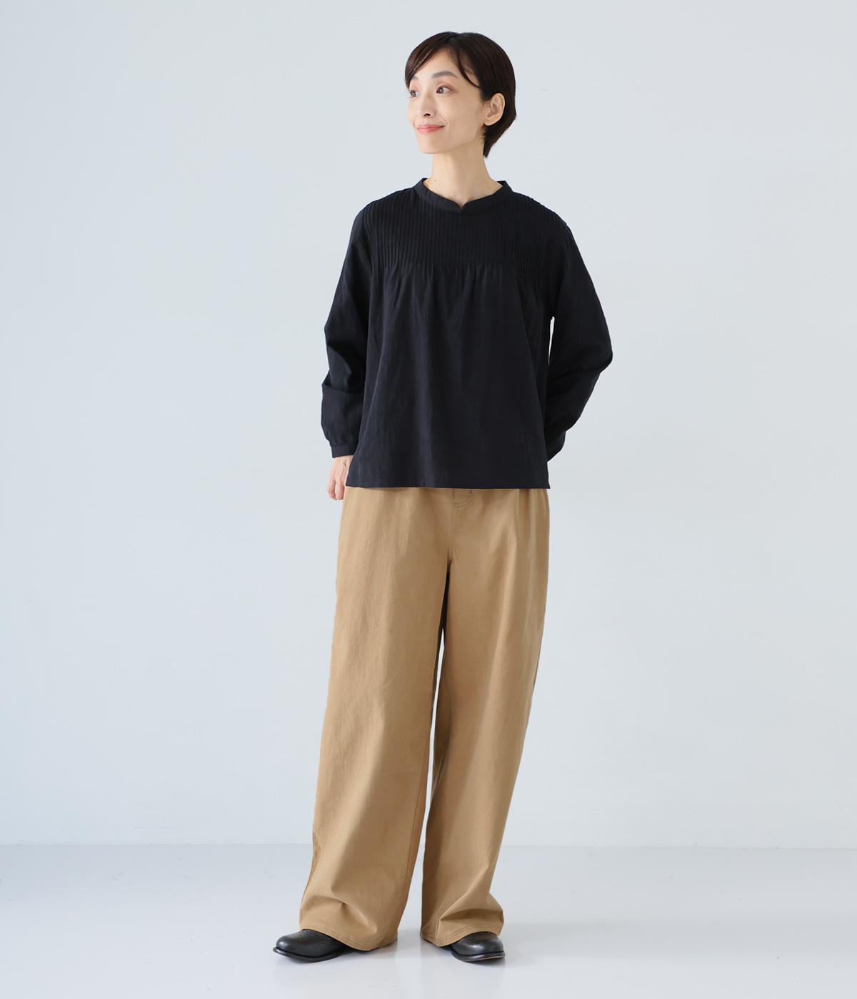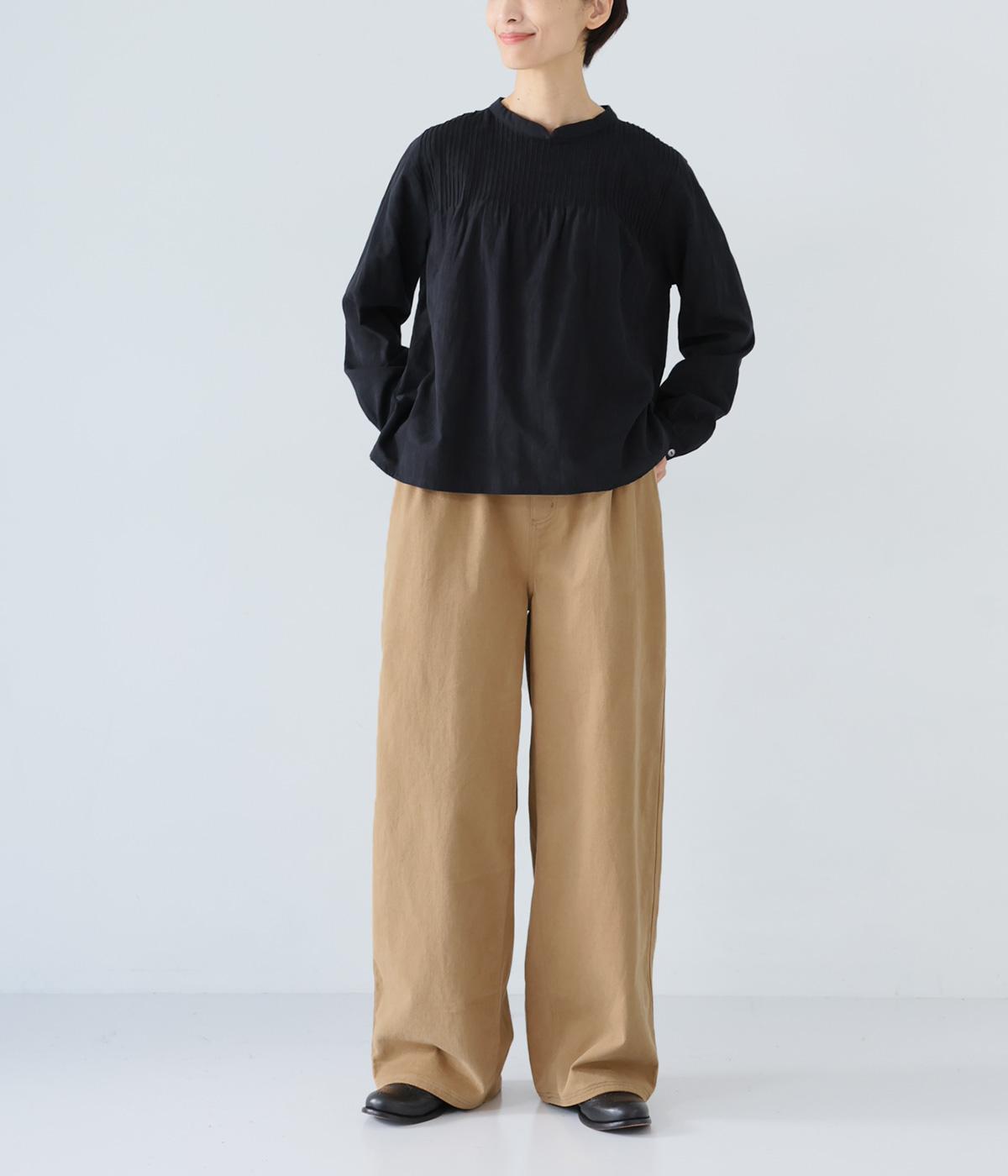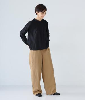 ゆったりとしたワイドなストレートシルエットが大人カジュアルな装いに最適なパンツ。ウエストは後ろゴムに内紐を通しているので脱ぎはきもスムーズ。こなれ感のあるロング丈で、スニーカー合わせでラフに、ヒールシューズできれいめに合わせるのも◎。