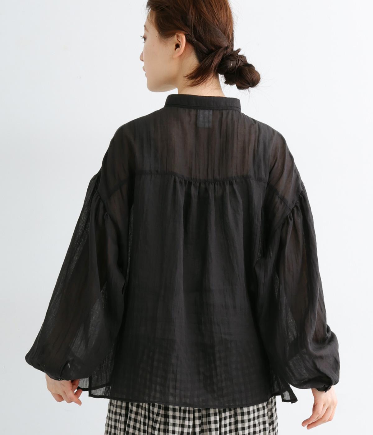 小ぶりの襟と、ころっとしたハトメくるみボタンが愛らしいブラウス。ゆったりとしたシルエットが、ガーゼ生地と相まってより軽やかな印象を与えてくれます。タックやギャザー使いにもこだわった、どこから見ても着映えが叶う一枚です。