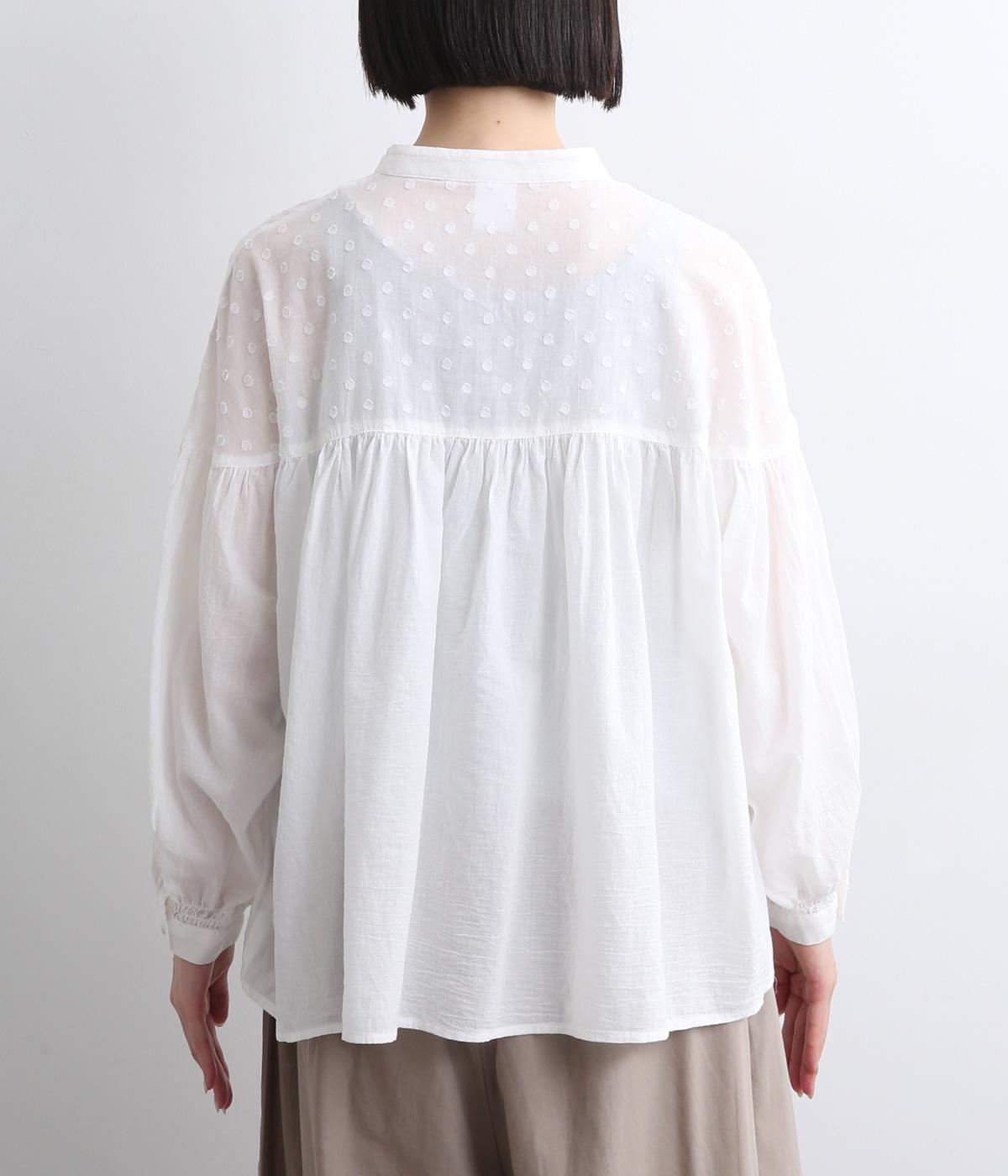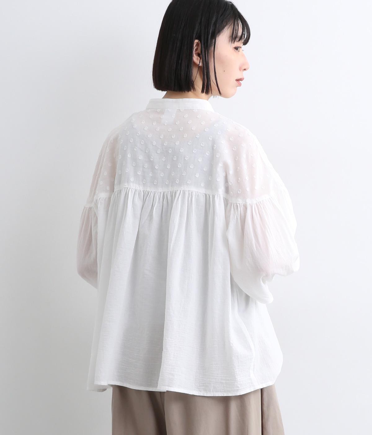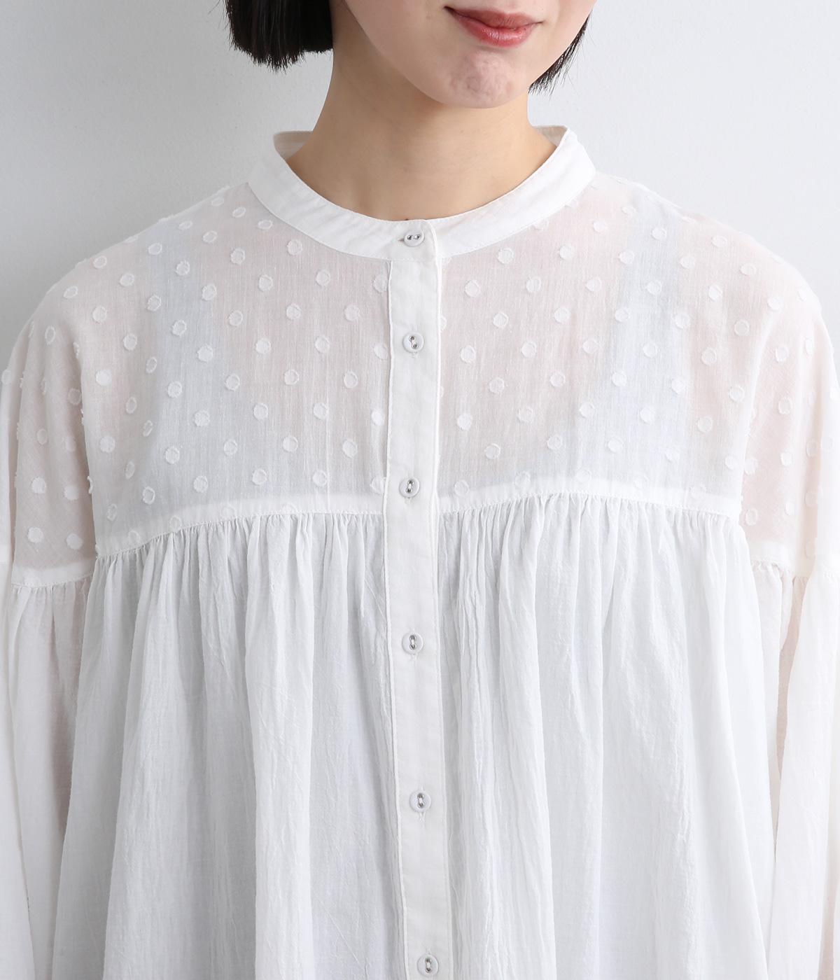 自然なシワ感がナチュラルさを演出するコットンローンと、さり気なく表情をつけてくれるドビードットを切り替えました。どちらも軽やかでやわらかく快適に着用できます。