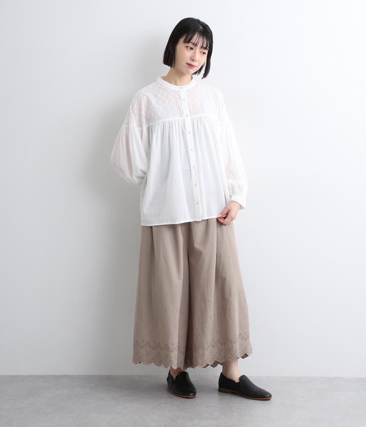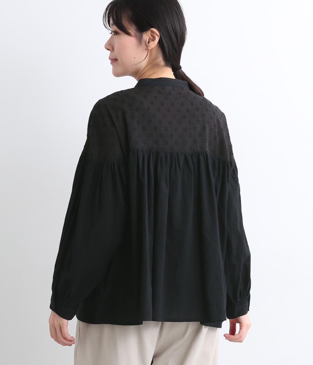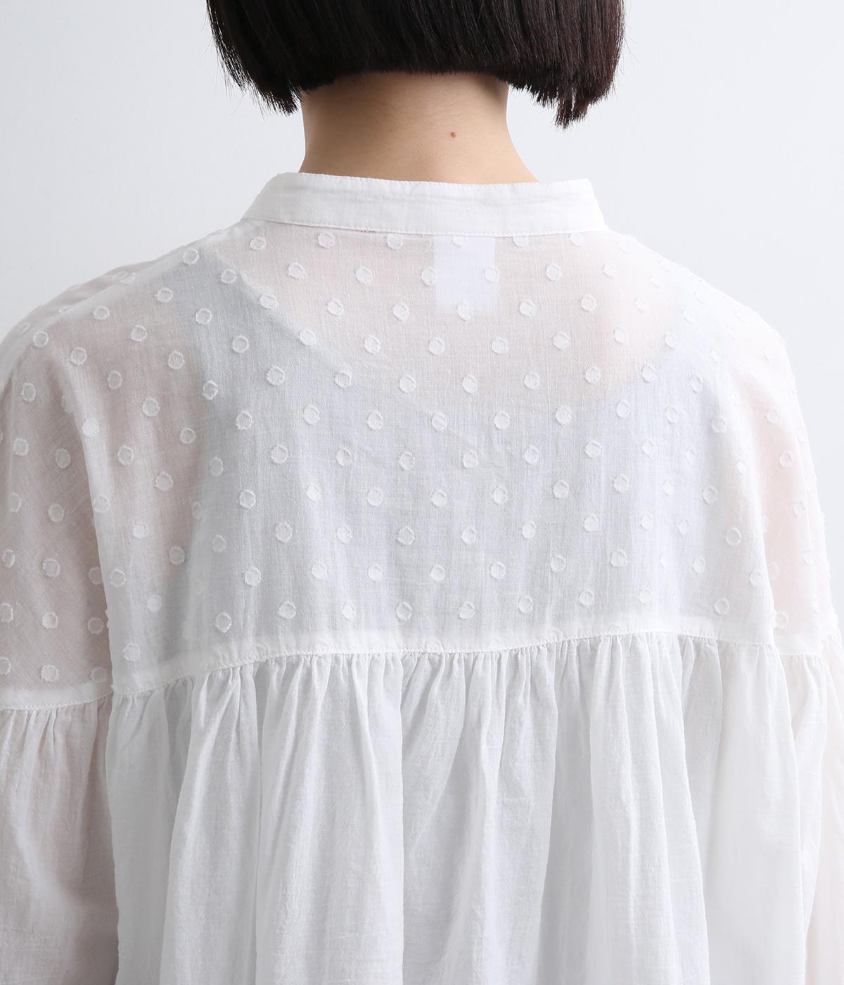 自然なシワ感がナチュラルさを演出するコットンローンと、さり気なく表情をつけてくれるドビードットを切り替えました。どちらも軽やかでやわらかく快適に着用できます。