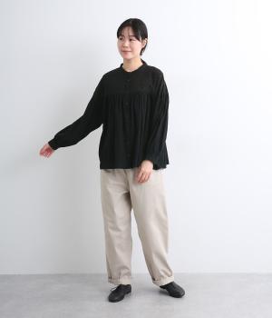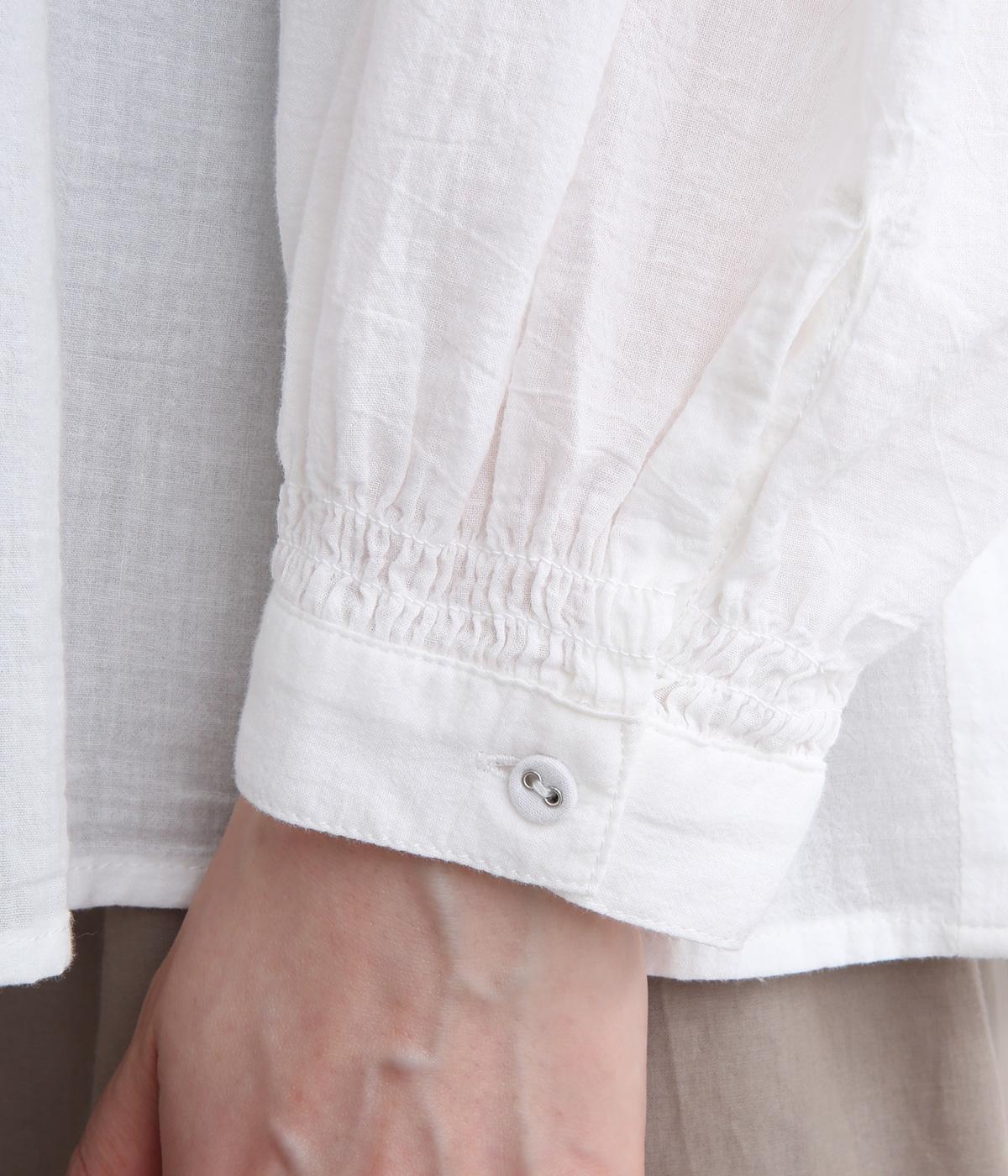 身頃から袖の切り替え部分にたっぷりとギャザーをほどこし、袖口のシャーリングでふんわりとしたシルエットに仕上げました。なじみのいいくるみボタンでクラシカルな印象も。前あきなので汗ばむ季節の冷房対策として羽織っても◎。