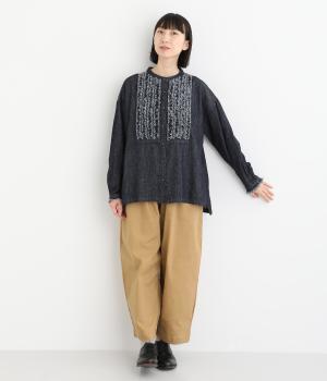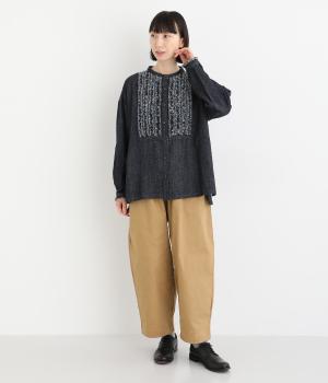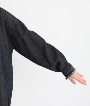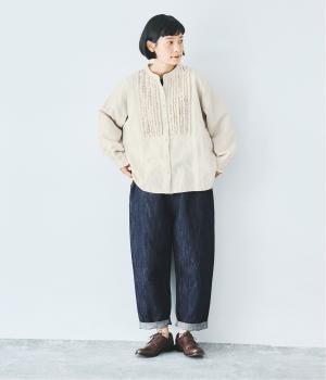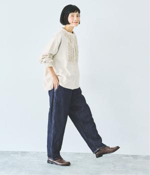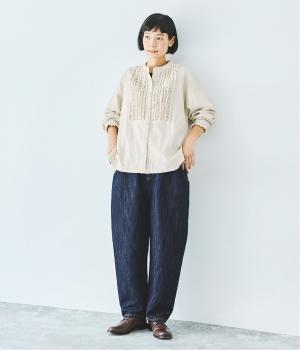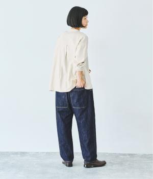 空気をたっぷりと含ませて、ごわつきの少ないやわらかな風合いに仕上げたコットンリネンの甘撚りデニム。着こむほどにより心地よく肌になじんでいきます。