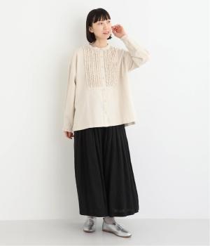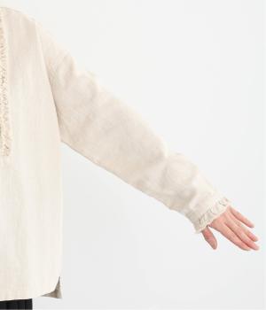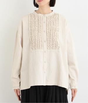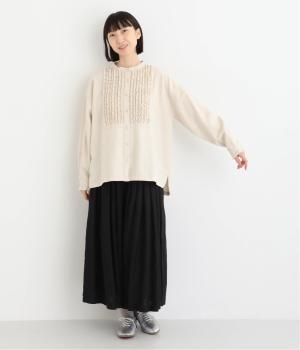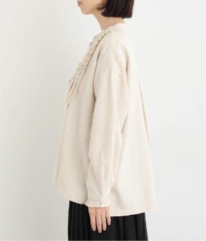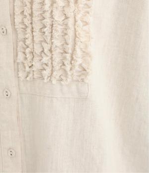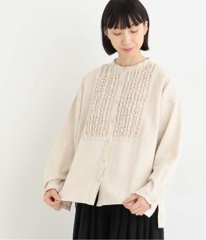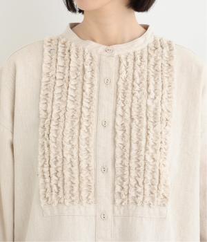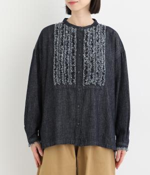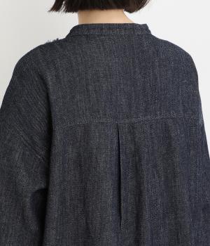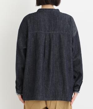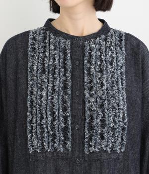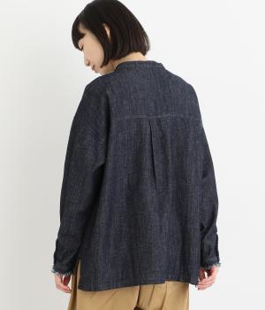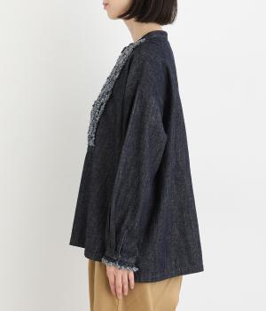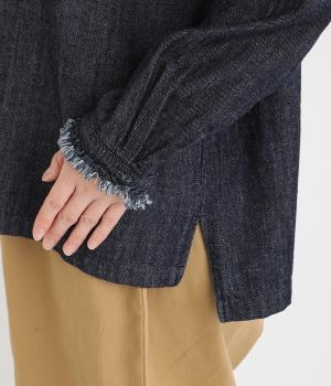 フロントの立体的なフリンジが顔まわりを華やか印象づけるデニムシャツ。視線を上に誘導して、長めの着丈をすっきりと見せてくれます。背面にはセンタープリーツを入れてアクセントに。気になるヒップまわりをカバーする前後差をつけた着丈と、抜け感をうむサイドスリットもポイントです。