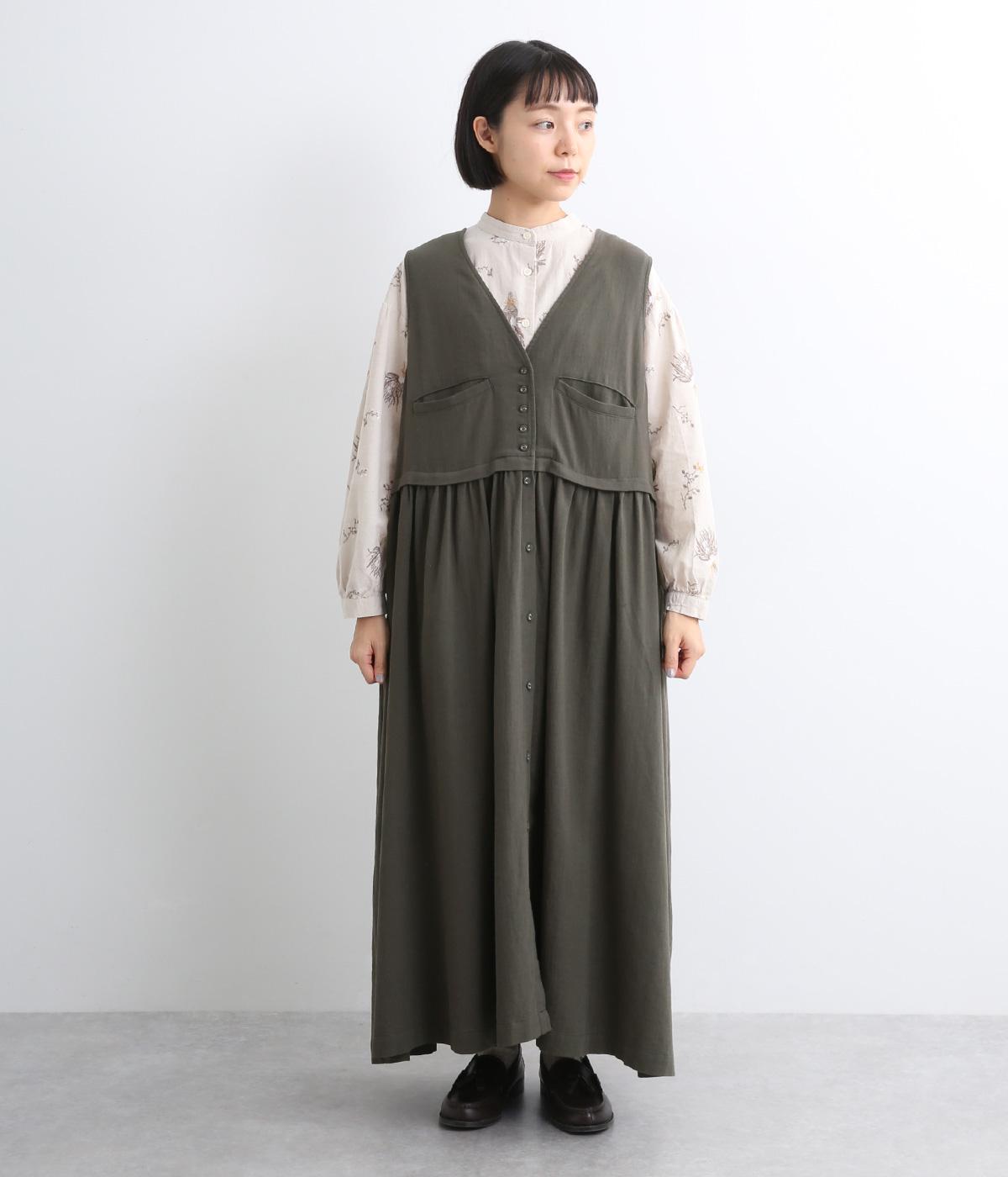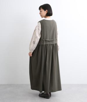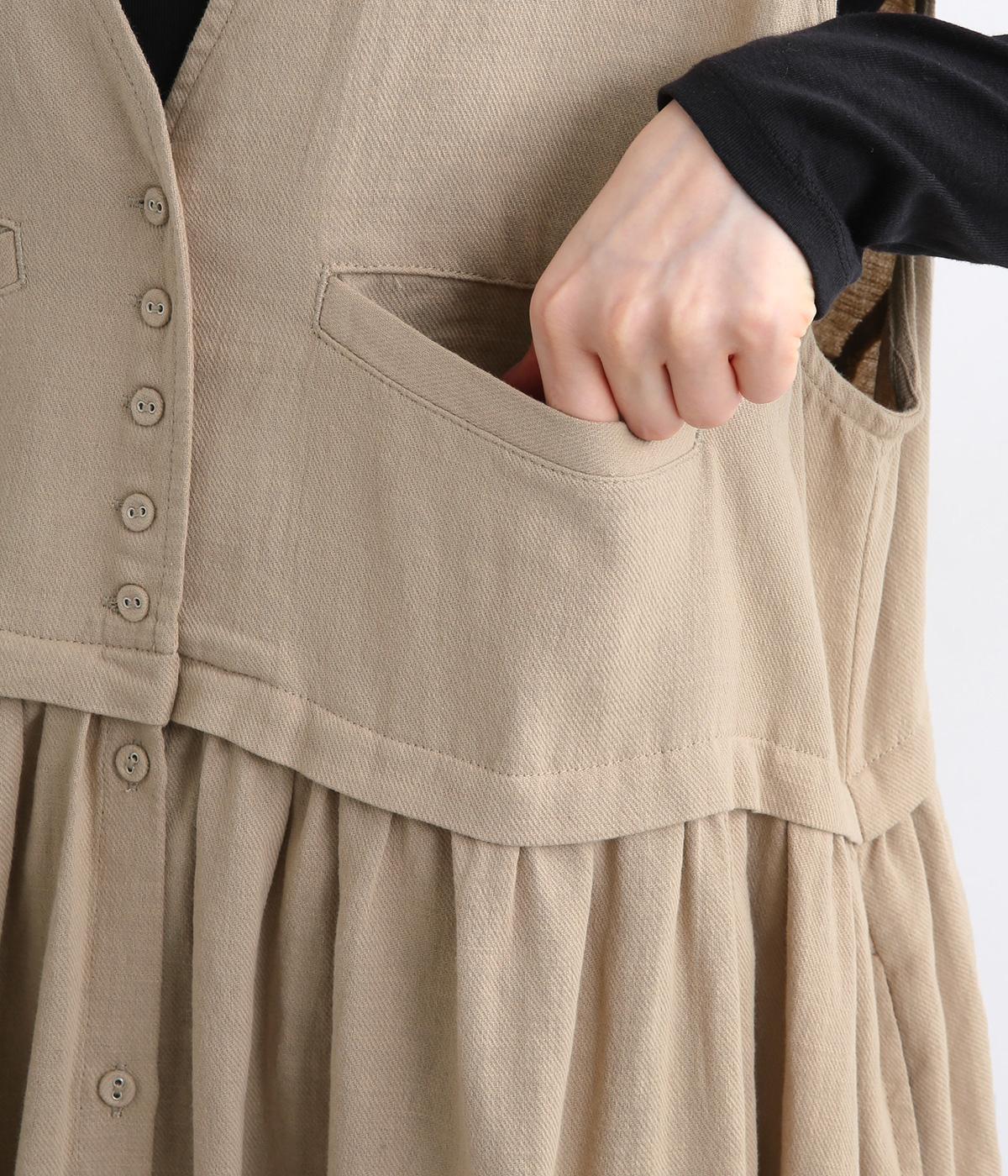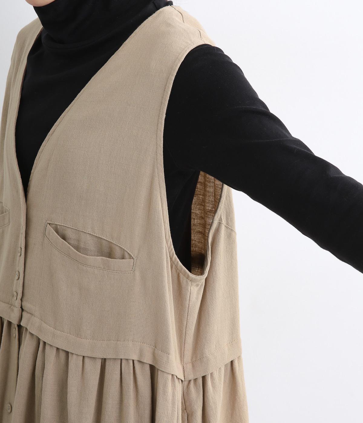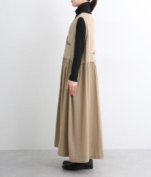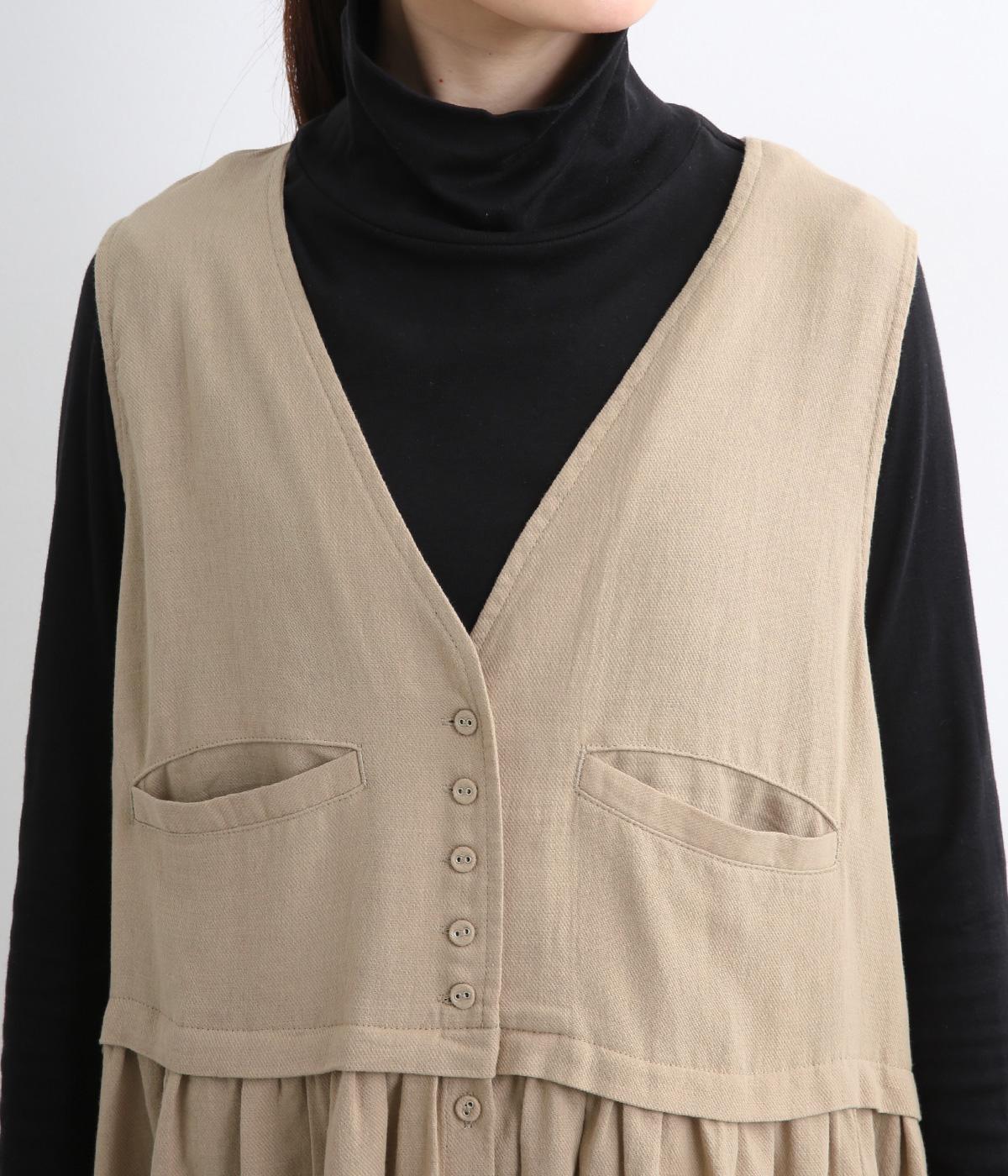 ジレベストがドッキングされた仕様のワンピースです。ウエストまわりにたっぷりとギャザーをほどこし、ふんわりしたシルエットに仕上げました。ベスト部分のポケットが愛らしさを添え、コーディネートのアクセントになっています。