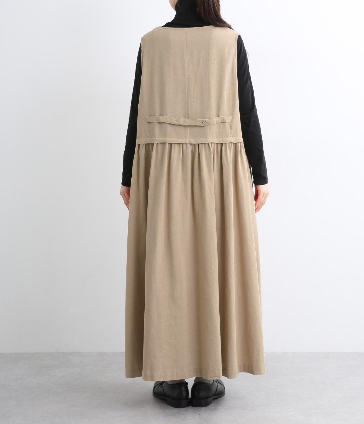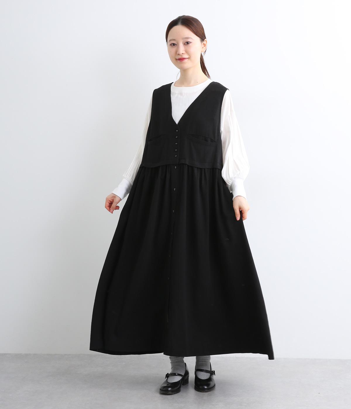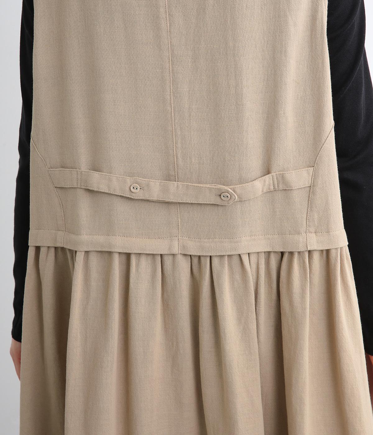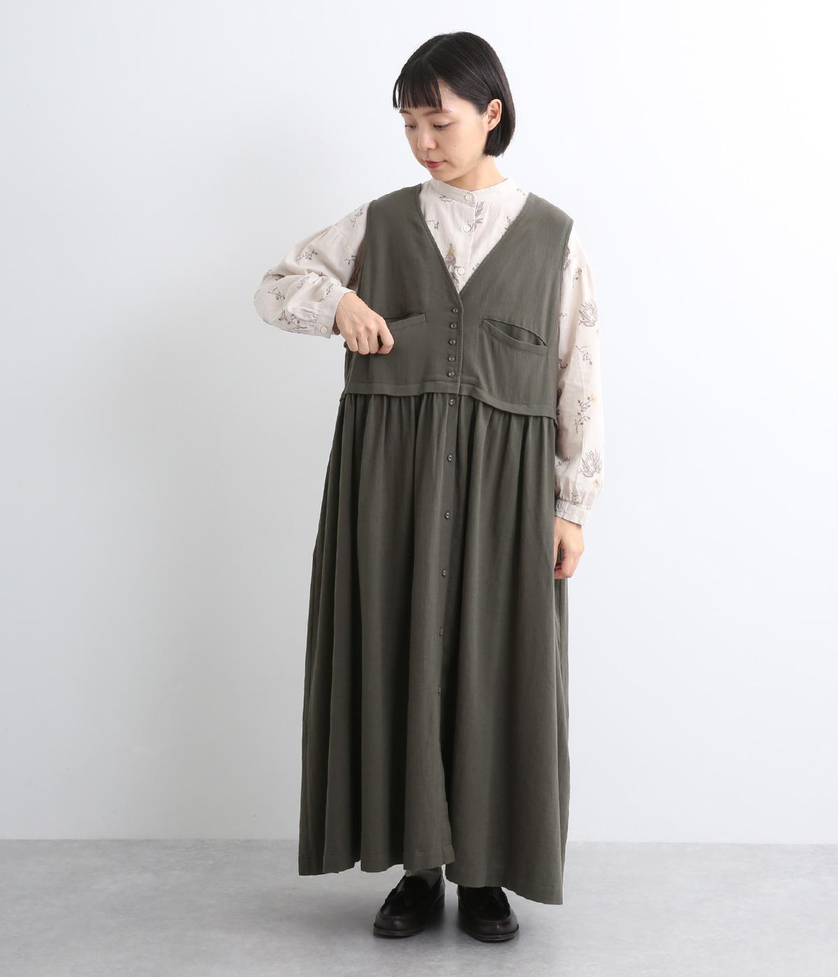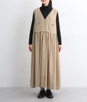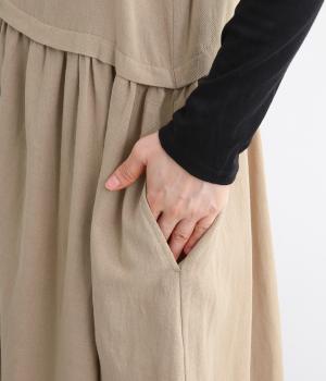 ジレベストがドッキングされた仕様のワンピースです。ウエストまわりにたっぷりとギャザーをほどこし、ふんわりしたシルエットに仕上げました。ベスト部分のポケットが愛らしさを添え、コーディネートのアクセントになっています。