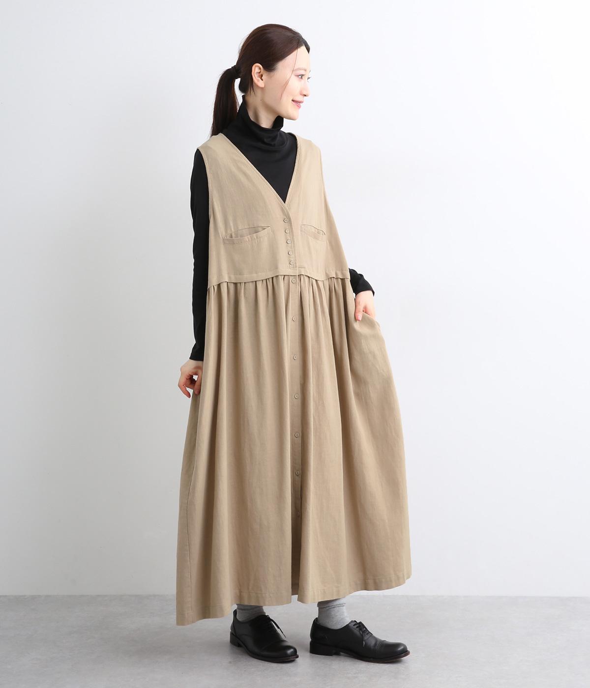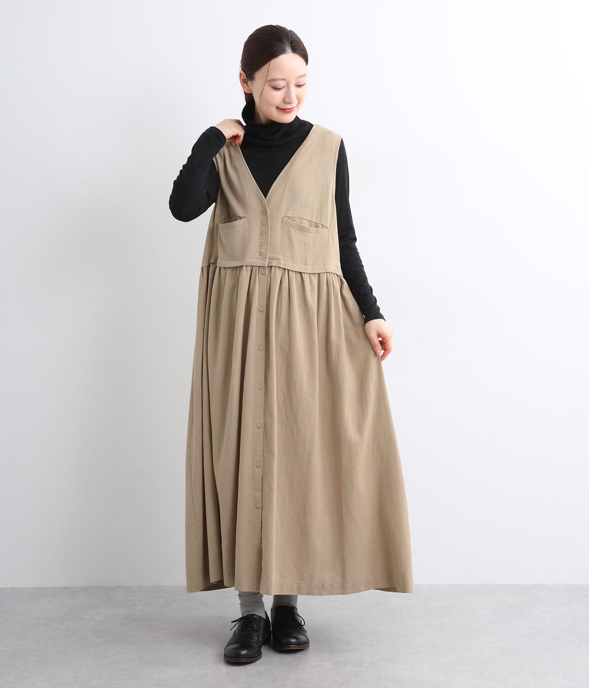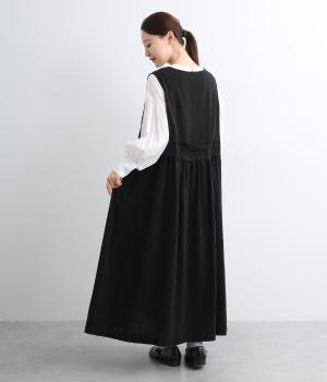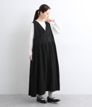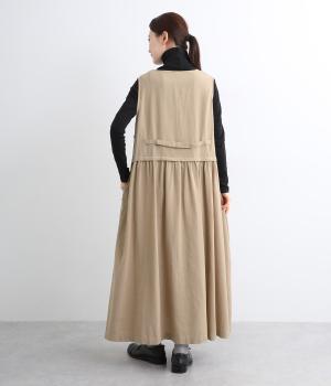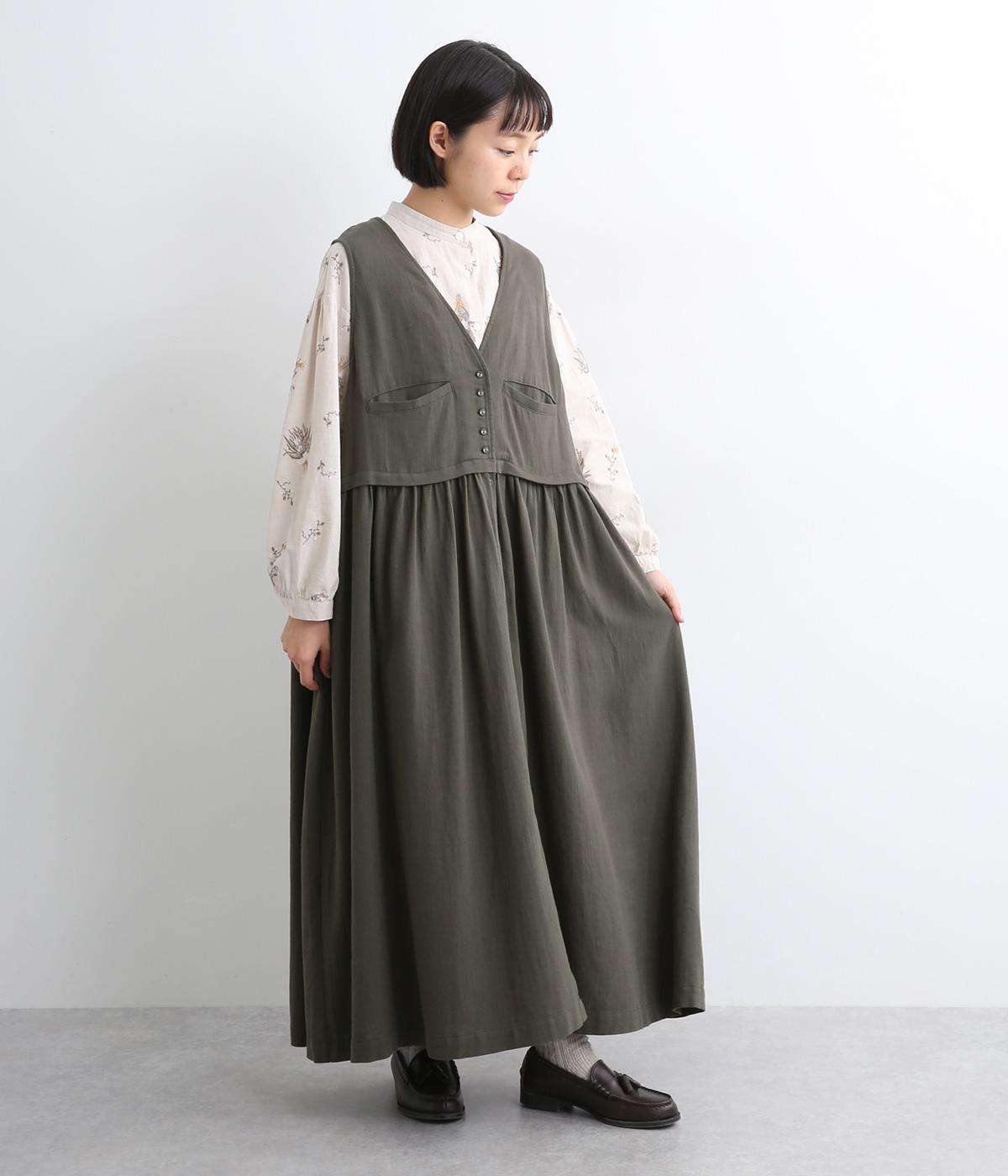 ジレベストがドッキングされた仕様のワンピースです。ウエストまわりにたっぷりとギャザーをほどこし、ふんわりしたシルエットに仕上げました。ベスト部分のポケットが愛らしさを添え、コーディネートのアクセントになっています。