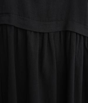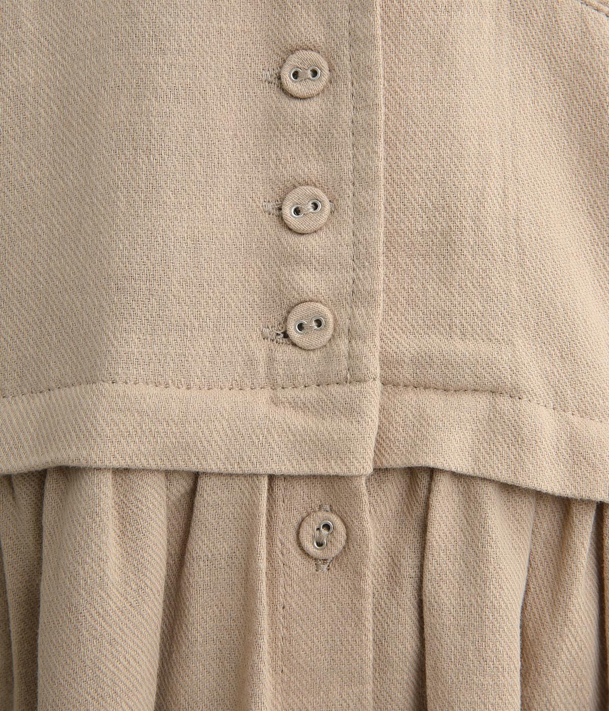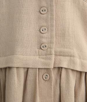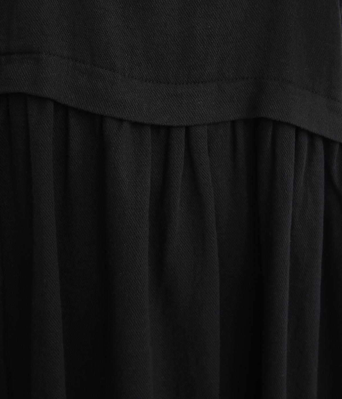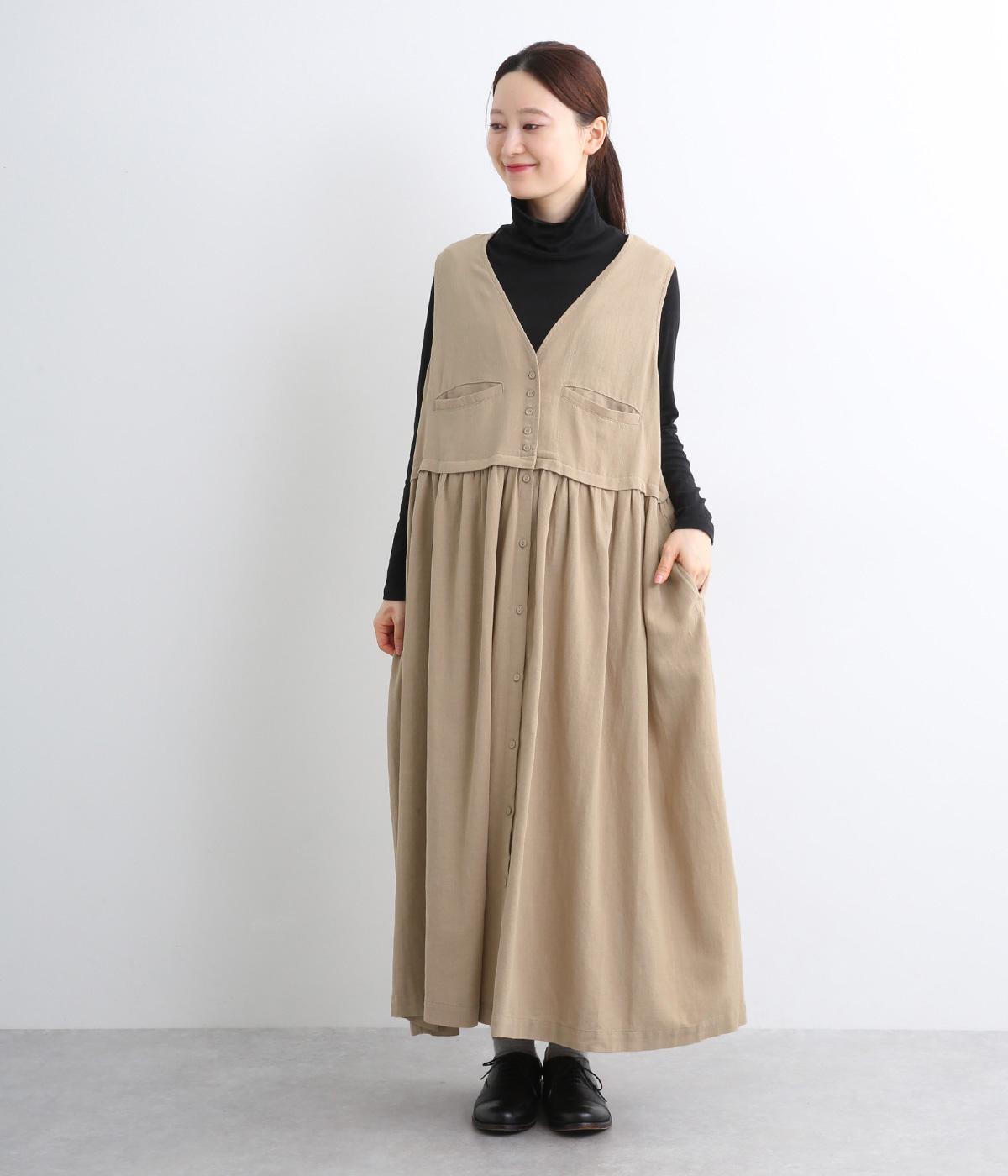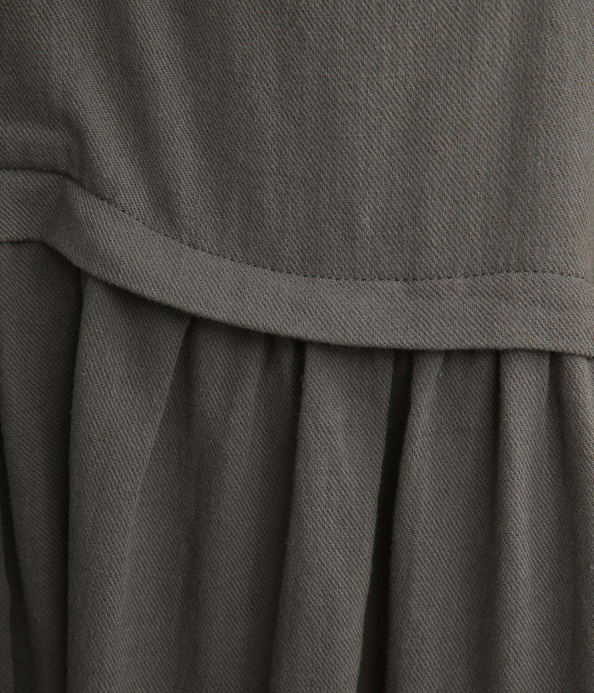 ジレベストがドッキングされた仕様のワンピースです。ウエストまわりにたっぷりとギャザーをほどこし、ふんわりしたシルエットに仕上げました。ベスト部分のポケットが愛らしさを添え、コーディネートのアクセントになっています。