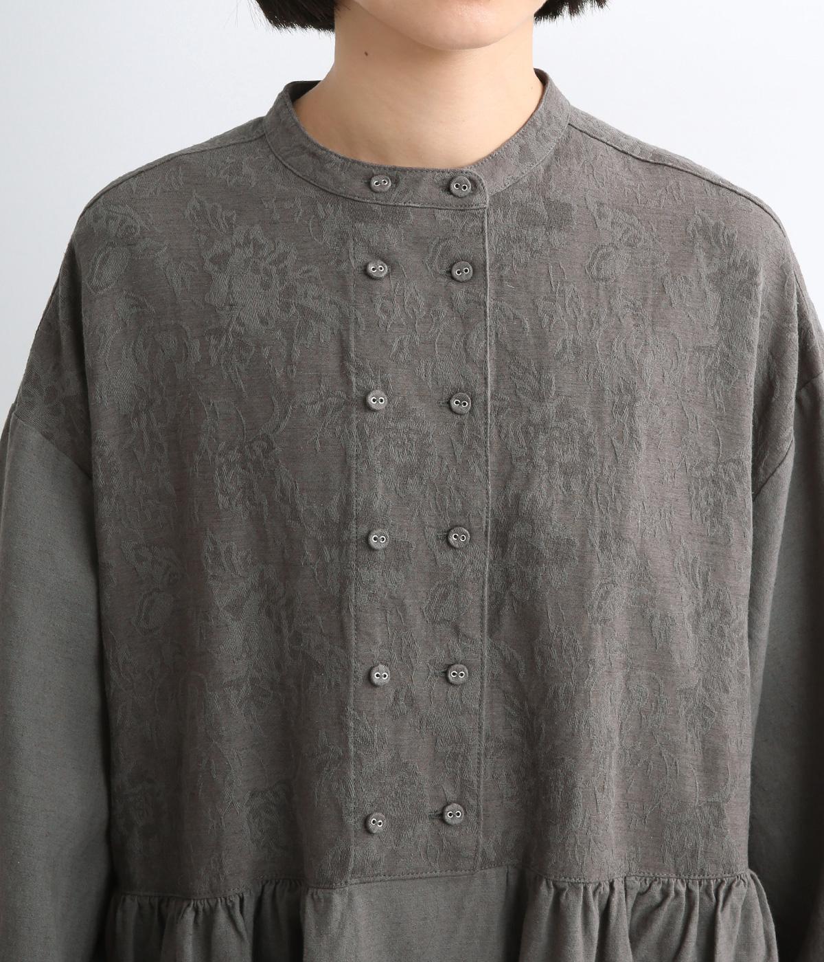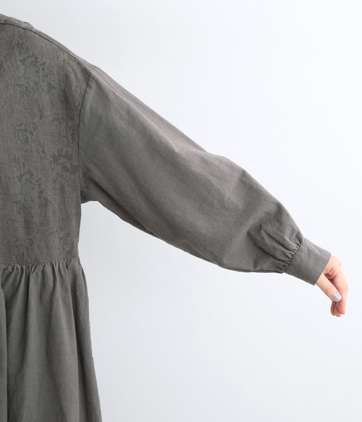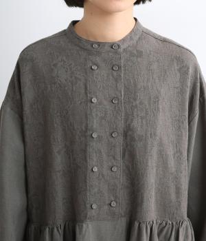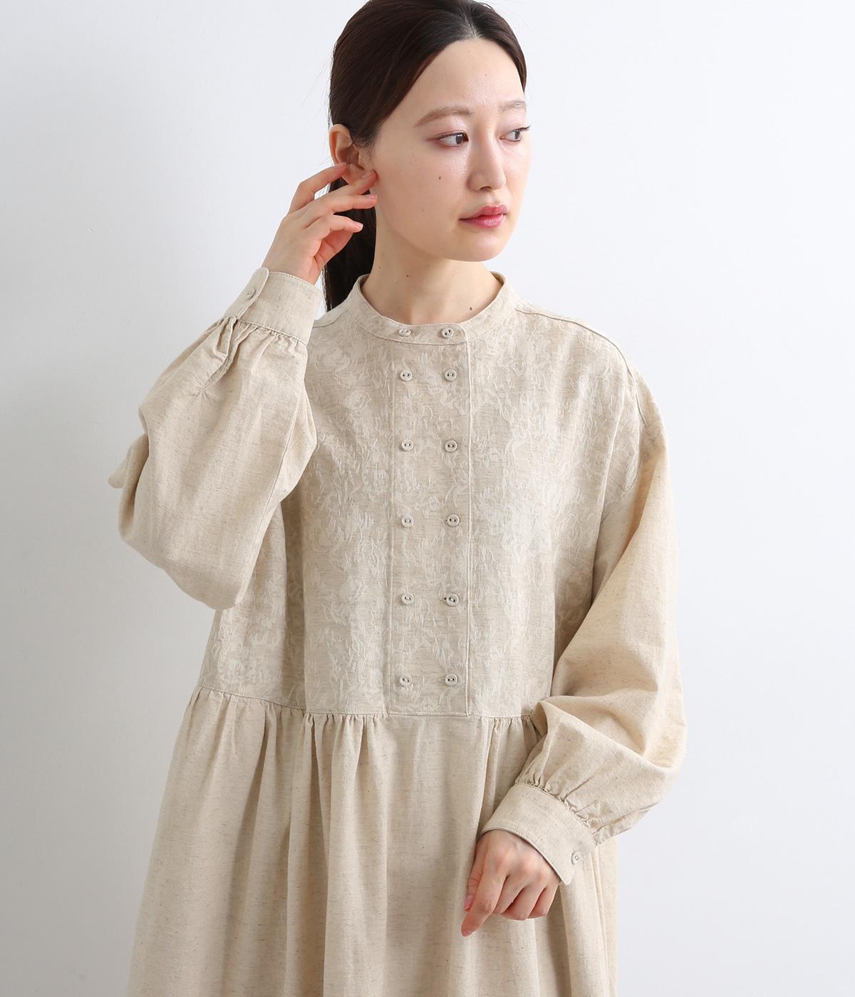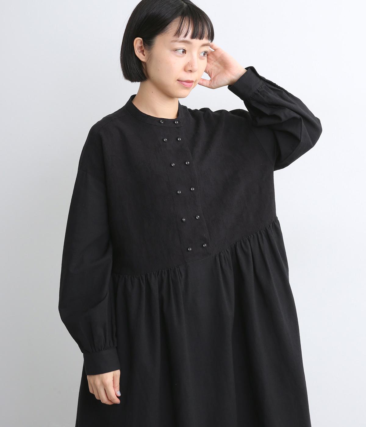 エレガントでシックな雰囲気のダブルボタンワンピースです。上品な花柄ジャカードと、ほどよい肉感でさらっとした綿麻素材を前後の身頃で切り替えた贅沢な仕上がり。ダブルボタンは右側の3個目からフェイクボタンで脱ぎ着もイージーです。