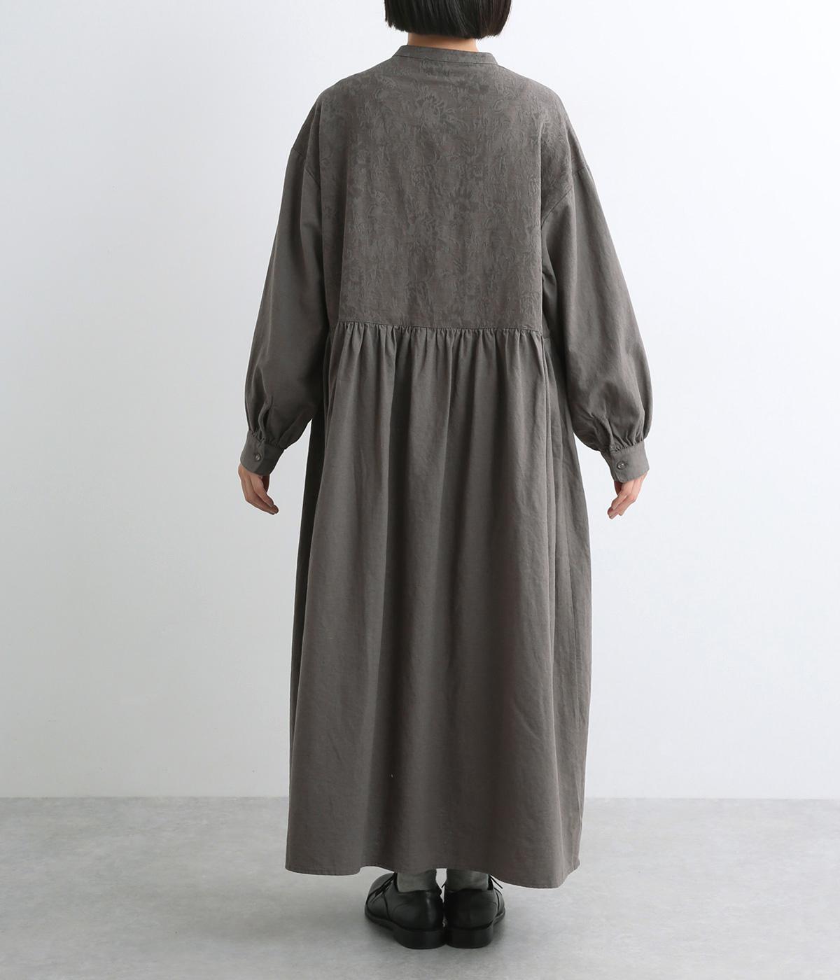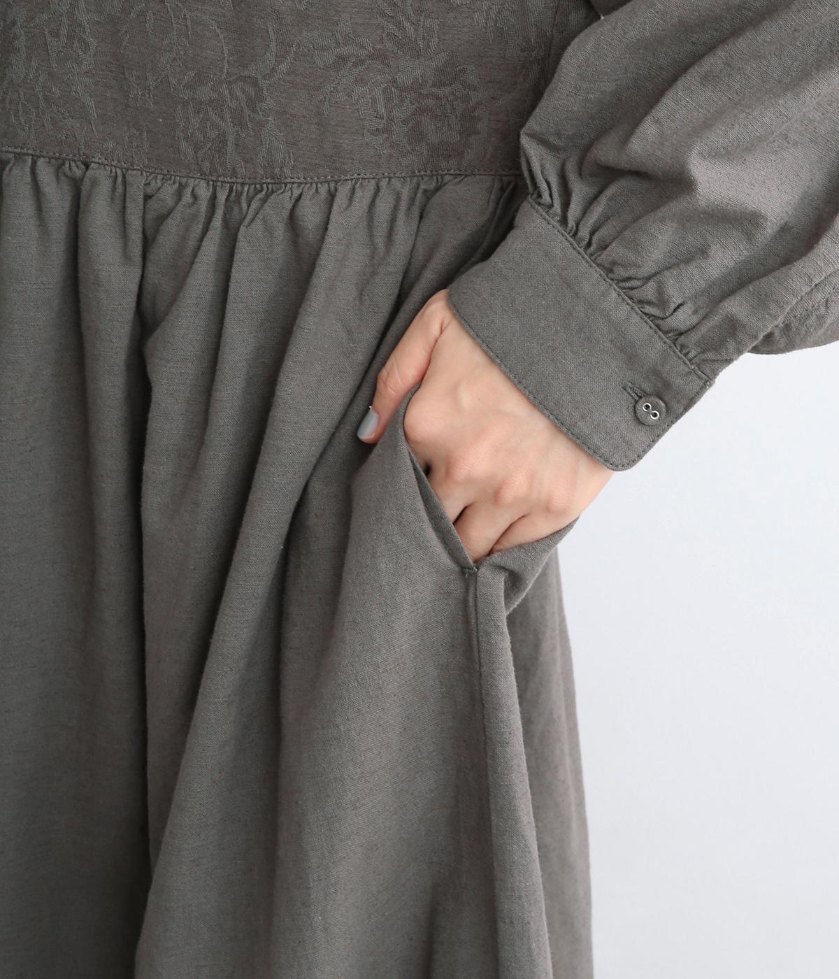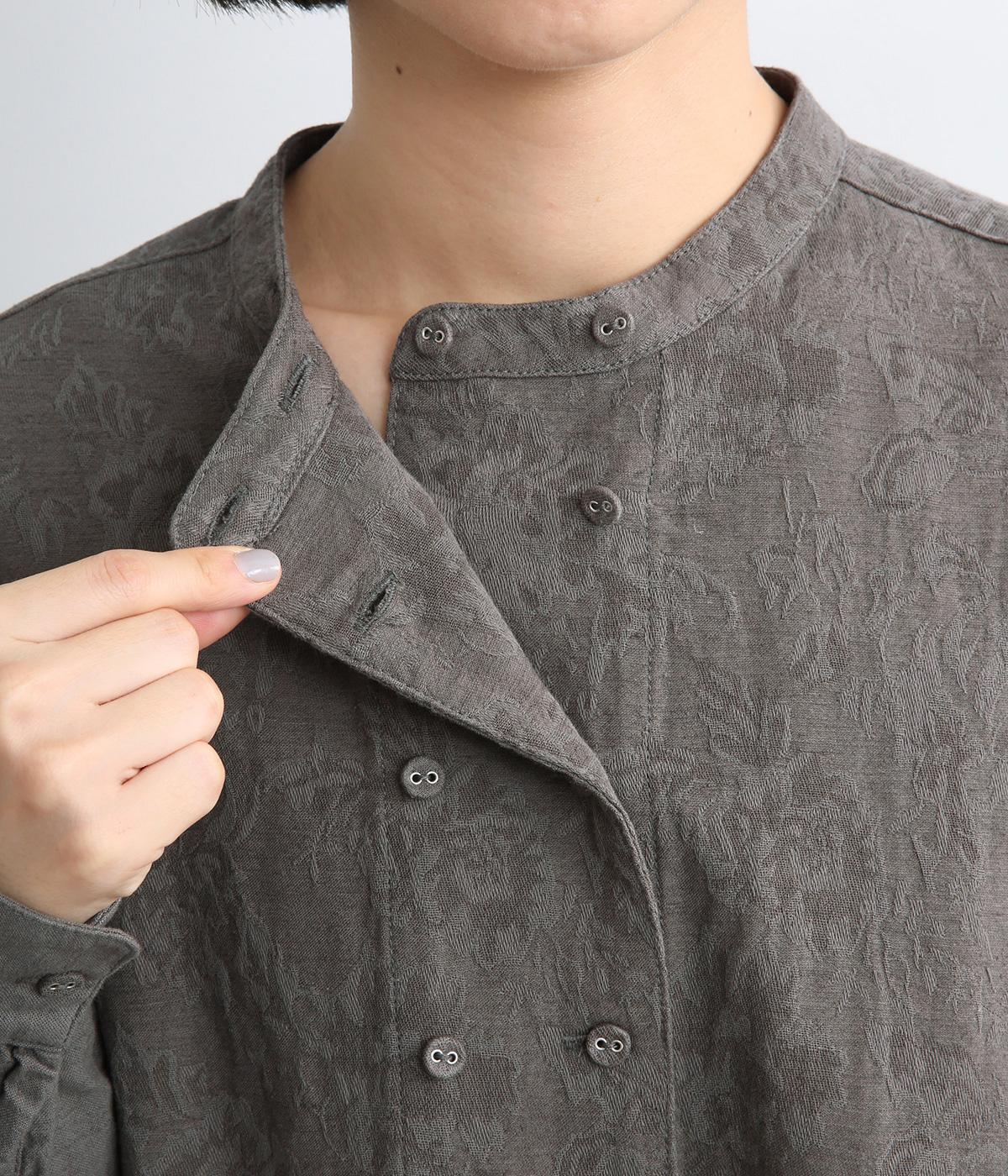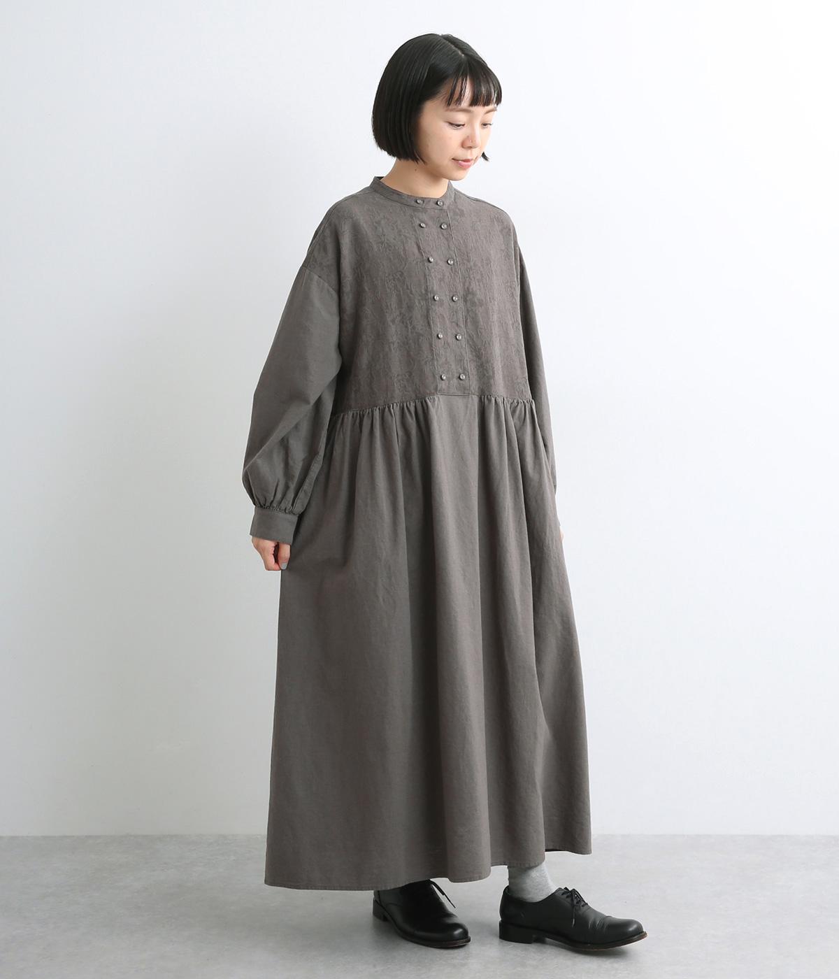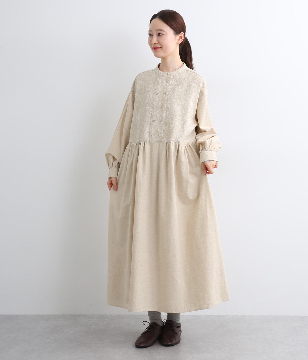 エレガントでシックな雰囲気のダブルボタンワンピースです。上品な花柄ジャカードと、ほどよい肉感でさらっとした綿麻素材を前後の身頃で切り替えた贅沢な仕上がり。ダブルボタンは右側の3個目からフェイクボタンで脱ぎ着もイージーです。
