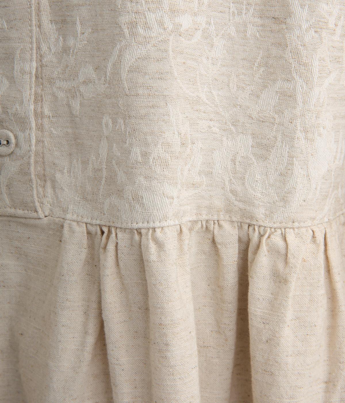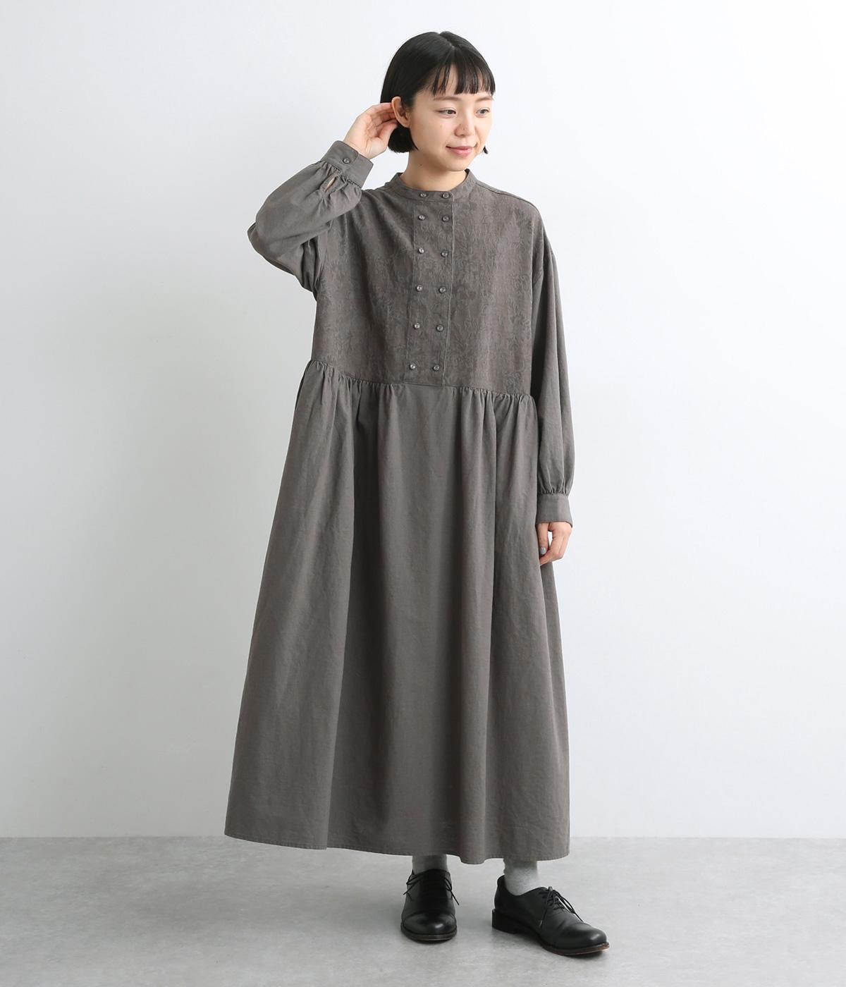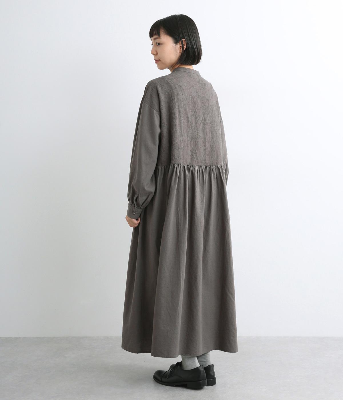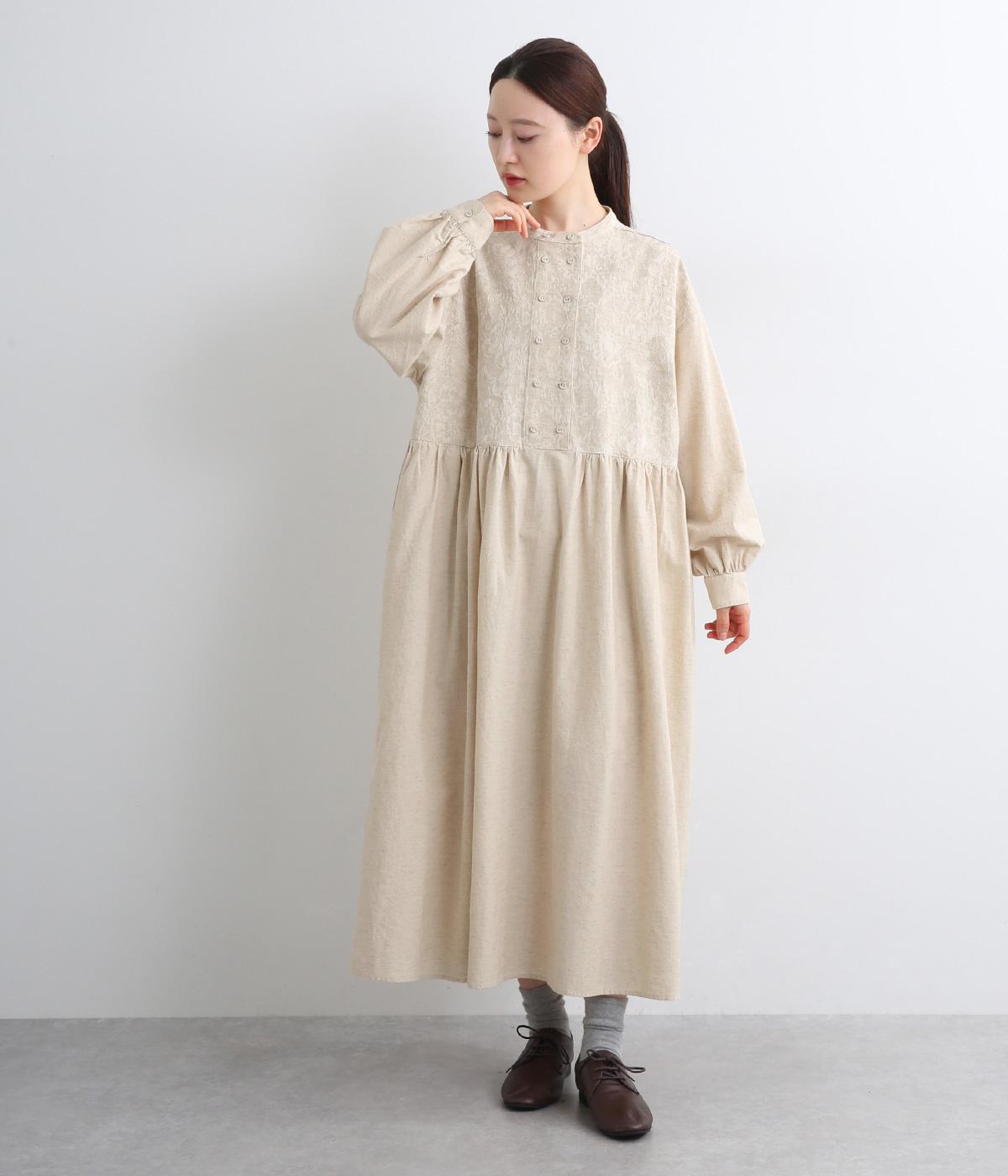 エレガントでシックな雰囲気のダブルボタンワンピースです。上品な花柄ジャカードと、ほどよい肉感でさらっとした綿麻素材を前後の身頃で切り替えた贅沢な仕上がり。ダブルボタンは右側の3個目からフェイクボタンで脱ぎ着もイージーです。