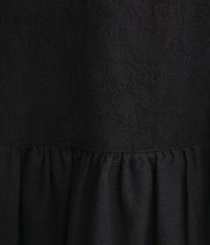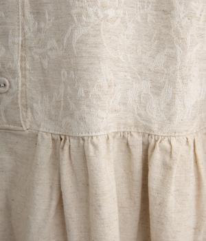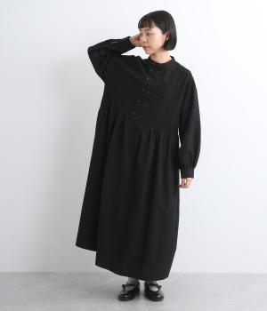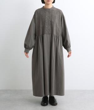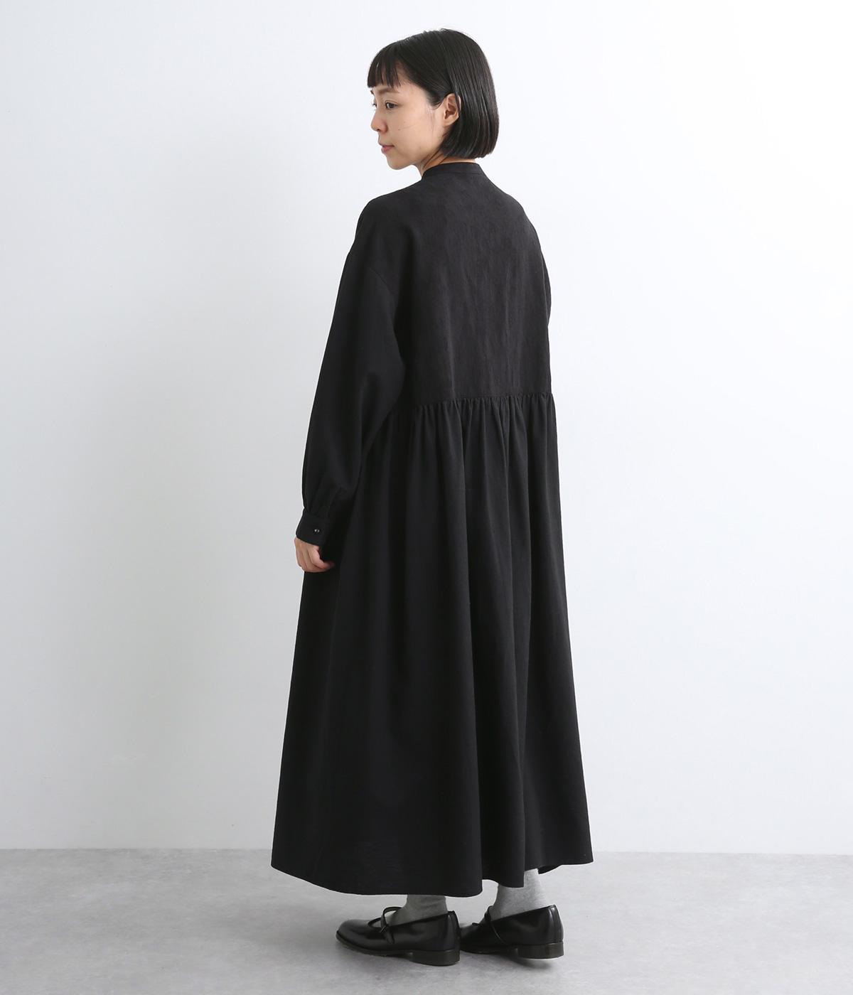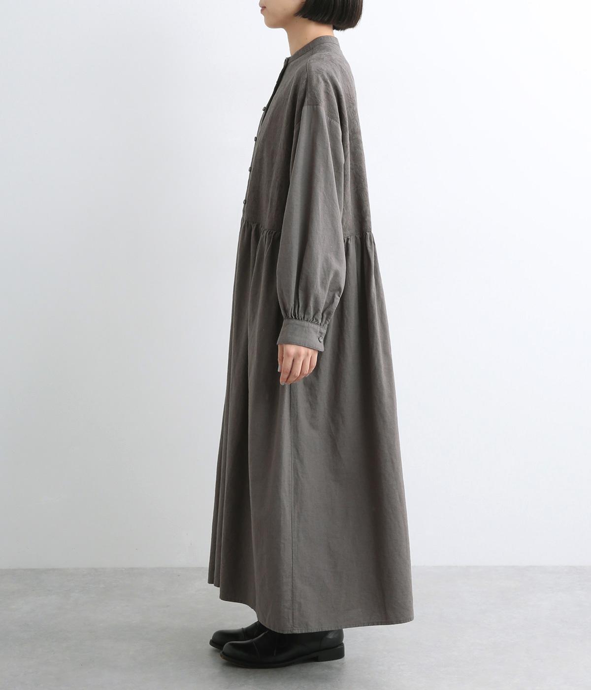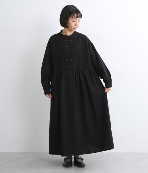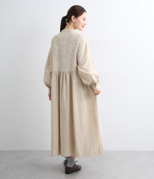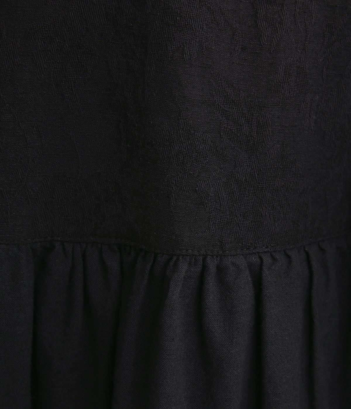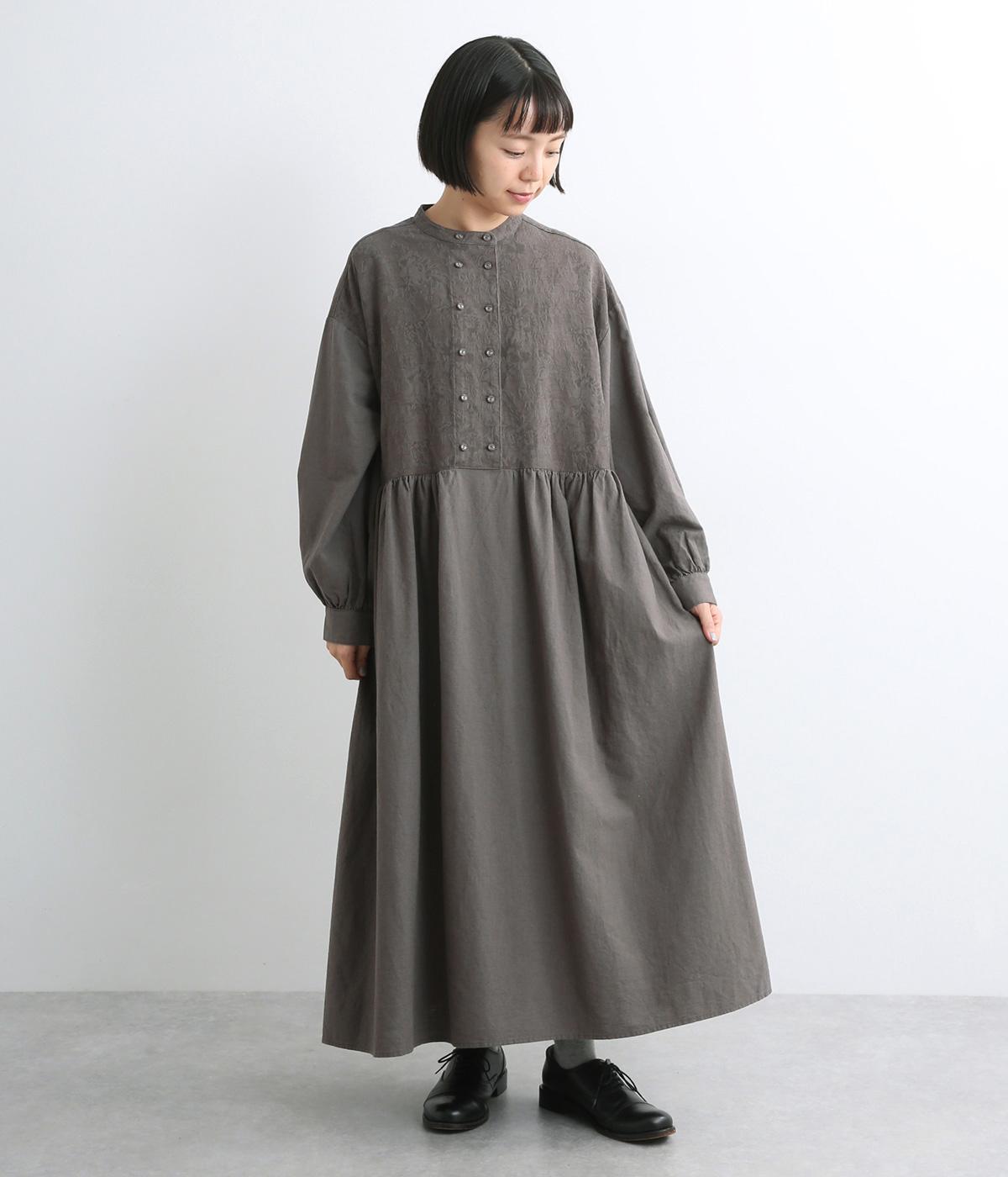 エレガントでシックな雰囲気のダブルボタンワンピースです。上品な花柄ジャカードと、ほどよい肉感でさらっとした綿麻素材を前後の身頃で切り替えた贅沢な仕上がり。ダブルボタンは右側の3個目からフェイクボタンで脱ぎ着もイージーです。