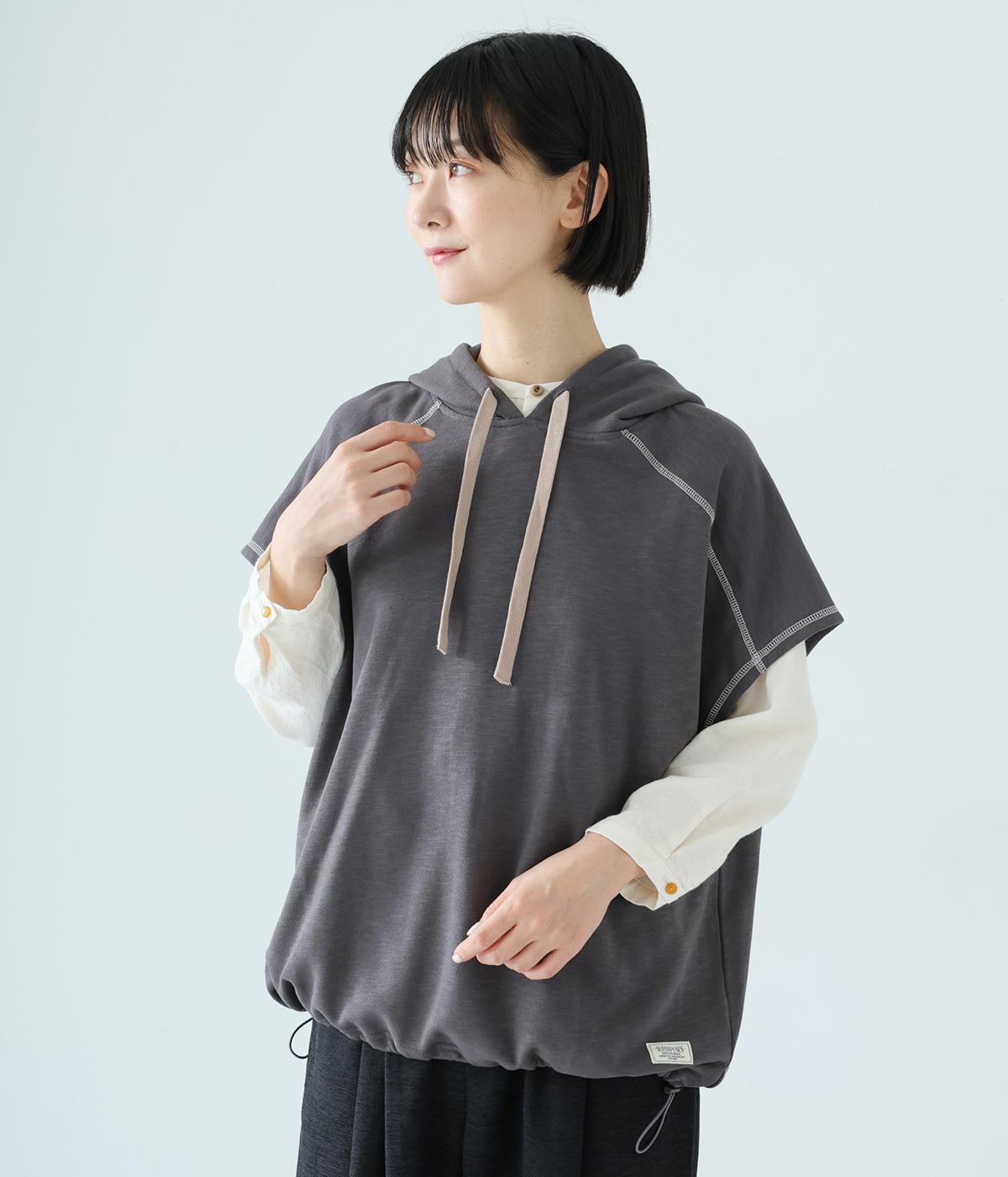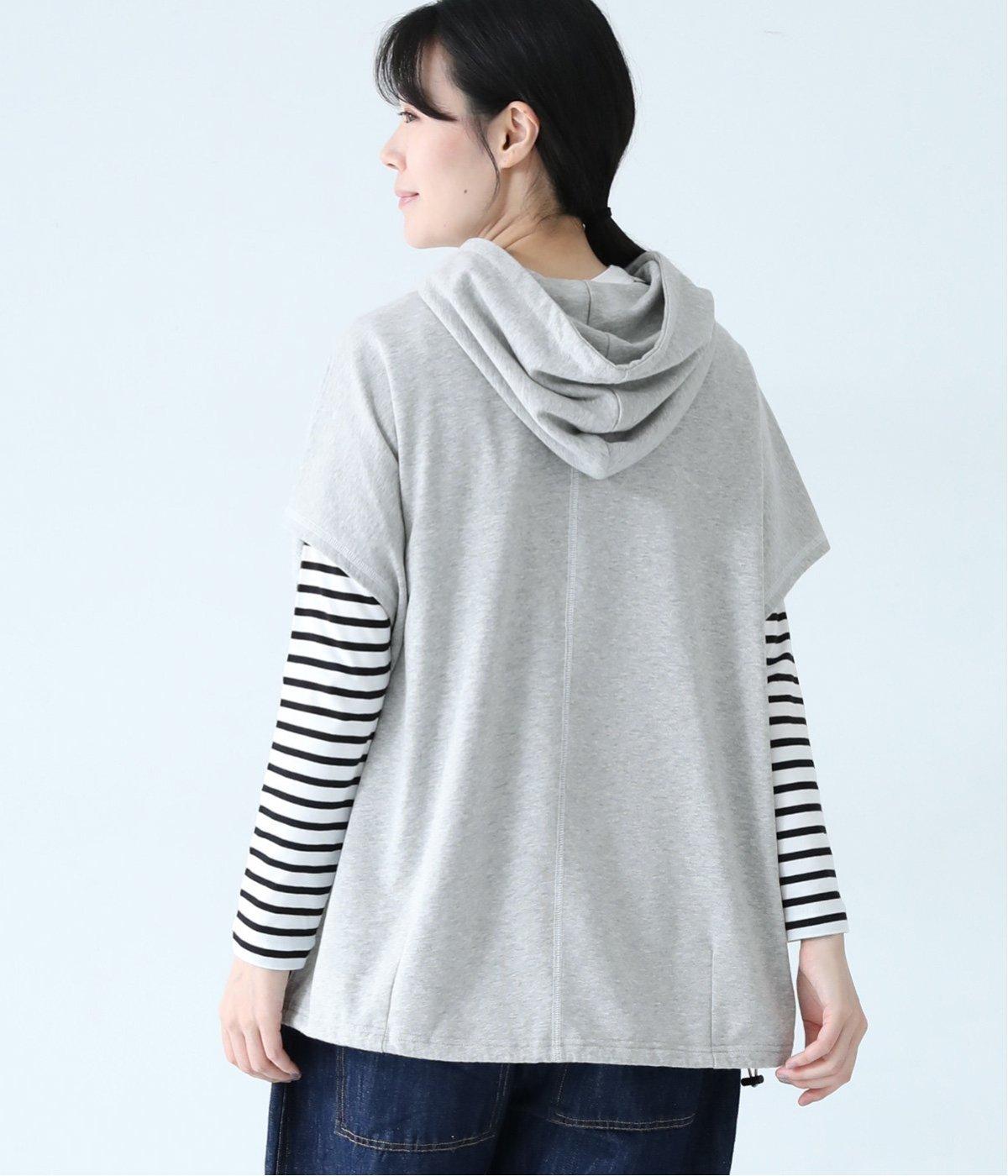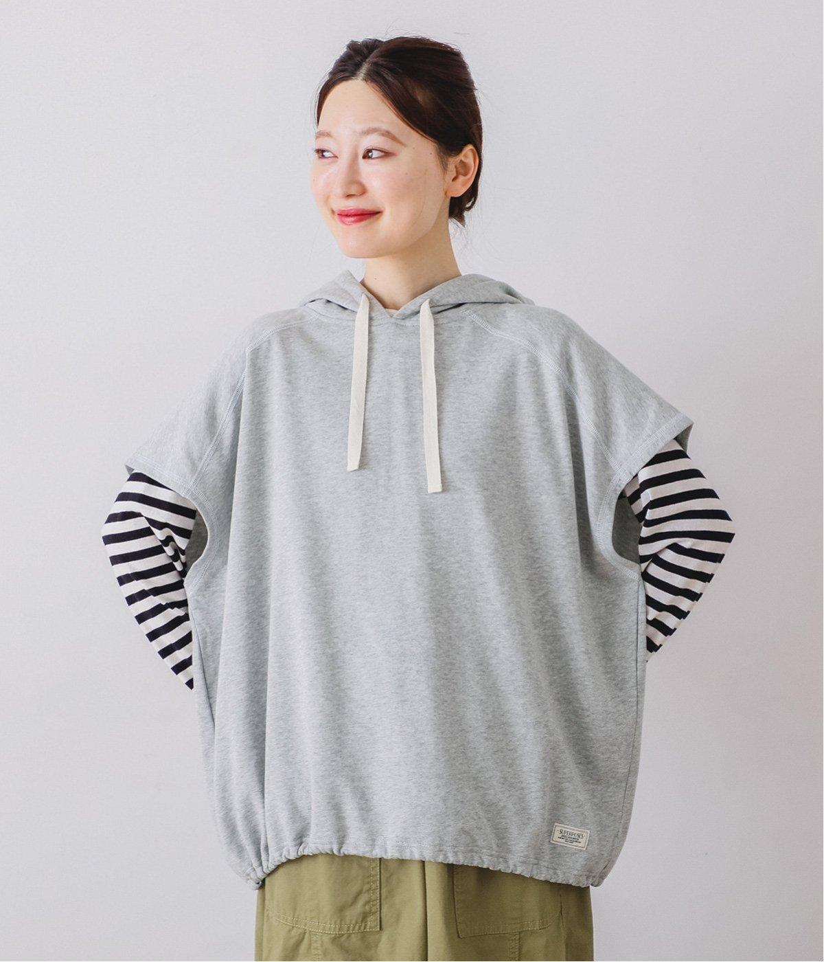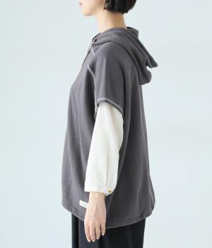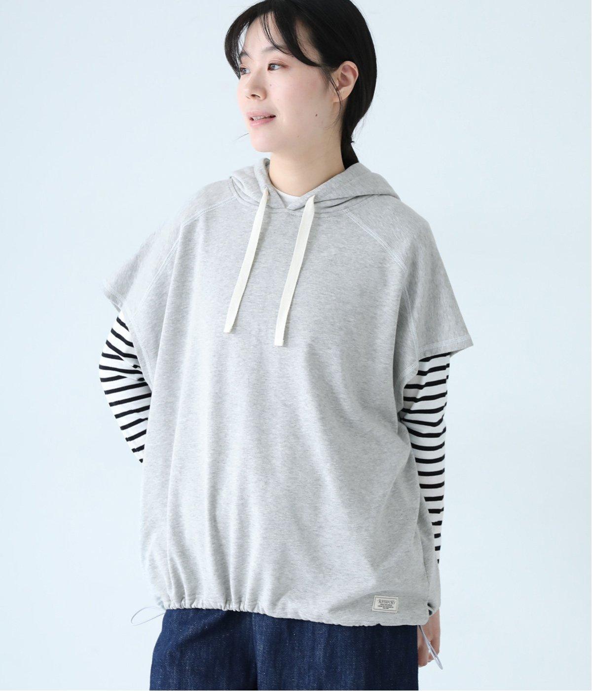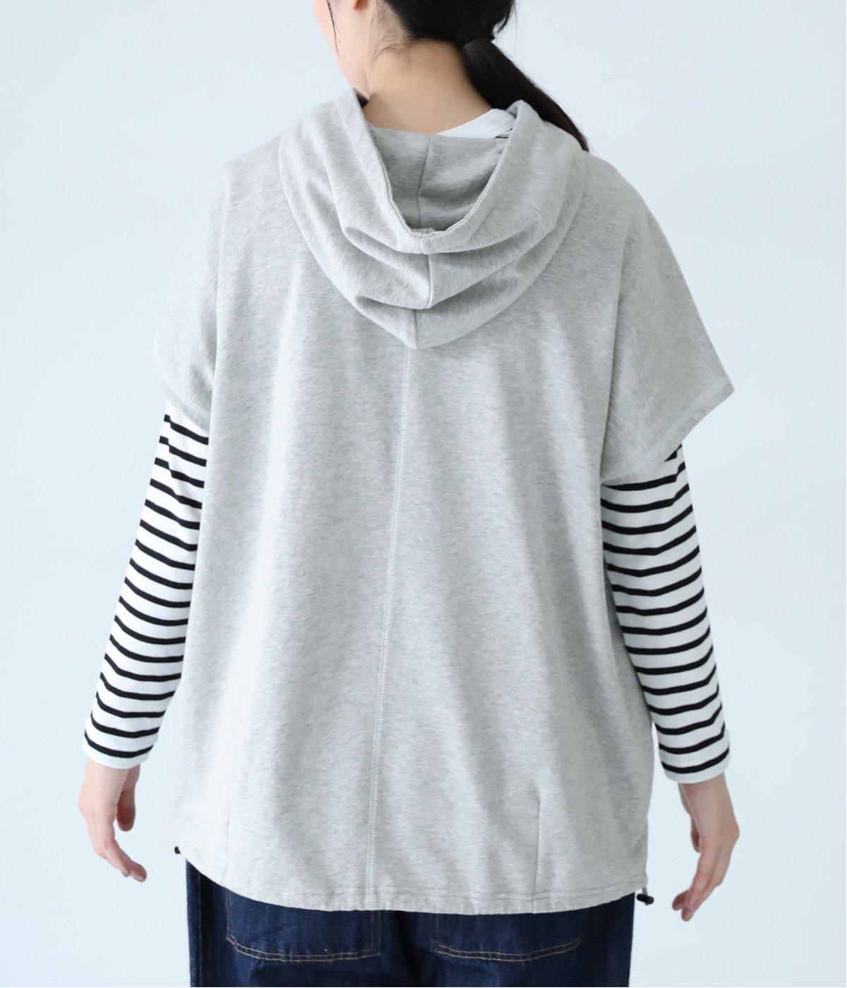 フードを大きめにデザインした裏毛ベスト。アームホールを広めにしているので、気になる二の腕をすっきりと見せてくれます。裾にはシルエットをアレンジできるドローコードつき。夏は一枚で、肌寒くなったら長袖をインナーに合わせてロングシーズンさまざまなおしゃれをたのしめるアイテムです。