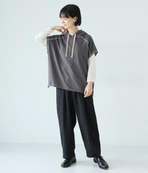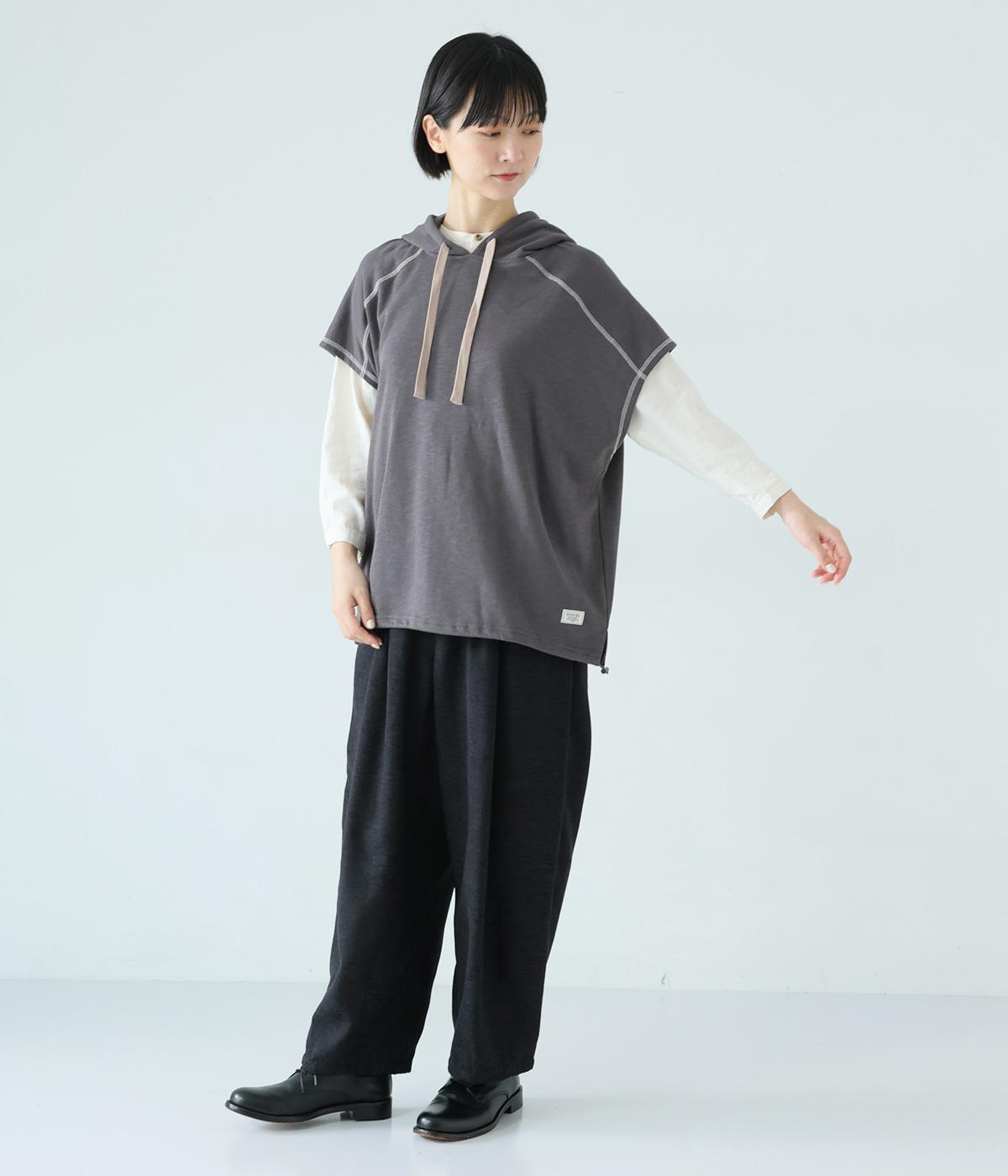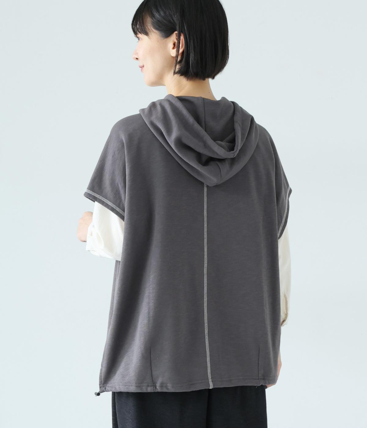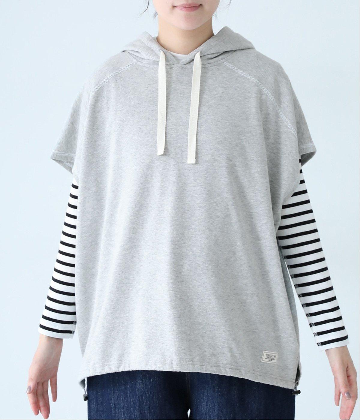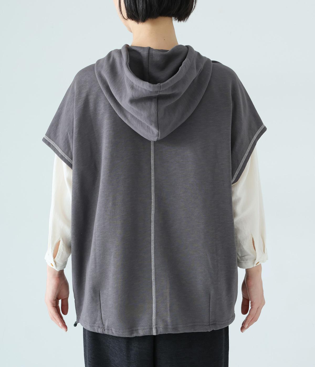 フードを大きめにデザインした裏毛ベスト。アームホールを広めにしているので、気になる二の腕をすっきりと見せてくれます。裾にはシルエットをアレンジできるドローコードつき。夏は一枚で、肌寒くなったら長袖をインナーに合わせてロングシーズンさまざまなおしゃれをたのしめるアイテムです。