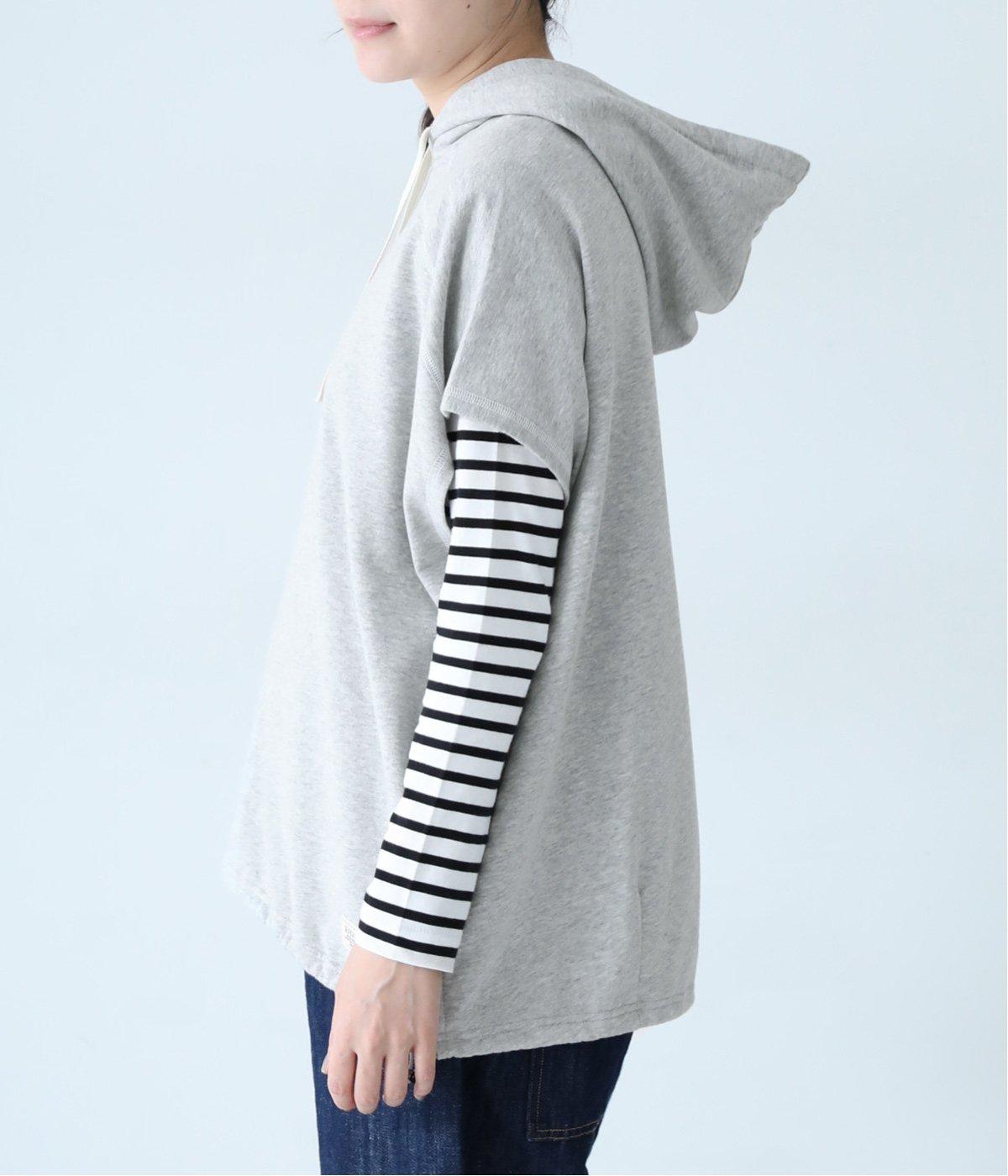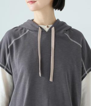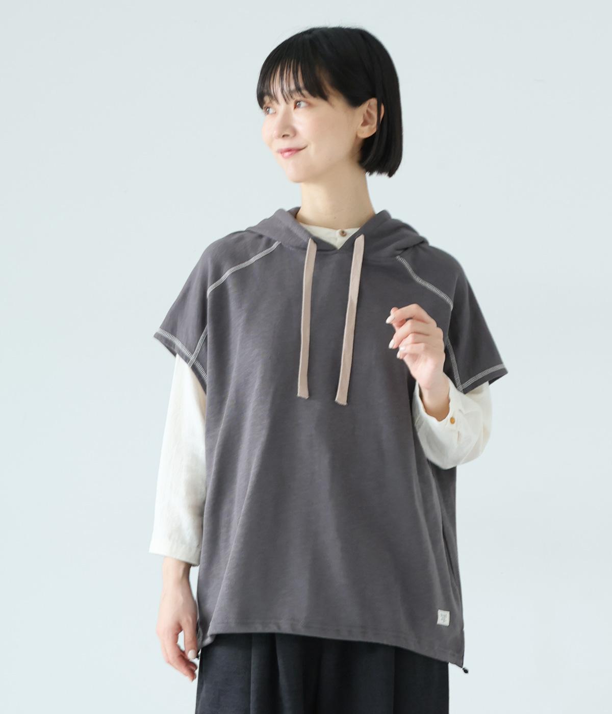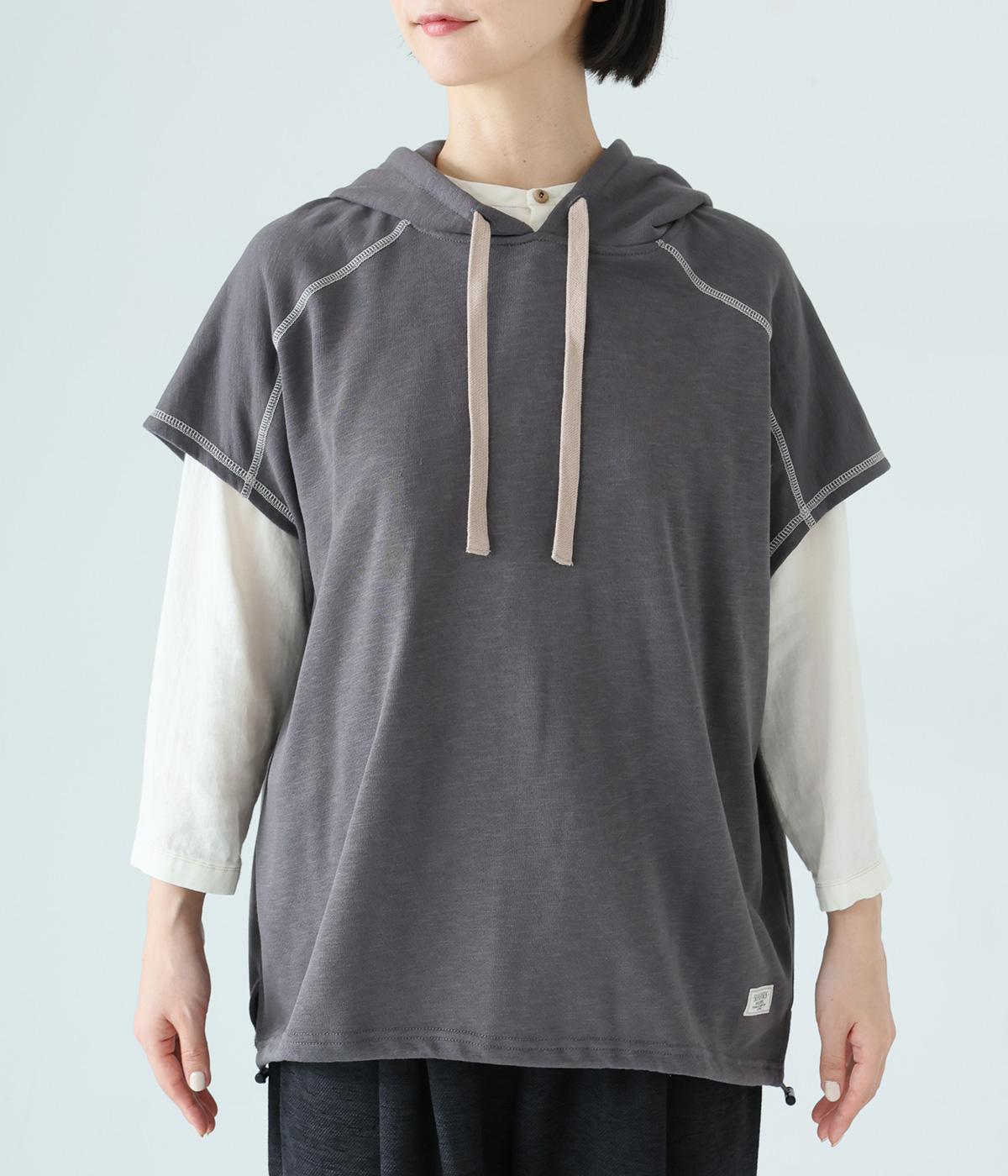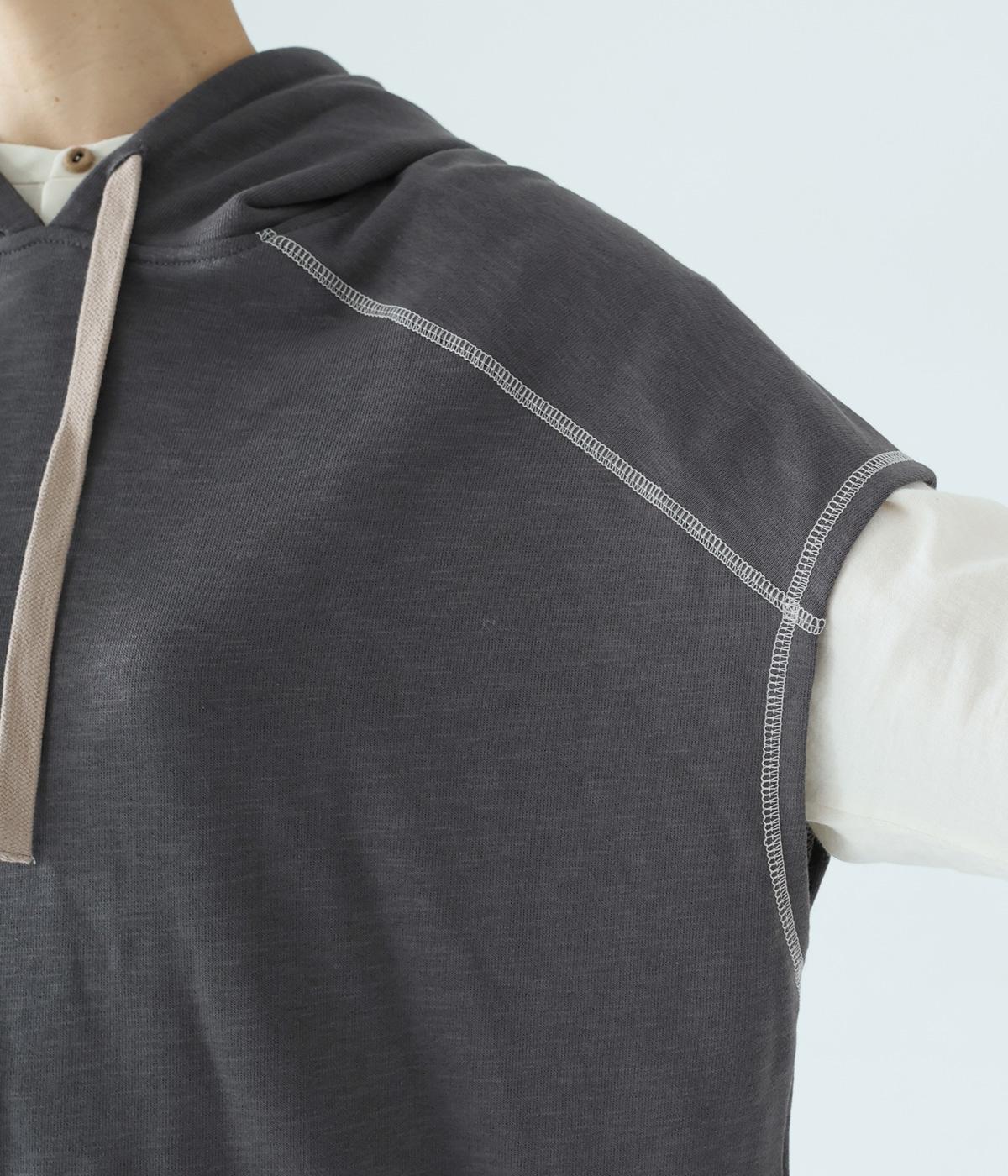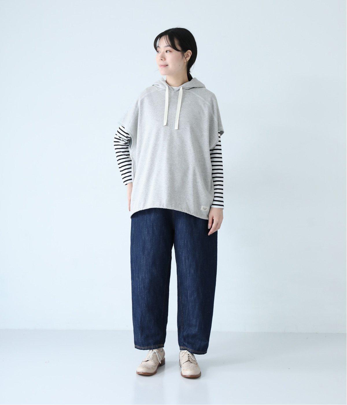 フードを大きめにデザインした裏毛ベスト。アームホールを広めにしているので、気になる二の腕をすっきりと見せてくれます。裾にはシルエットをアレンジできるドローコードつき。夏は一枚で、肌寒くなったら長袖をインナーに合わせてロングシーズンさまざまなおしゃれをたのしめるアイテムです。