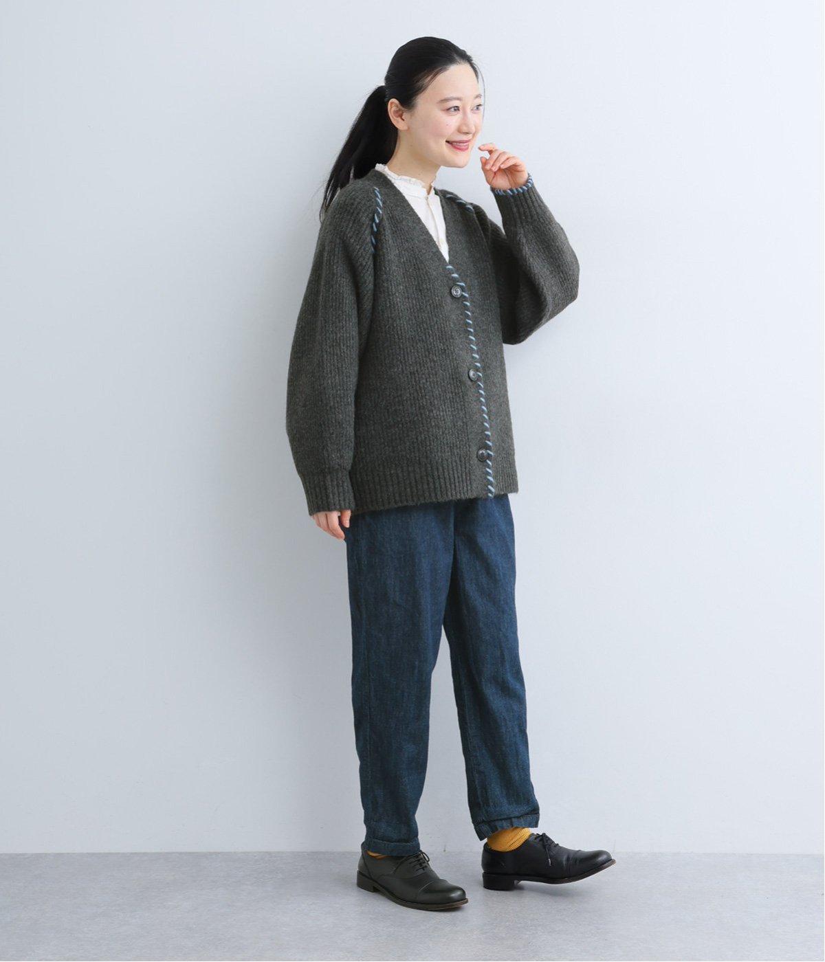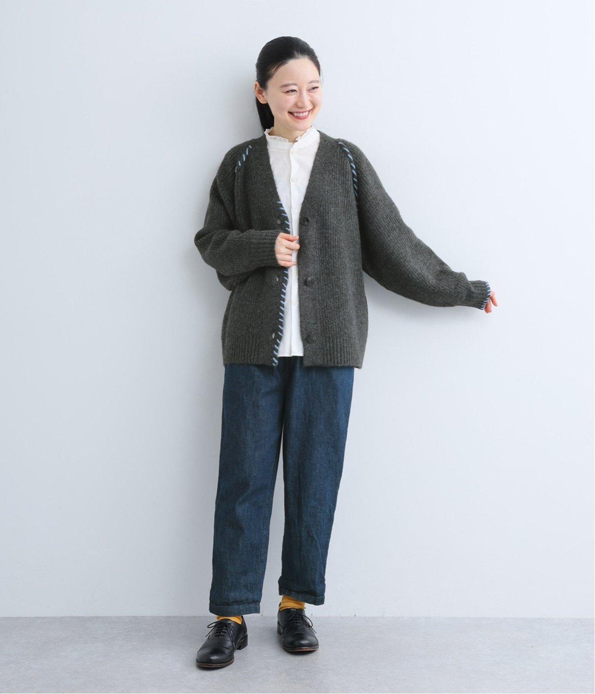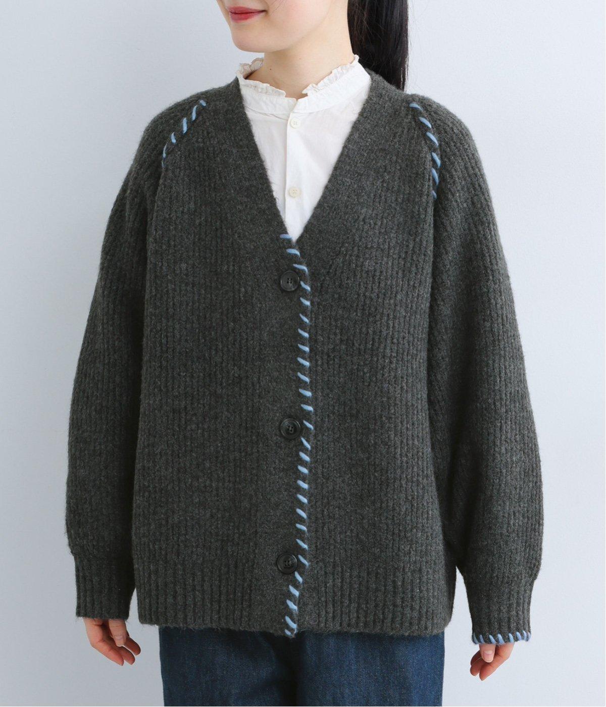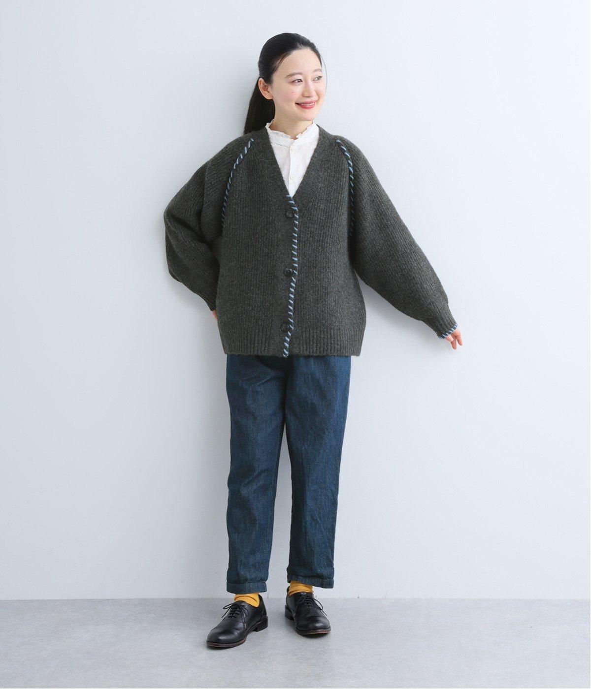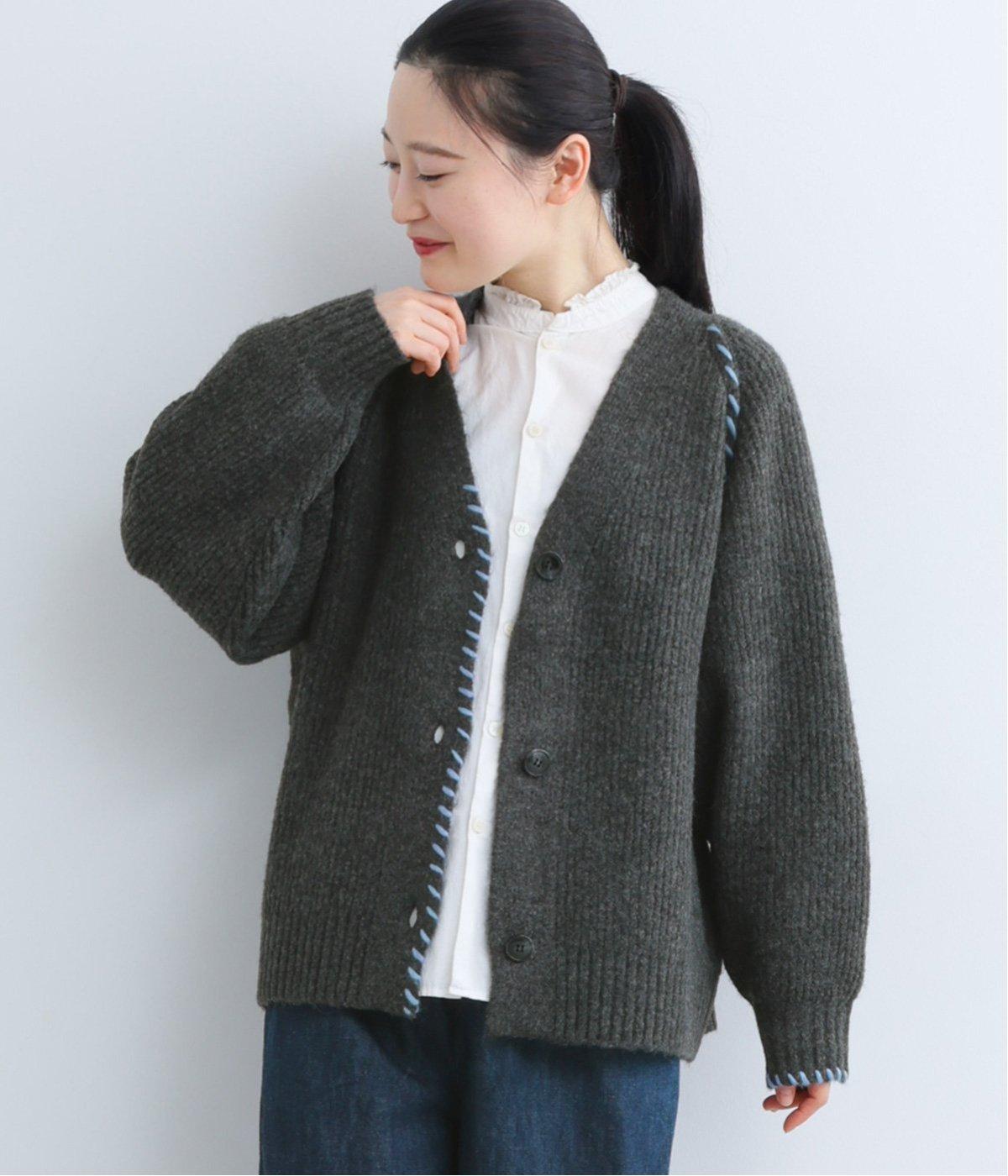 配色ステッチをきかせた大人かわいいカーディガン。あえて左のみステッチを入れた袖口がさりげない遊び心を感じさせます。シルエットは全体にゆとりを持たせ、装いを選ばず羽織りやすいのが◎。深めのVネックは顔まわりをすっきりと見せてくれます。