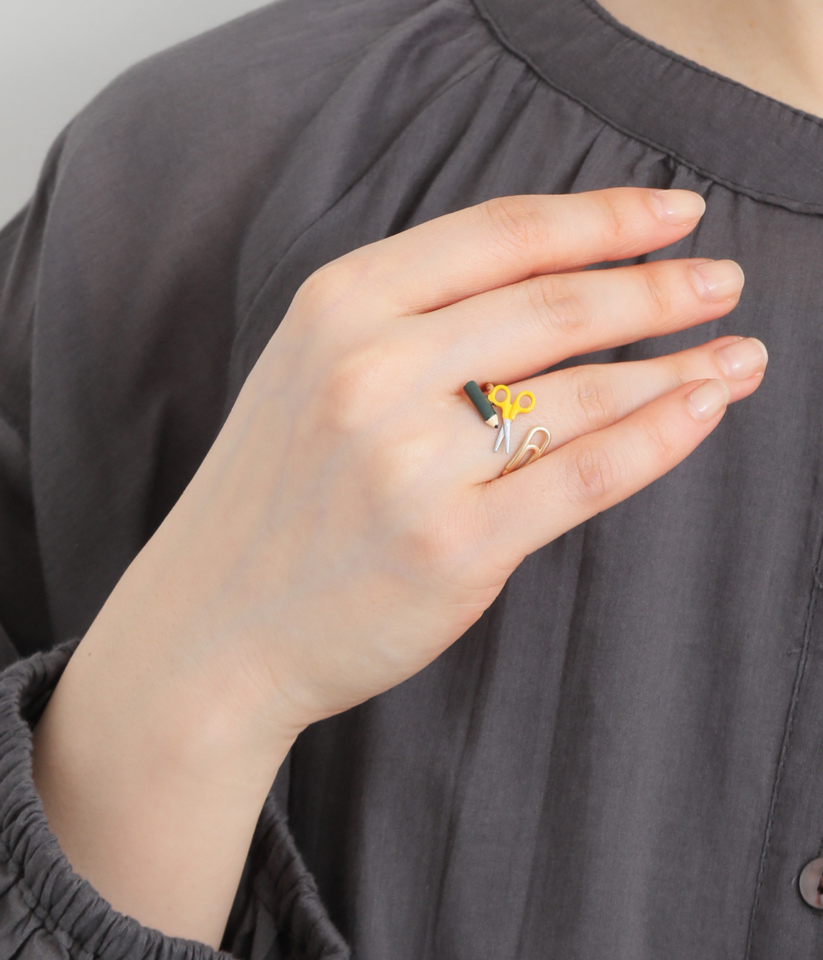 シンプルな鉛筆やレトロなハサミ、ふつうのクリップ、昔ながらの文具たちが仲良くならんだモチーフ使いが他にはないリングです。リング部分からクリップまでつながっているような、流れのいいデザインにも注目です。
