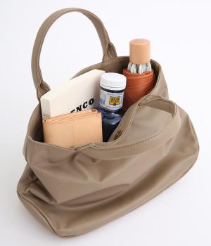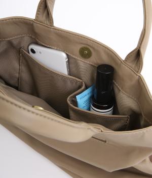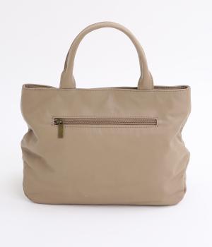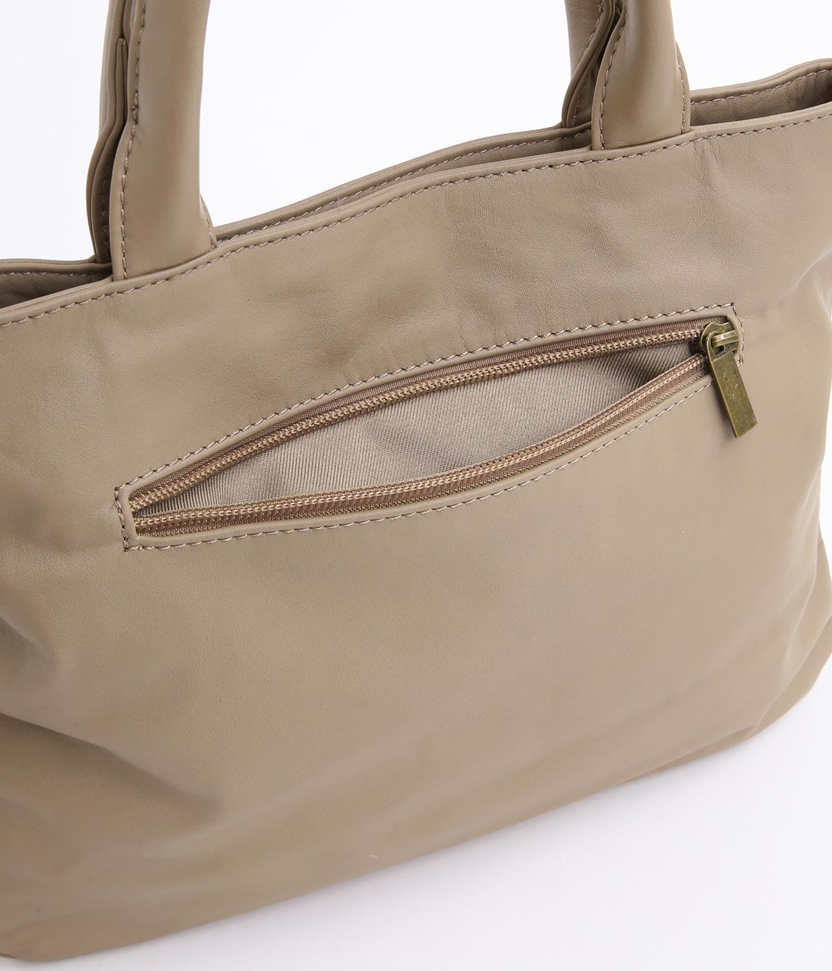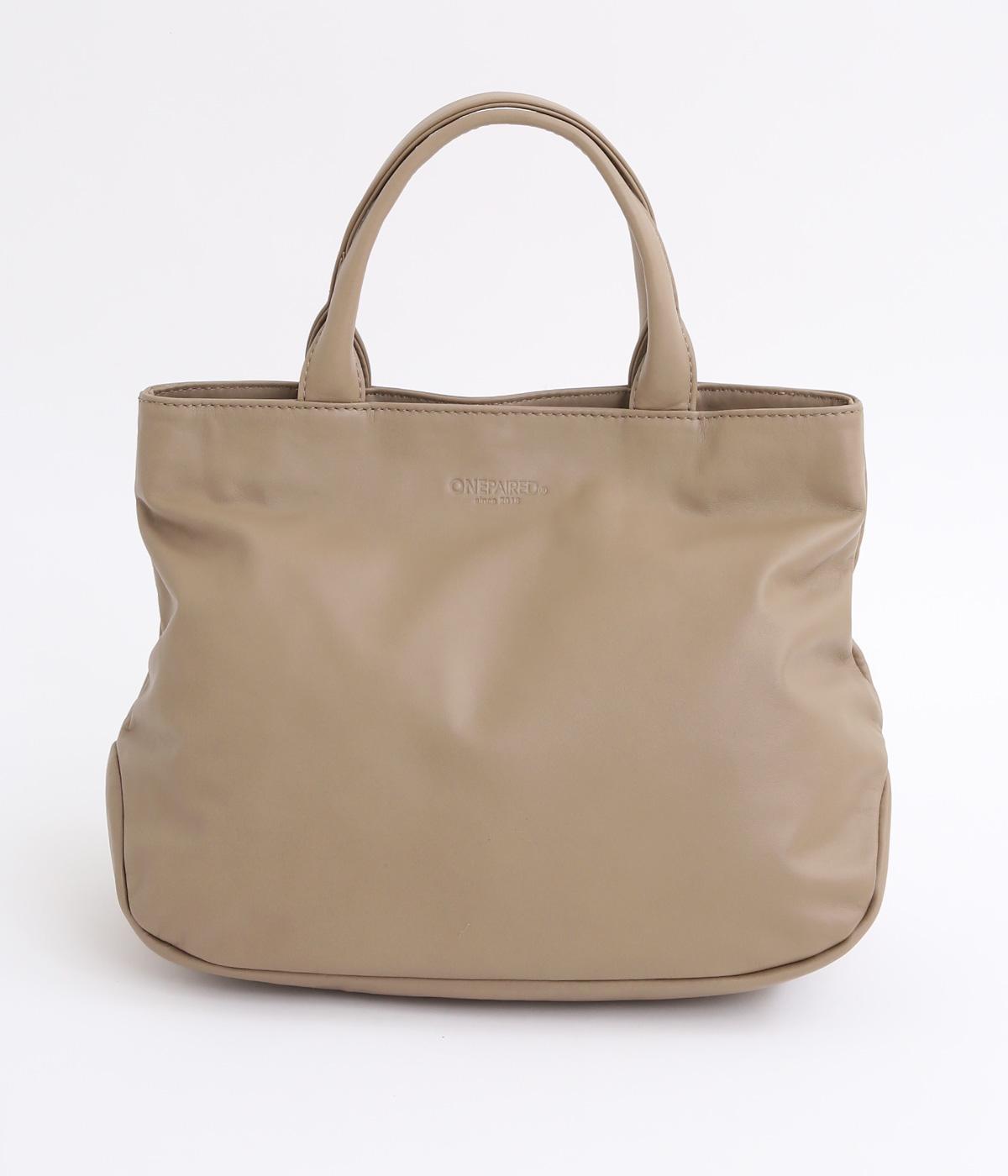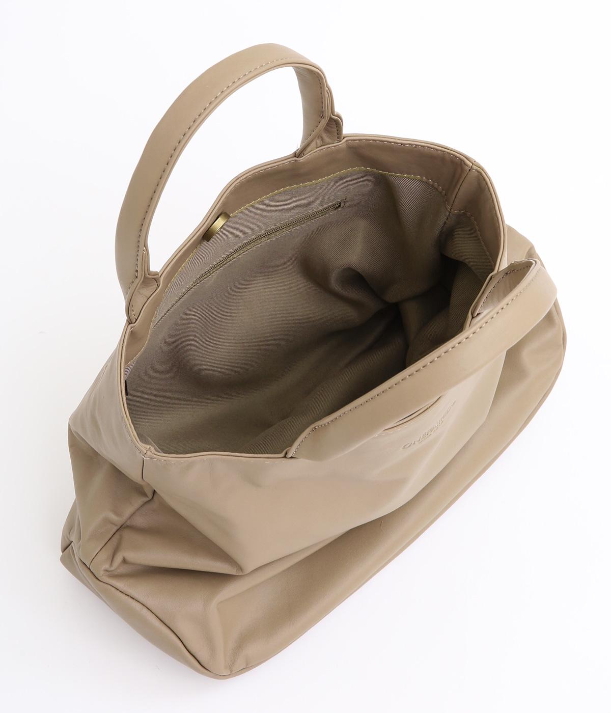 B5サイズ程度のやや小振りなボディながら、素材のやわらかさも相まってお出掛けの必需品がすっぽり収まるちょうどいいサイズ感。背面には小物の収納に便利なファスナーポケットつきで、正面のロゴ型押しが品のいいグッドポイントに。