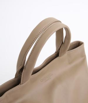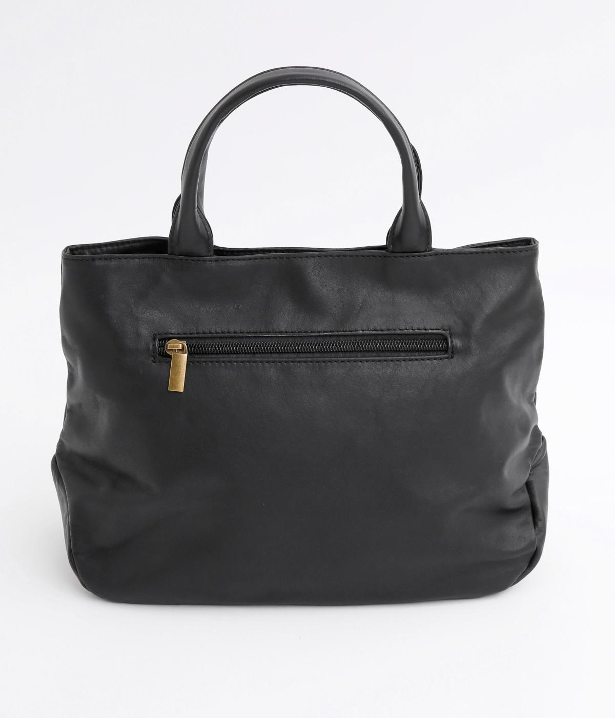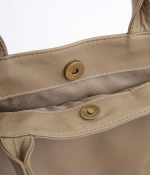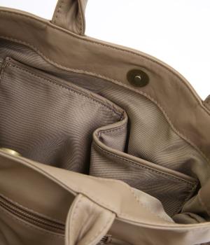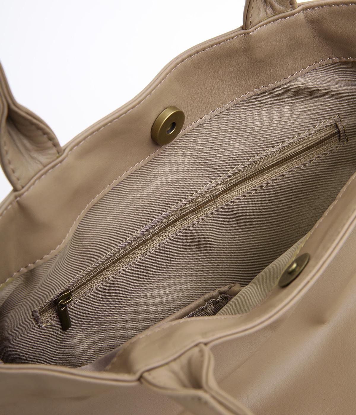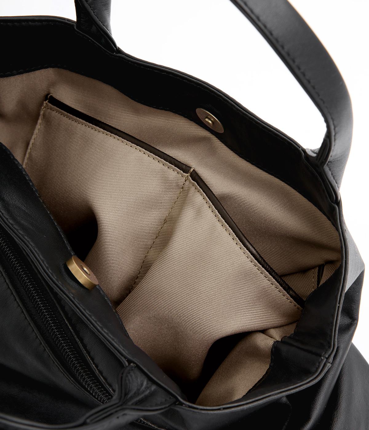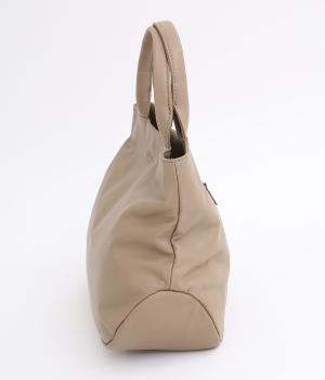 B5サイズ程度のやや小振りなボディながら、素材のやわらかさも相まってお出掛けの必需品がすっぽり収まるちょうどいいサイズ感。背面には小物の収納に便利なファスナーポケットつきで、正面のロゴ型押しが品のいいグッドポイントに。
