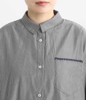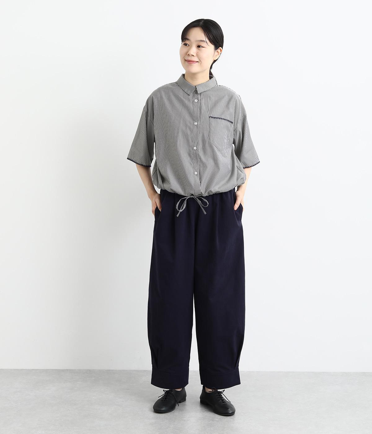 ワイドなボトムともバランスのいいクロップド丈のシャツ。レギュラーカラーできちんと感があり、こなれた印象を演出します。袖口とポケット口のはまぐり刺しゅうがアクセント。裾のヒモを絞ってバルーンシルエットにアレンジするのもおすすめです。