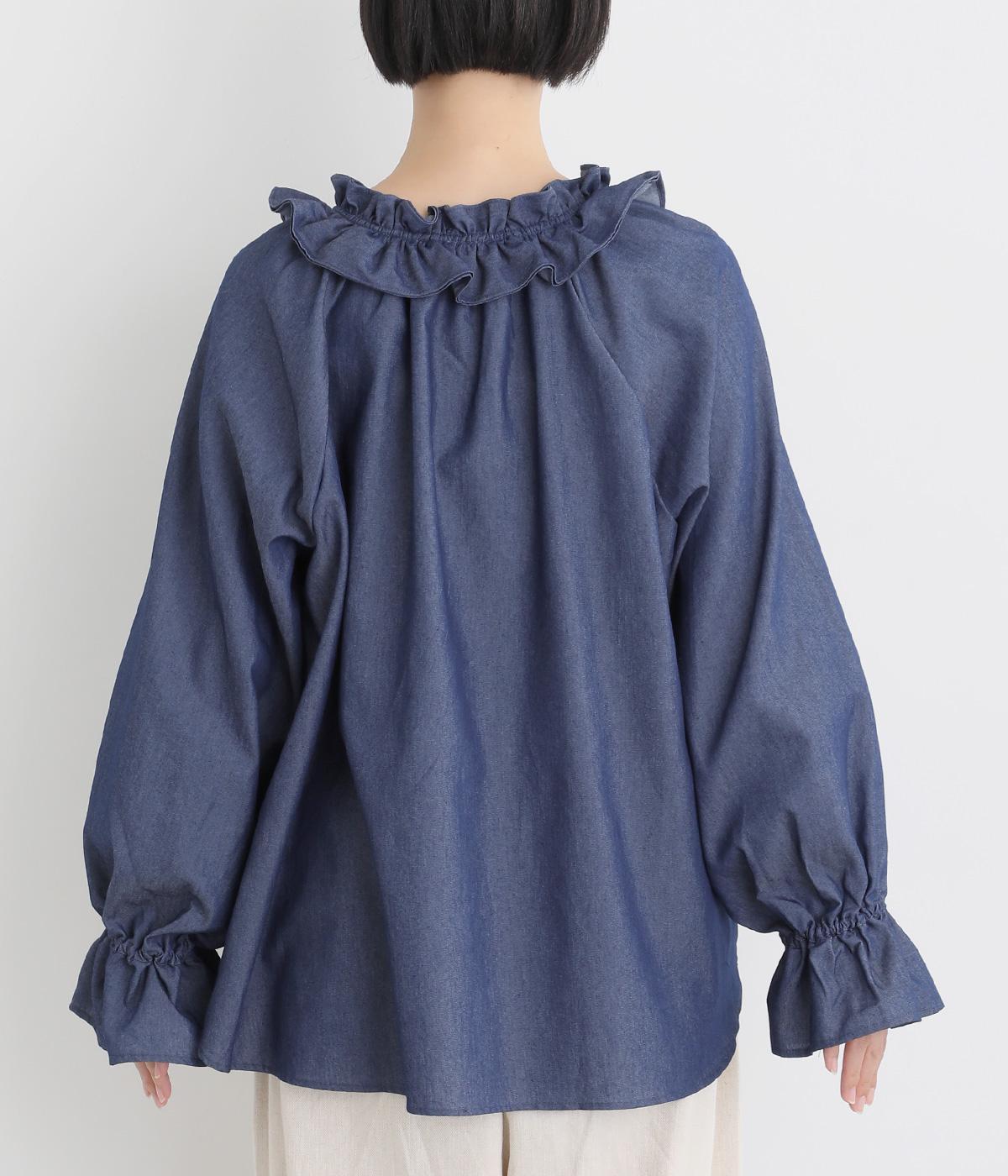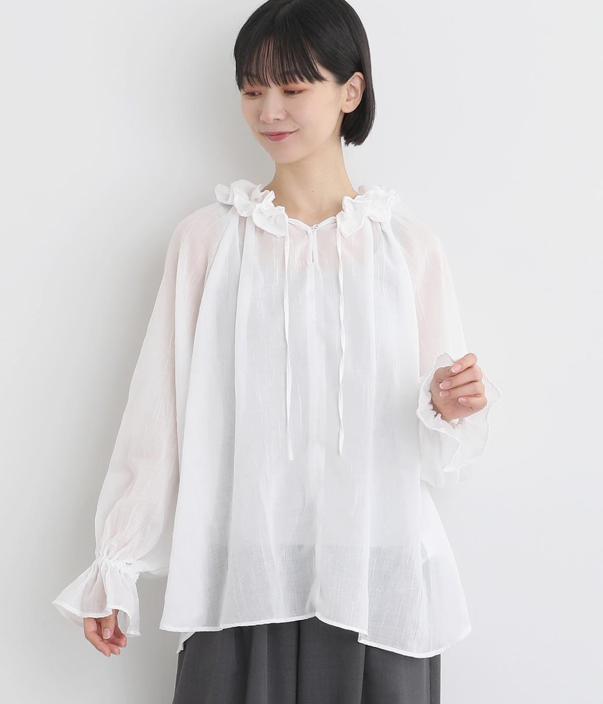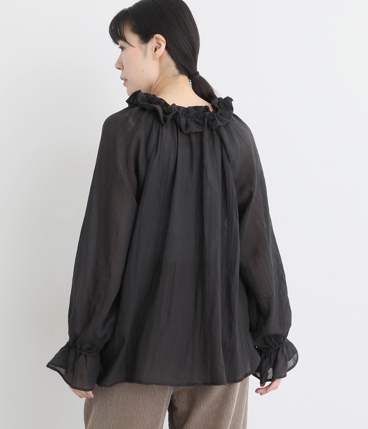 襟元や袖口のフリルデザインが印象的で着映え力のある一枚。襟は2枚重ねでボリューム感を出しています。ボタンをあけてスキッパーネックにすればこなれた雰囲気に。寒い季節はタートルネックのインナーを合わせたり着まわし力も◎。