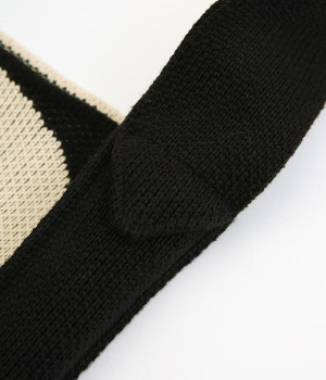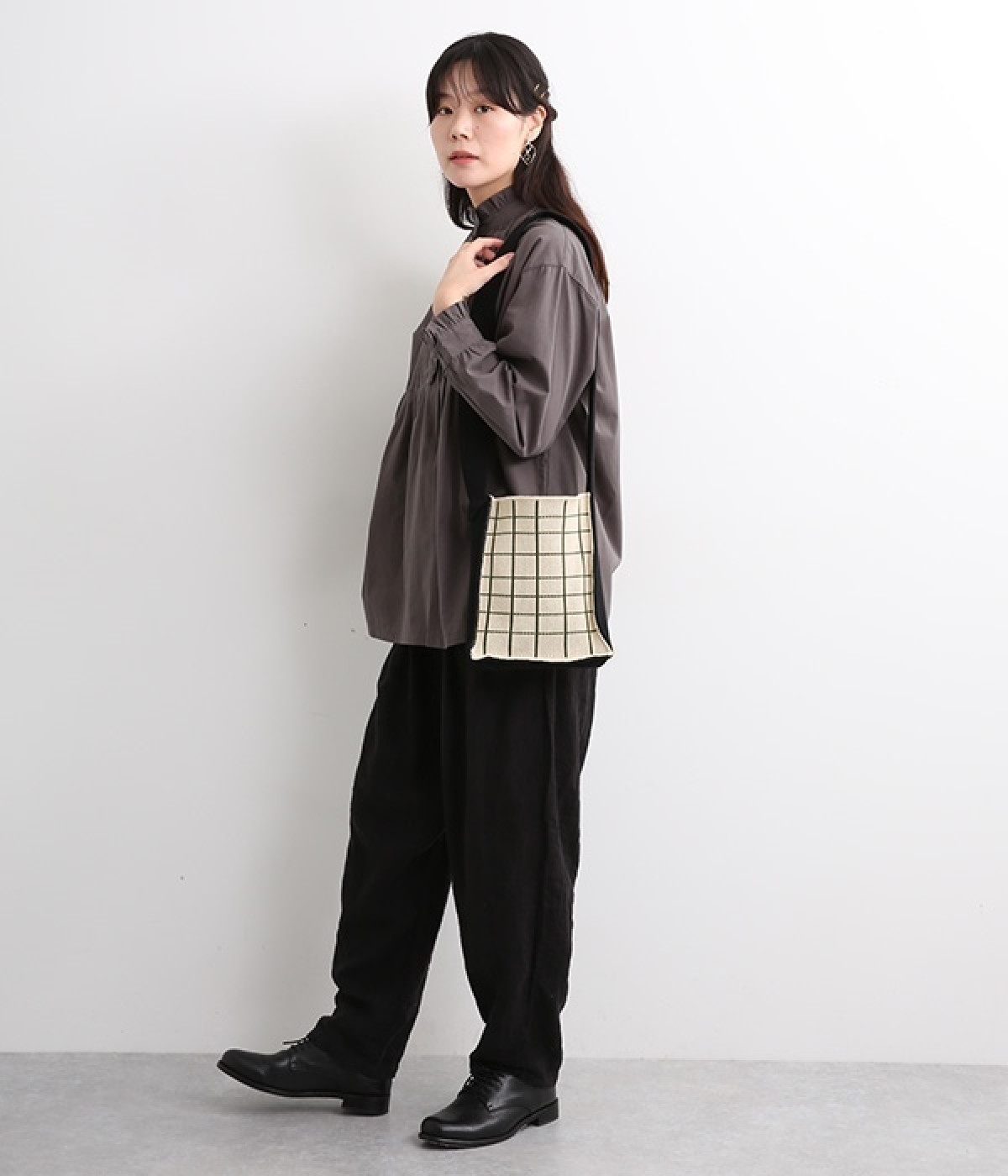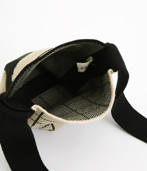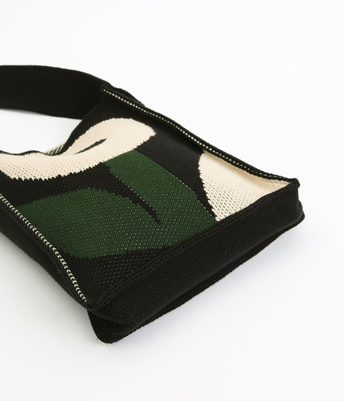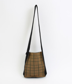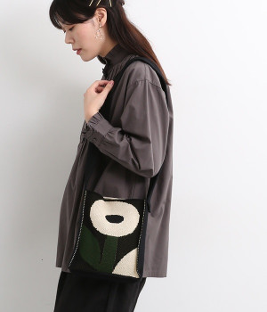 綿糸を度詰めして編み立てたジャガード柄のニットショルダーバッグです。コンパクトながらも財布や携帯電話など貴重品が収納できる、丁度良いサイズに仕上げました。表面は幾何学模様のような花柄、裏面はチェック柄。気分に合わせて表裏で使い分けすることができ、コーディネートのポイントになります。間口が開いているので出し入れがしやすく、小物の収納に適したマチがあります。収納部の高さは500mlのペットボトル程度です。