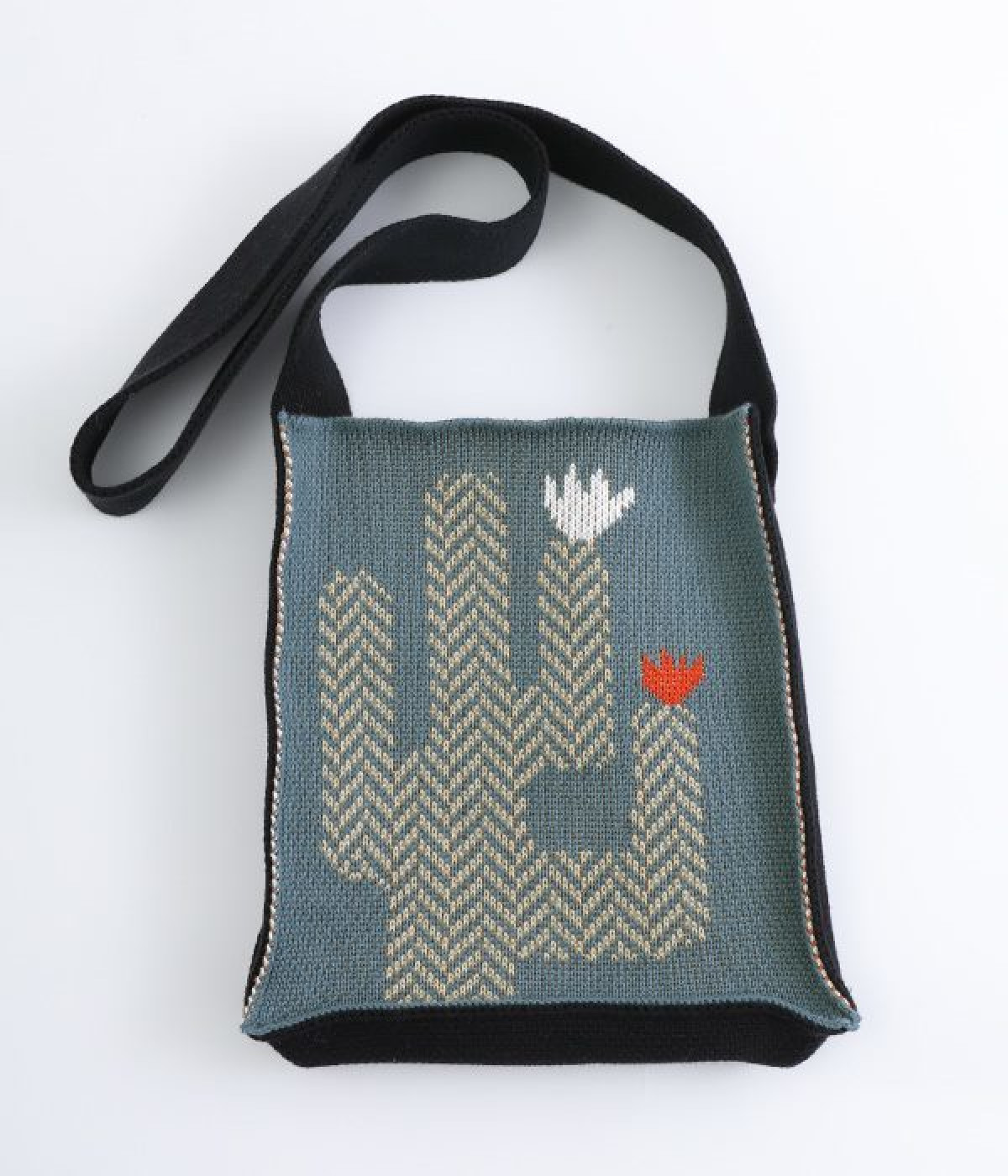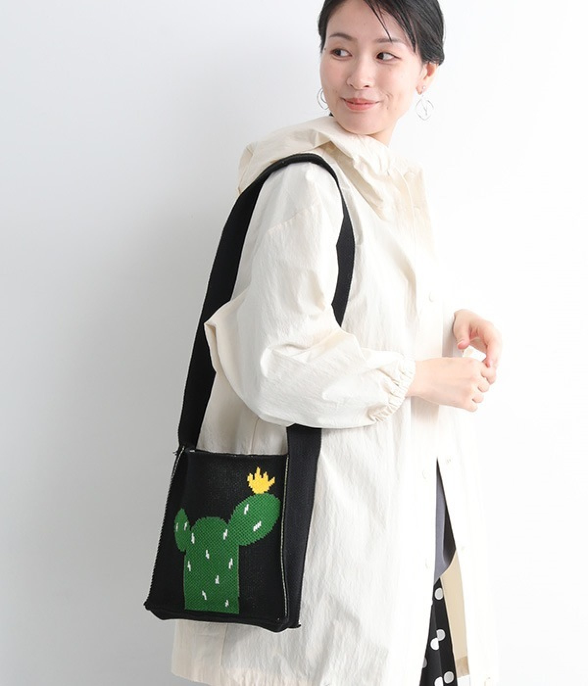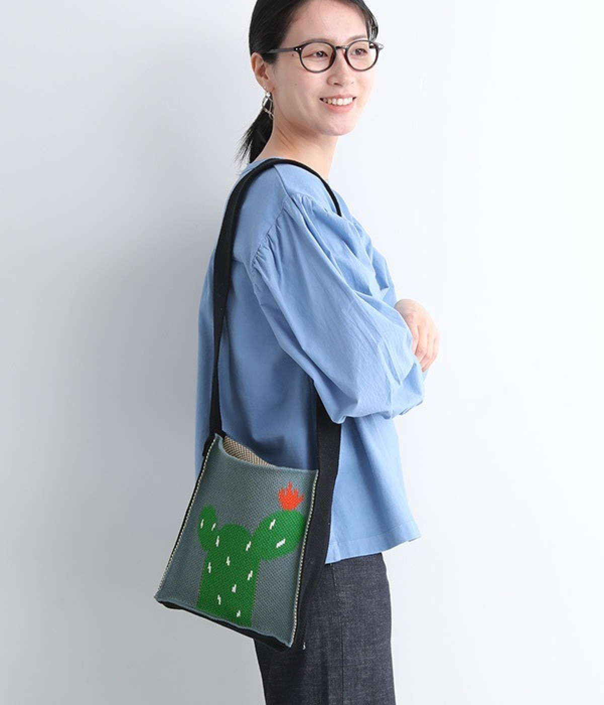 綿糸で度詰めに編み立てたジャカードニットのショルダーバッグです。財布や携帯電話などの必需品がおさまる、ちょうどいいサイズに仕上げました。肩に軽くかけられる、太めのワンショルダータイプ。裏表で異なるサボテンの柄があしらわれ、気分に合わせて使い分けができます。インパクトのあるモチーフが着こなしのアクセントになってくれます。