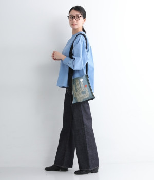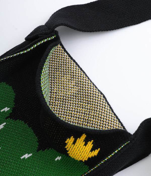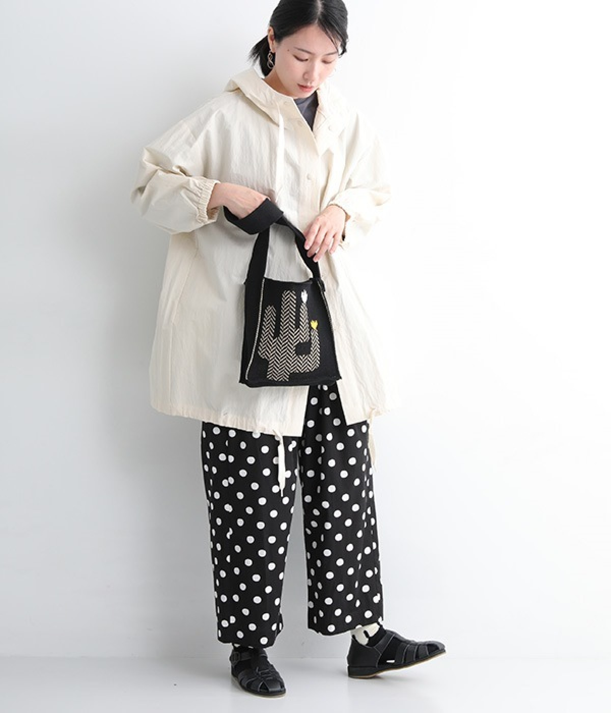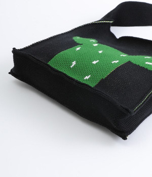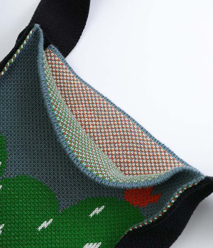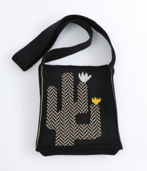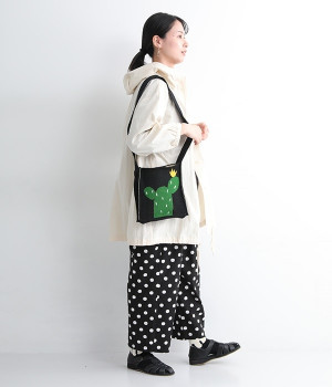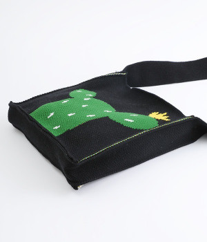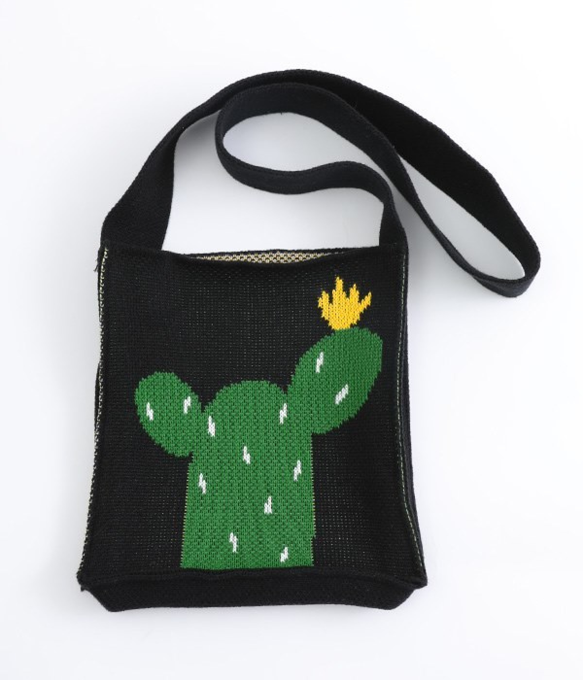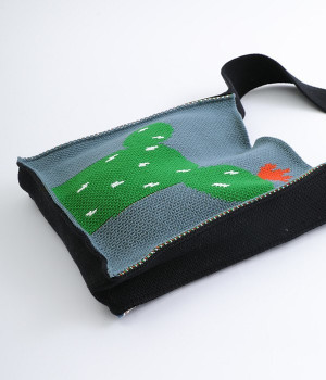 綿糸で度詰めに編み立てたジャカードニットのショルダーバッグです。財布や携帯電話などの必需品がおさまる、ちょうどいいサイズに仕上げました。肩に軽くかけられる、太めのワンショルダータイプ。裏表で異なるサボテンの柄があしらわれ、気分に合わせて使い分けができます。インパクトのあるモチーフが着こなしのアクセントになってくれます。