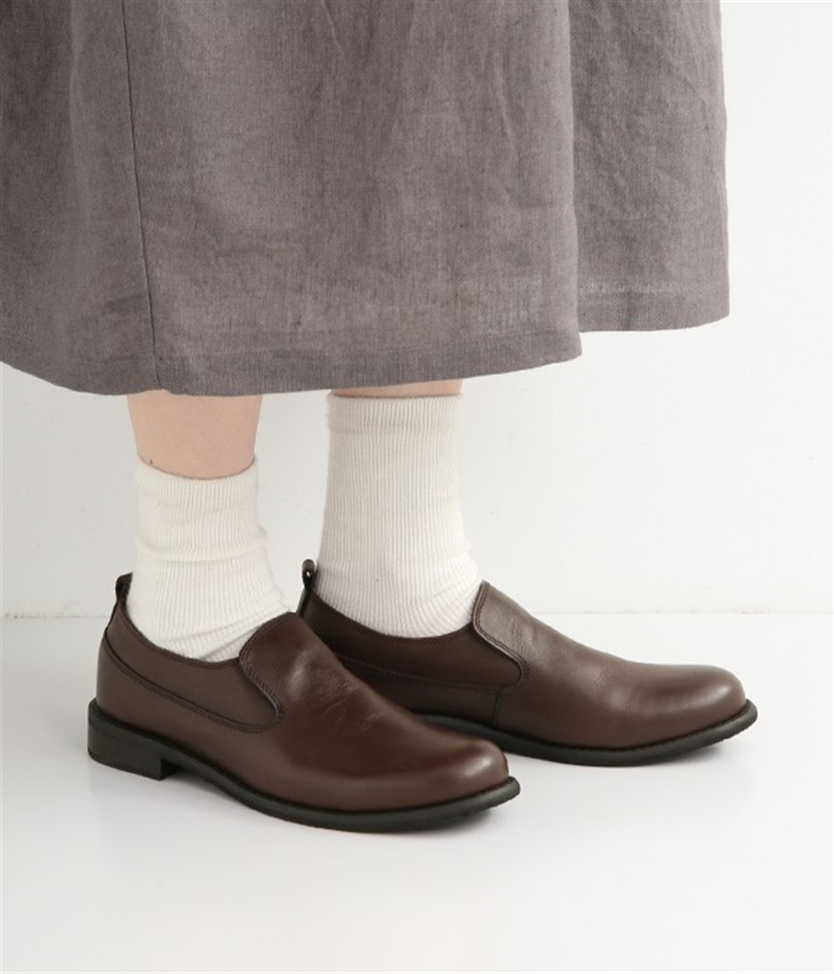 はき口のデザインがポイントのスリッポンシューズ。シンプルで洗練されたルックスで、幅広いコーディネートにマッチします。甲部分にはゴムが隠れているので、着脱がスムーズ。フラットタイプなので足が疲れにくく、クッション性のあるインソールで歩行時の負担を軽減してくれます。カジュアルにもきれいめな装いにも使える一足です。