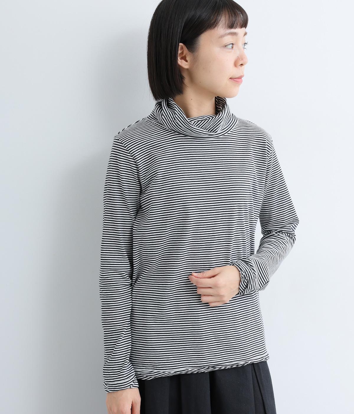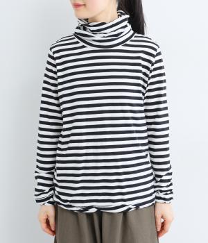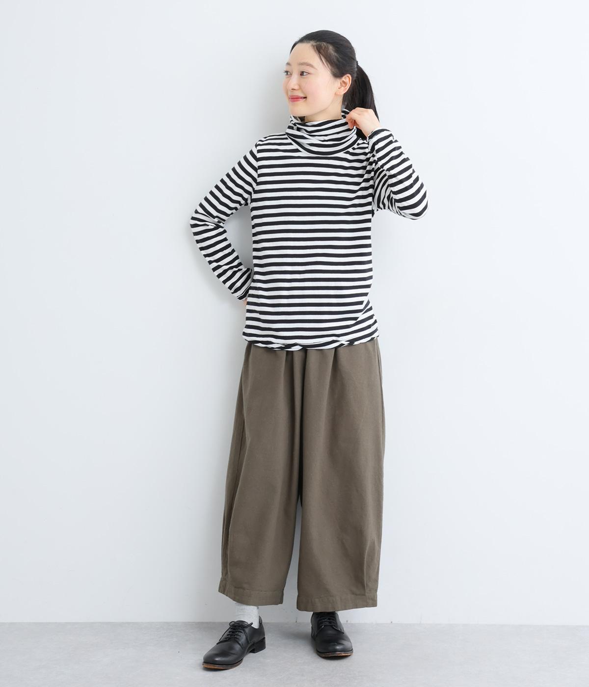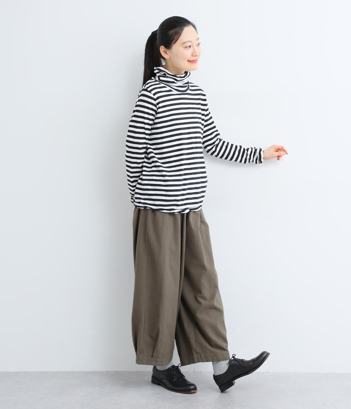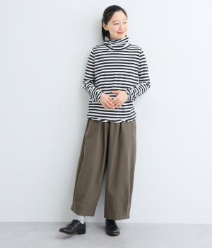 メインにもレイヤードのチラ見せにも活躍するボーダー柄プルオーバー。くしゅっとしたタートルネックが顔まわりにニュアンスを追加。袖口や裾はツイストさせてディテールにもこだわりました。