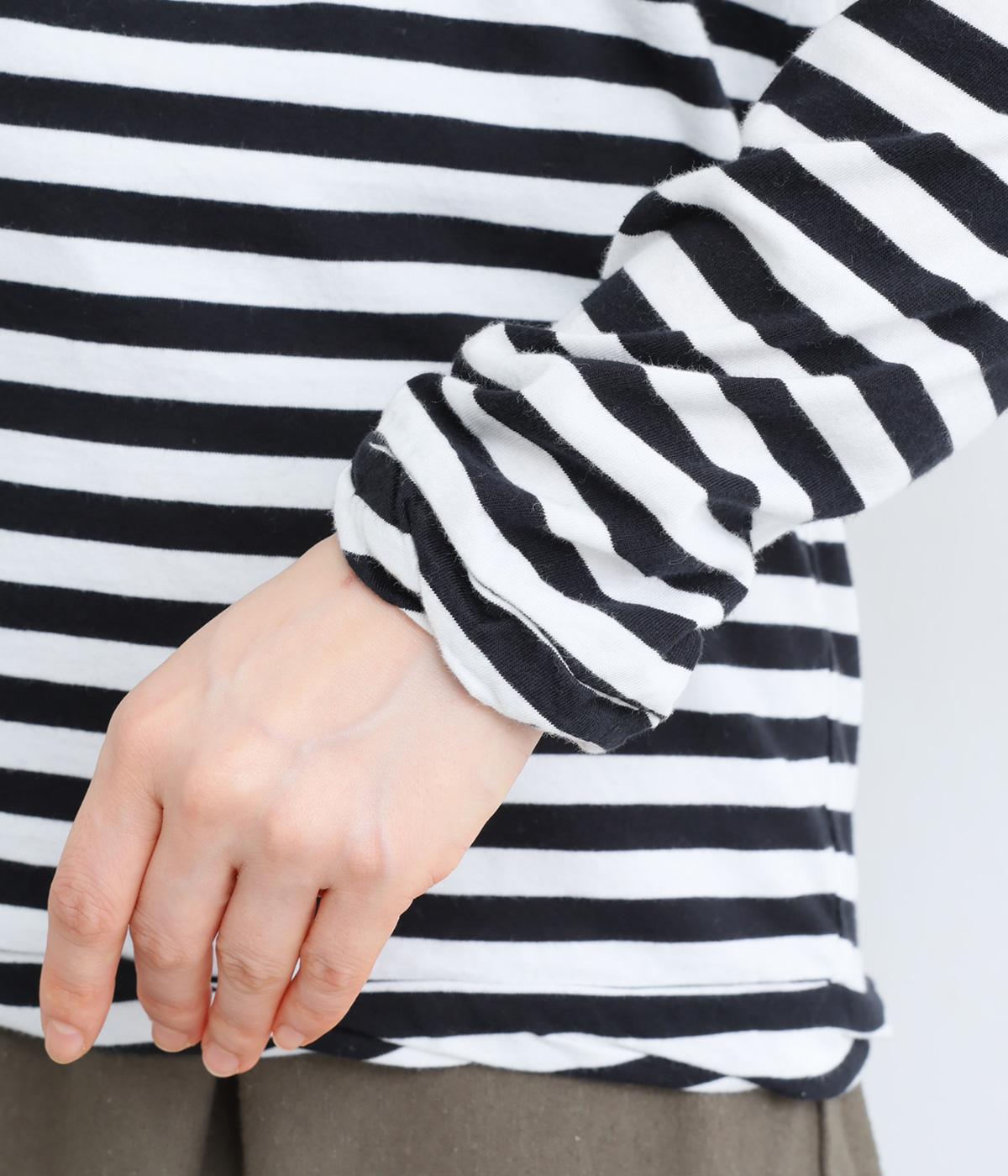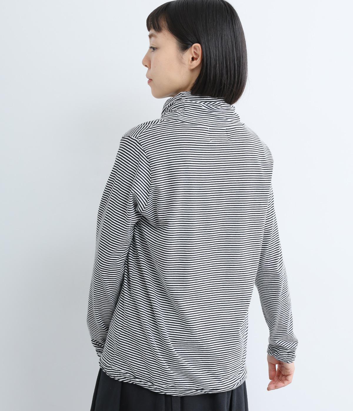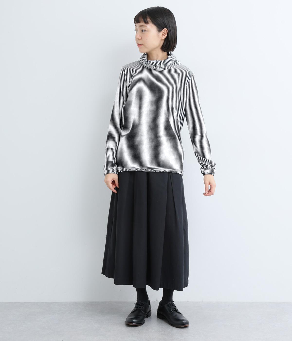 メインにもレイヤードのチラ見せにも活躍するボーダー柄プルオーバー。くしゅっとしたタートルネックが顔まわりにニュアンスを追加。袖口や裾はツイストさせてディテールにもこだわりました。