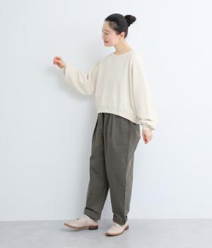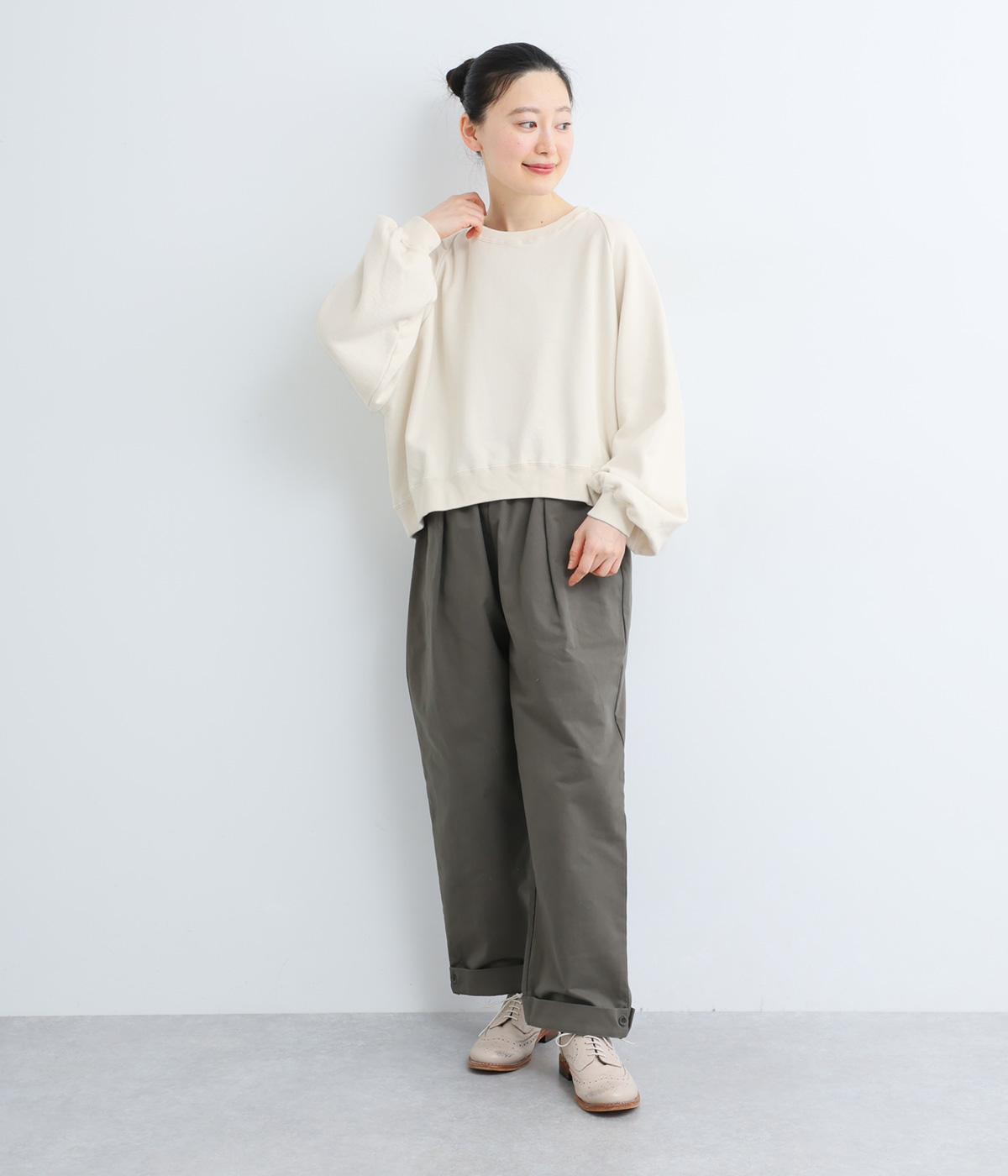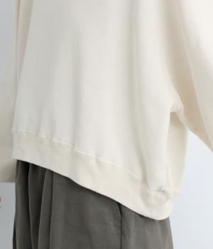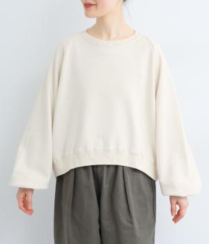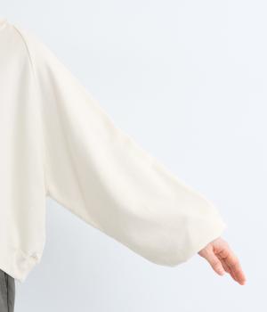 ゆったりとボリュームをつけたラグランスリーブが特徴的な一枚。身頃はすっきりとしたショート丈でビッグシルエットすぎず、バランスよく着こなせます。丸みのあるシルエットでカジュアルスタイルに女性らしさをプラス。