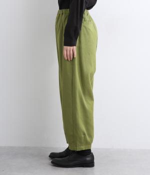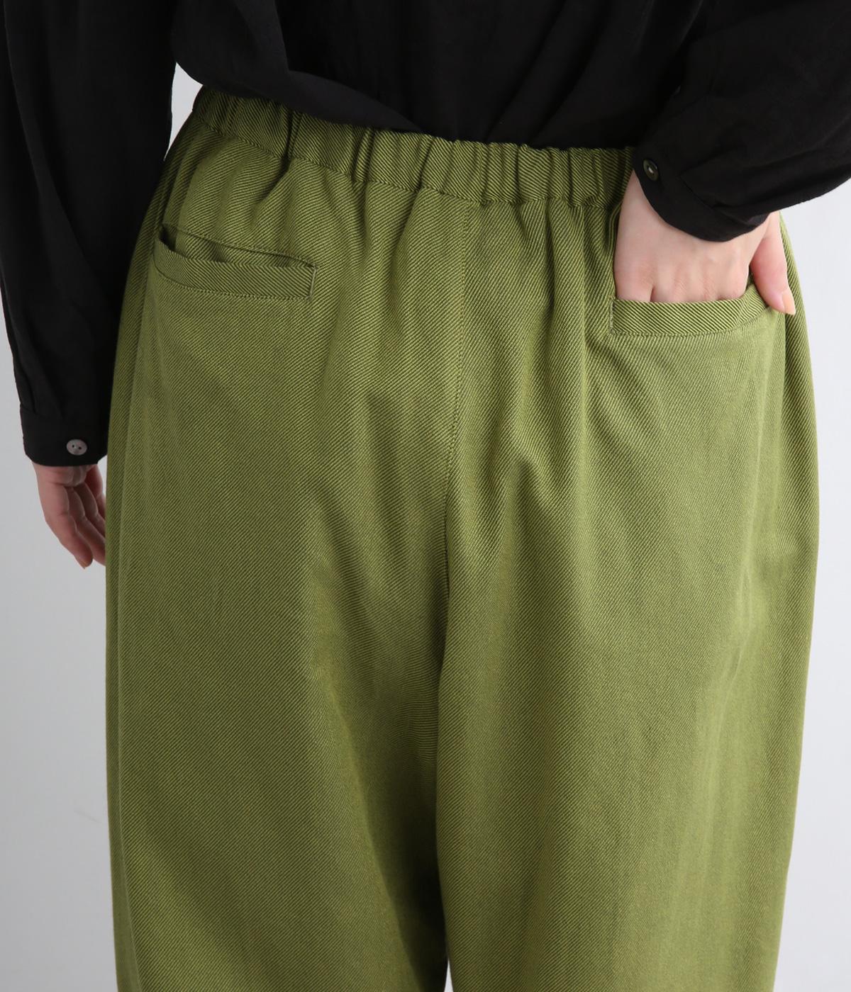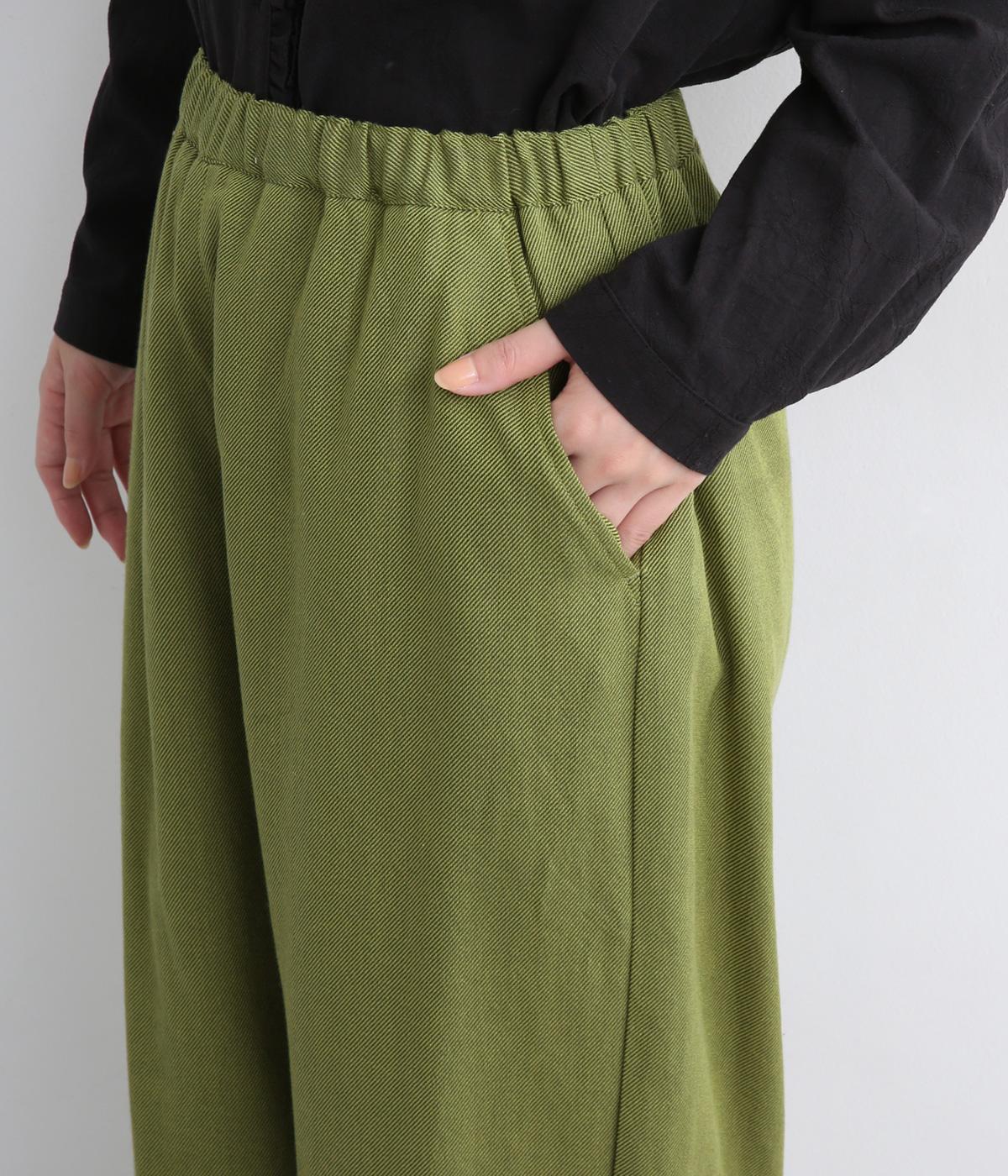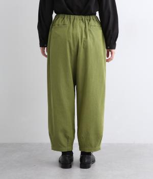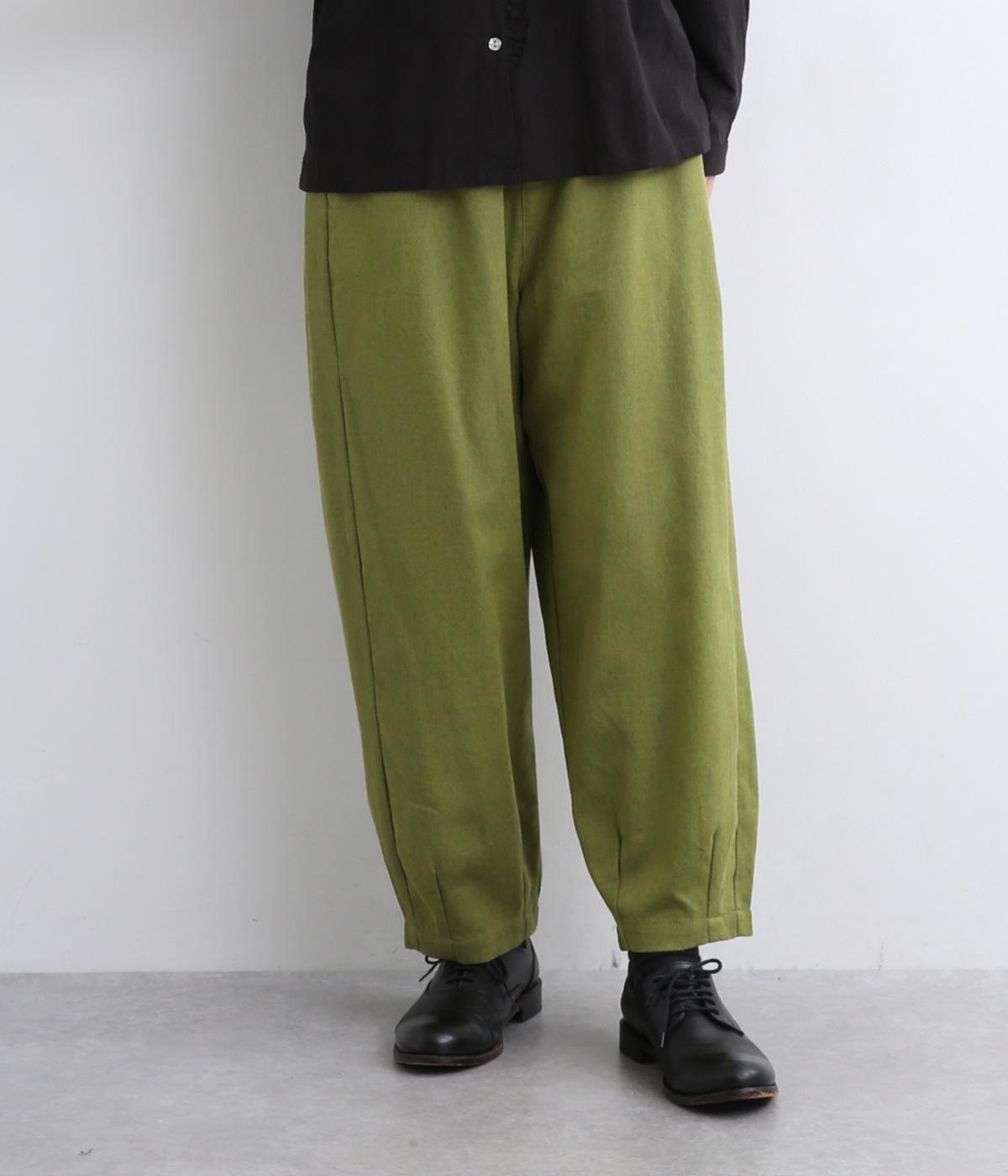 体のラインを拾いにくいコクーンシルエット。裾に向かってすっきりとしぼまるラインが、こなれ感のある着こなしを演出します。裏地付きで安心感があり、ウエストゴム仕様で快適な穿き心地。さまざまなトップスと合わせやすく、着まわし力の高い一着です。