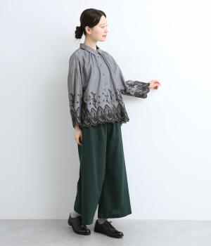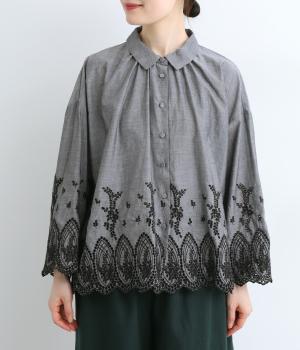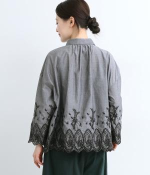 身頃と袖に大胆にほどこしたスカラップ刺しゅうが品よく華やかなブラウス。適度にゆとりを持たせたシルエットやナチュラル素材が、ロマンティックなディテールと好バランス◎。くるみボタンでクラシカルにまとめた前あき仕様です。