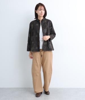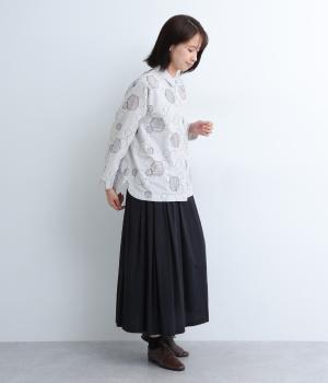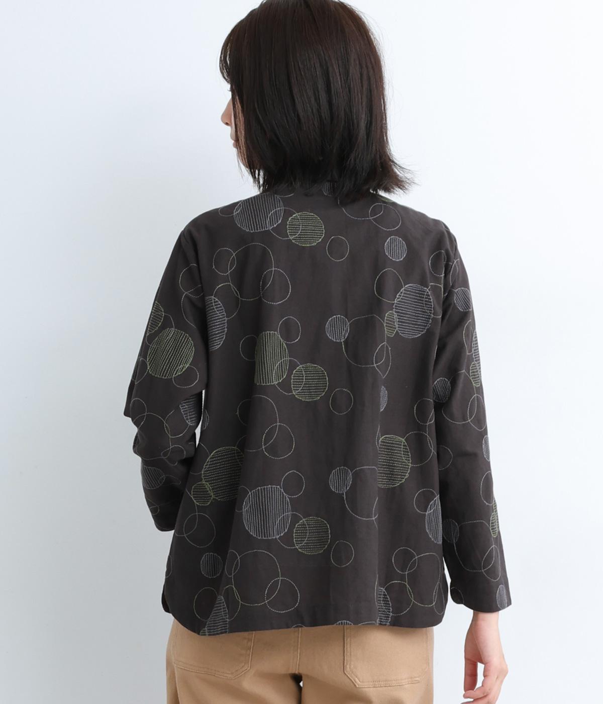 個性的なドット刺しゅうが目をひくブラウスです。きちんと感のある襟と、比翼仕立ての前立てですっきり見えます。丸みのある袖口と裾がかわいらしさを演出します。ディテールにもこだわりの詰まった一枚です。
