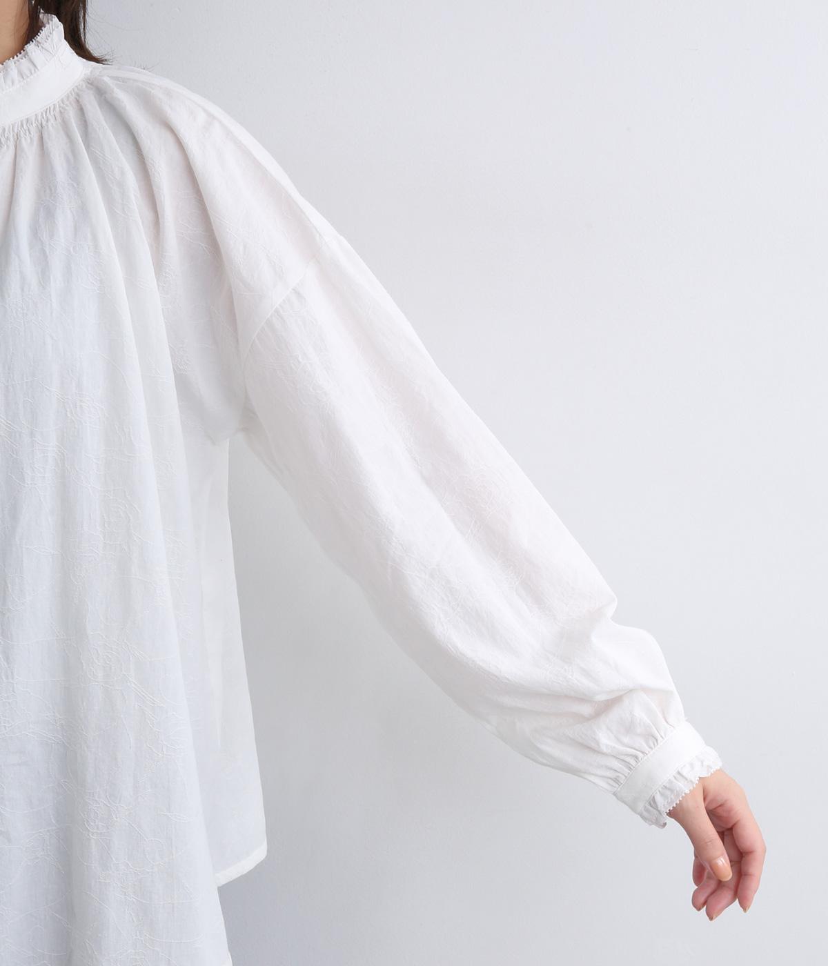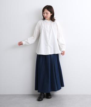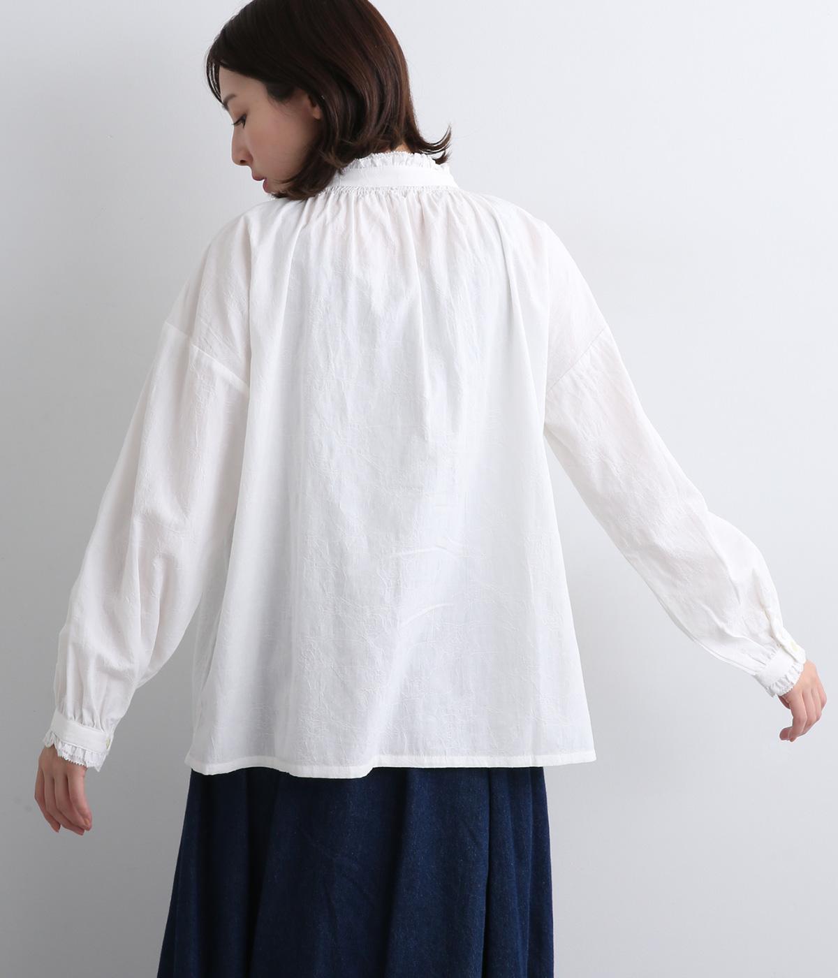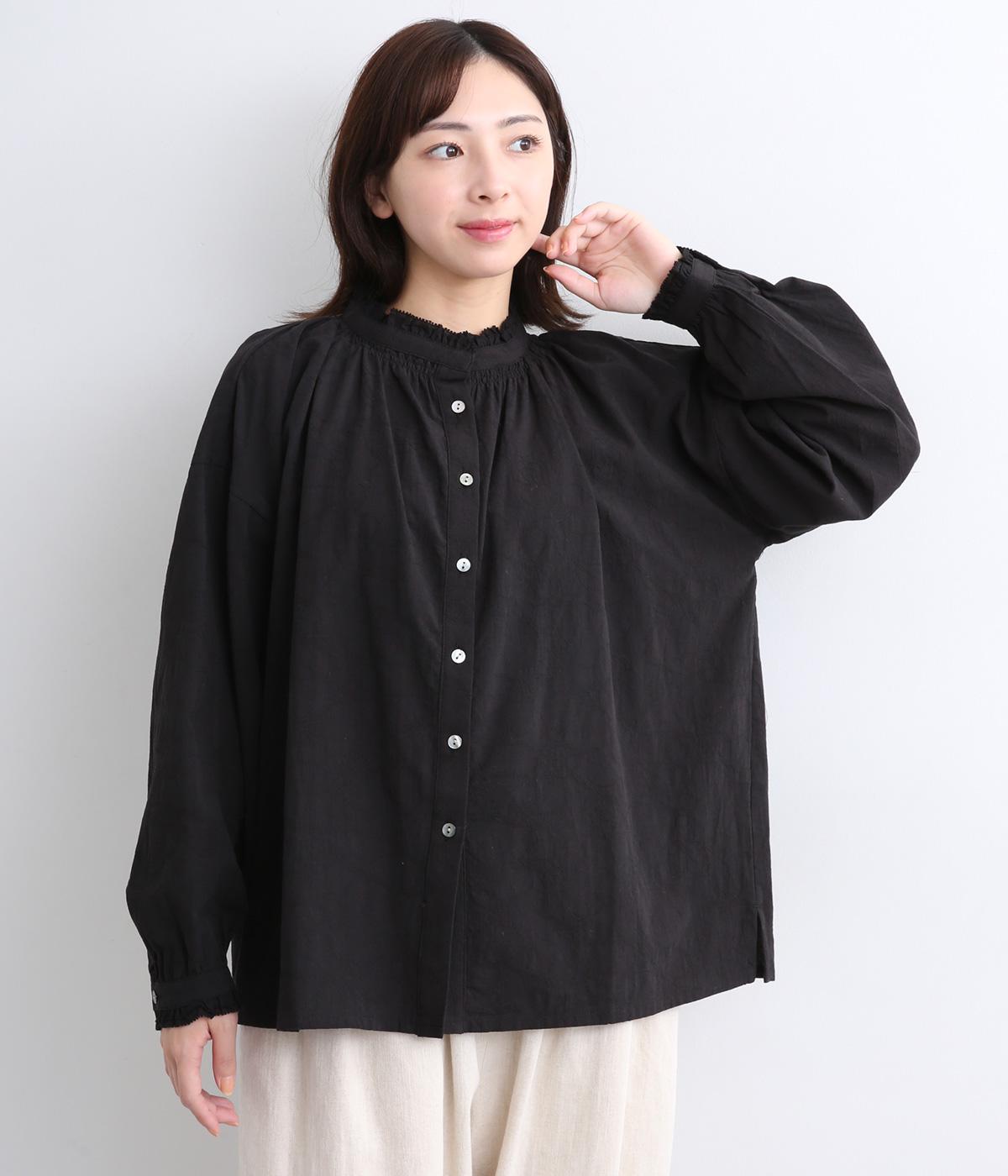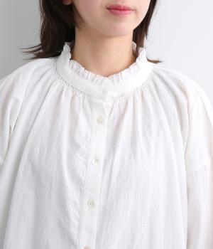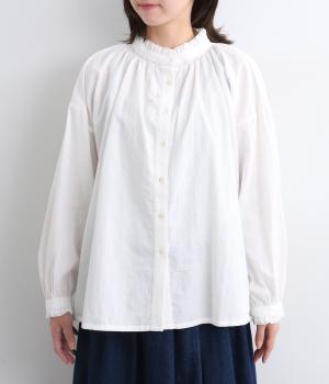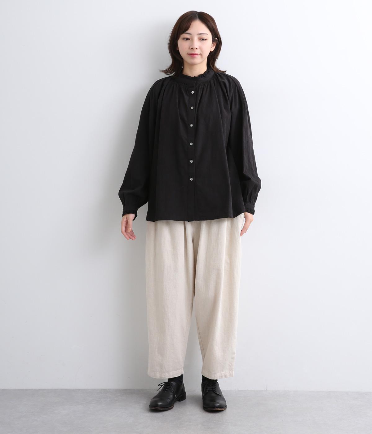 シャーリングの襟や袖がかわいらしい印象のブラウス。首元や袖口にほどこしたたっぷりのギャザーが女性らしい立体感のあるシルエットを描きます。きちんと見えしつつ、ゆったりした身幅でリラクシーな着心地を叶えます。