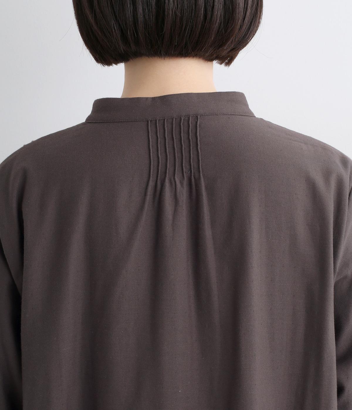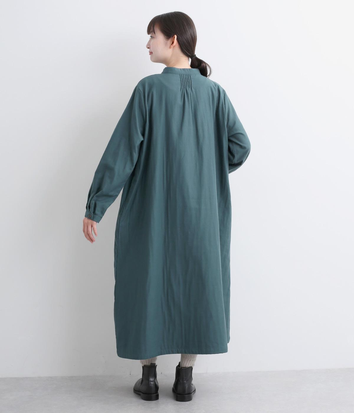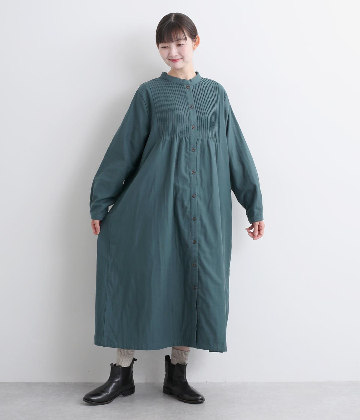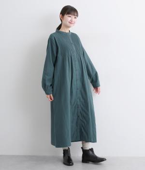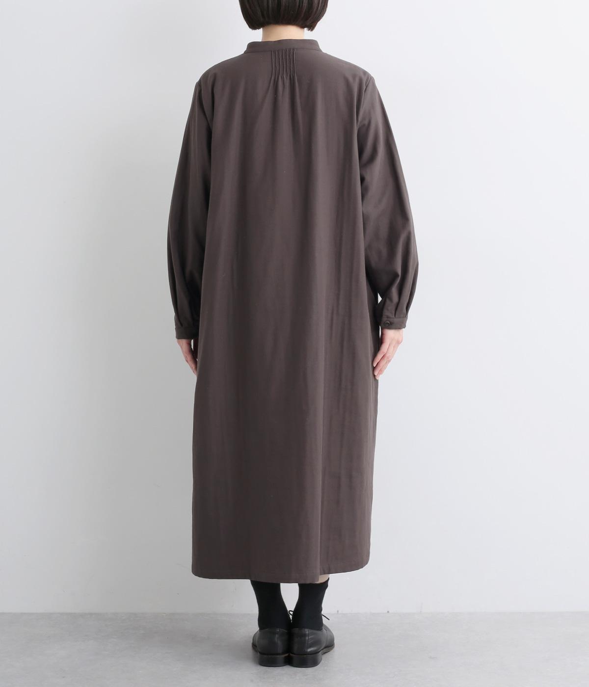 フロントにたっぷりピンタックをあしらったワンピース。前開きのふんわりしたシルエットで、ボタンをあけてコートのように羽織るのもおすすめです。バンドカラーで首元はすっきりと。タートルネックやマフラーなどとも合わせやすく仕上げました。