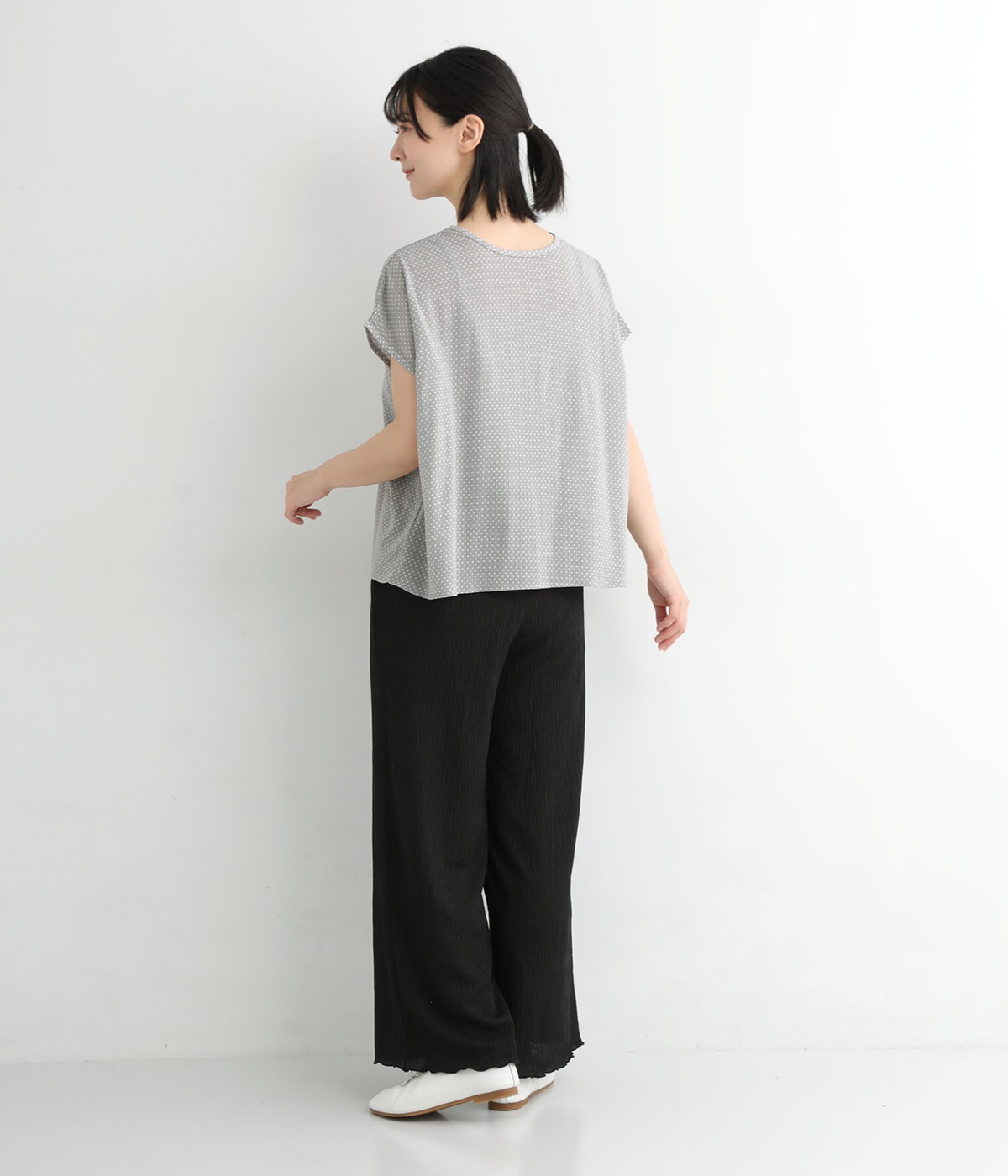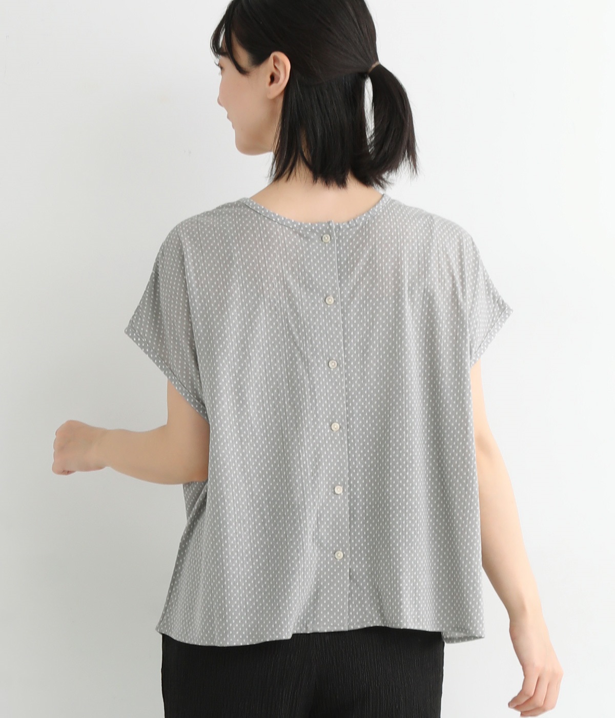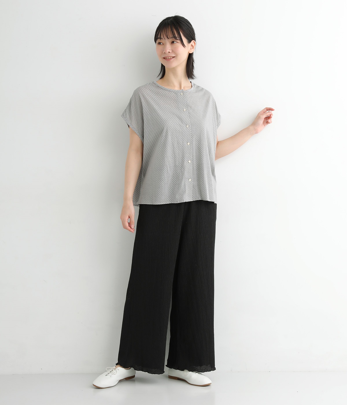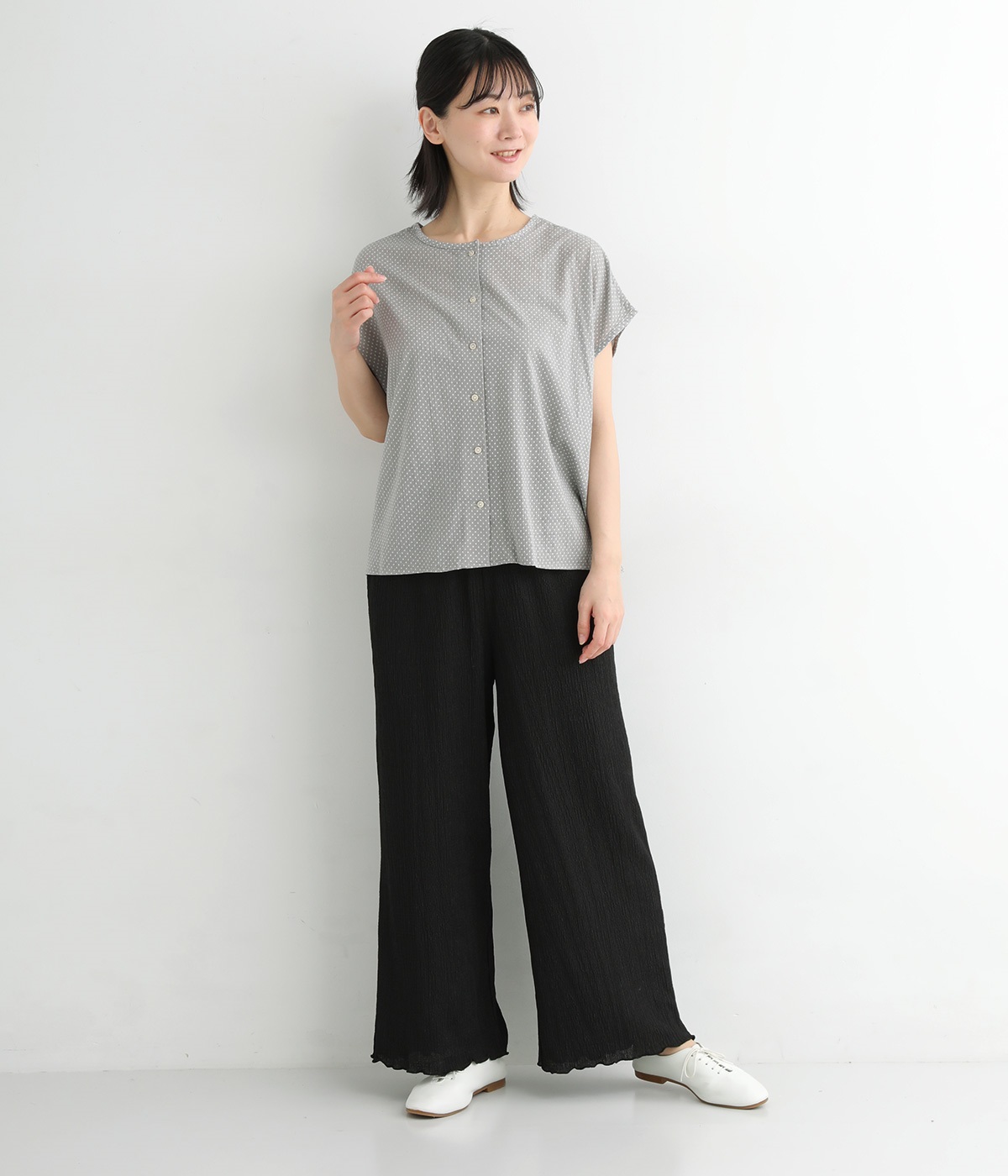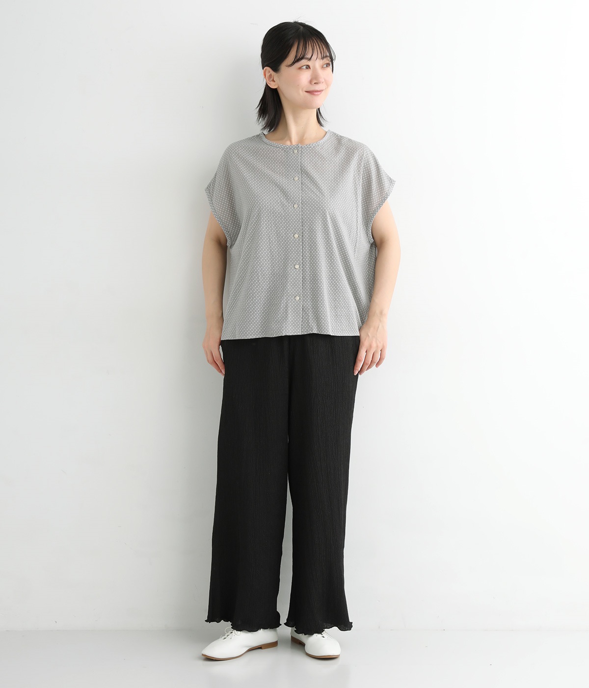 ポコポコとした表情を作る塩縮加工をほどこした薄手のコットン生地を使用しています。小さめのドットプリントをのせて大人ガーリーな印象に仕上げました。