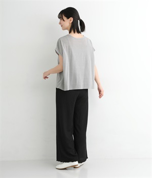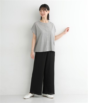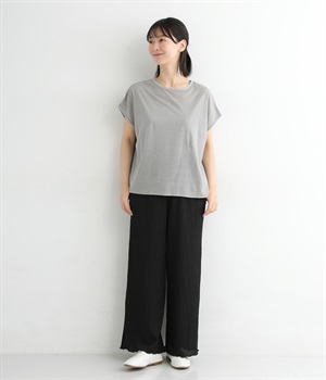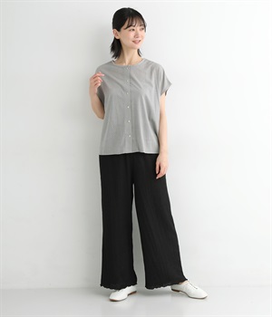 ドロップショルダーでフレンチスリーブのようなシルエットに仕立てたプルオーバーです。前あきの羽織りとしてもたのしめる前後2wayで、バリエーション豊かに着まわせます。締めつけの少ないシルエットで独特の抜け感のある一枚です。
