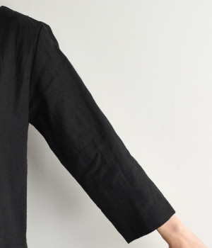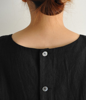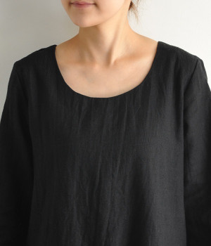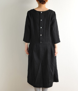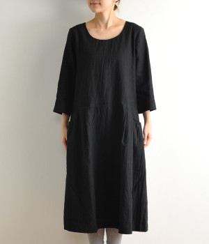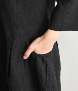 シルクプロテイン加工という特殊な加工を施したリネンを使ったワンピースです。生地に光沢と厚みがあるので一枚でも着用できます。ウエスト切り替えのところにギャザーポケットがあるのもポイントです。お出かけ着としても、フォーマルとしても使えて着こなしの幅が広がる一枚です。