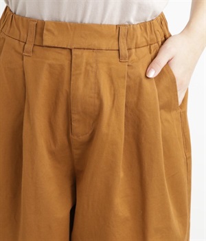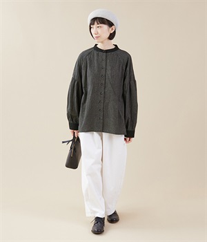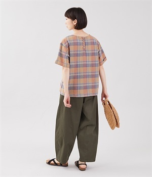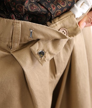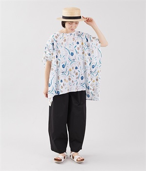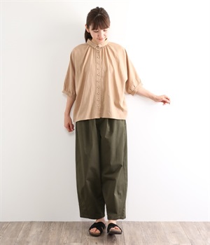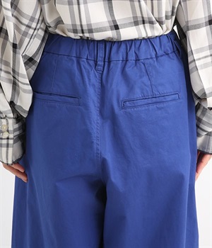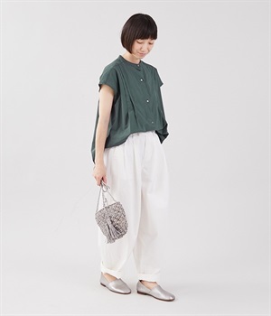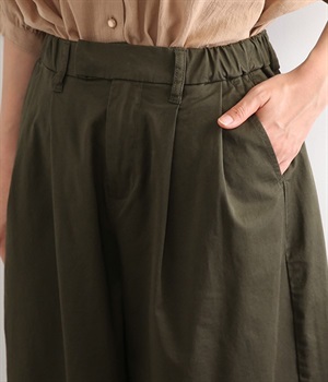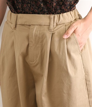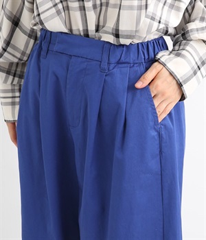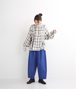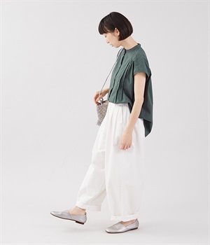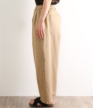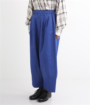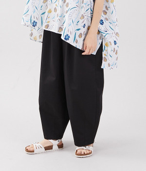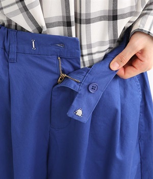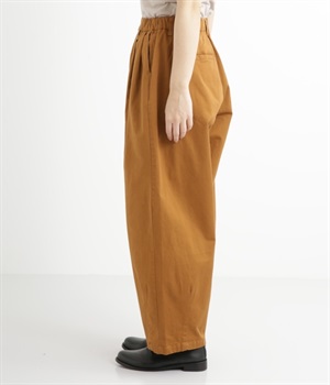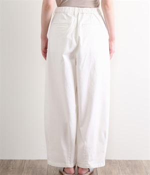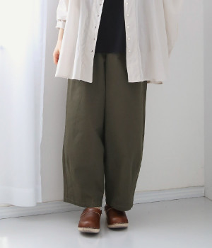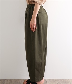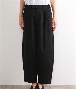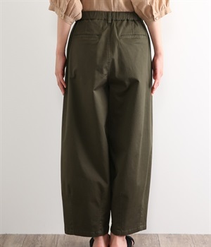 ワイドなボリューム感とテーパードのすっきり感をミックスしたバルーンシルエットのパンツです。より丸みを出すために入れた裾のダーツがワンポイントに。通常のバルーンシルエットよりやや細めに仕立てており、あらゆるトップスとのコーデもバランスが良くなるように仕上げています。ウエストは後ろ部分のみゴム仕様です。両サイド、バックにポケット付き。