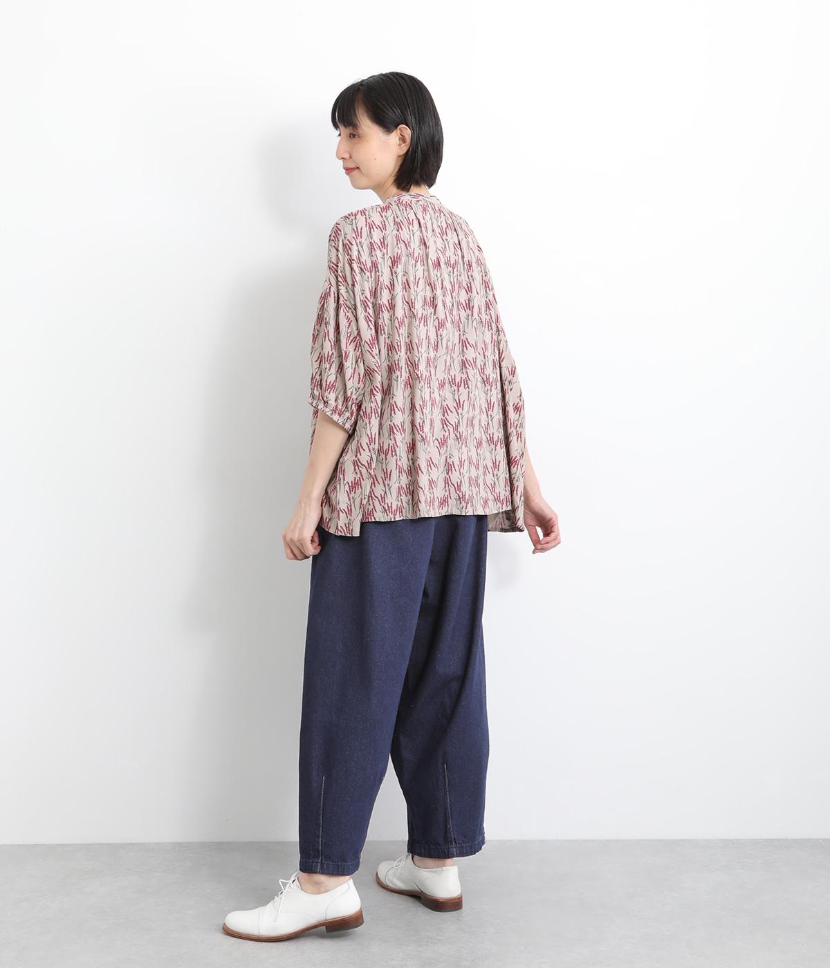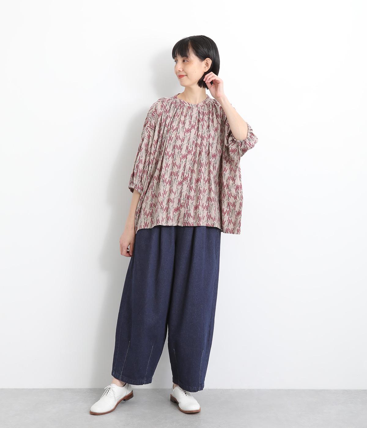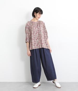 より丸みを出す裾ダーツがワンポイントで、ボリュームがありながらもやや細めのバルーンシルエットがバランス良く着こなせるポイント。ウエストは後ろ部分のみゴム仕様でタブデザインがアイキャッチになっています。