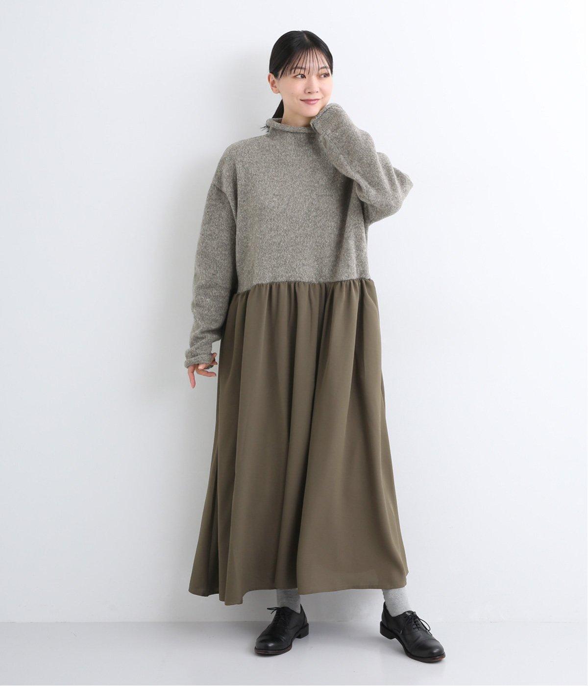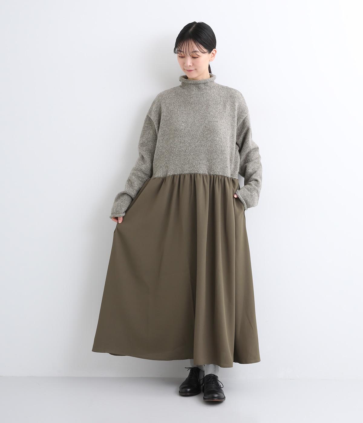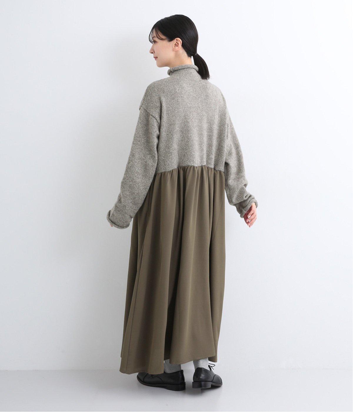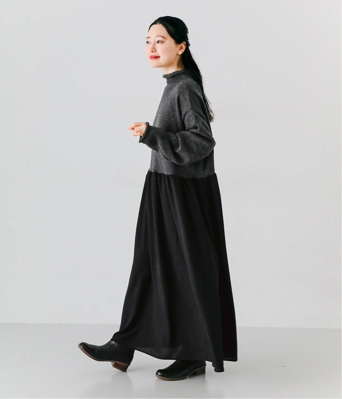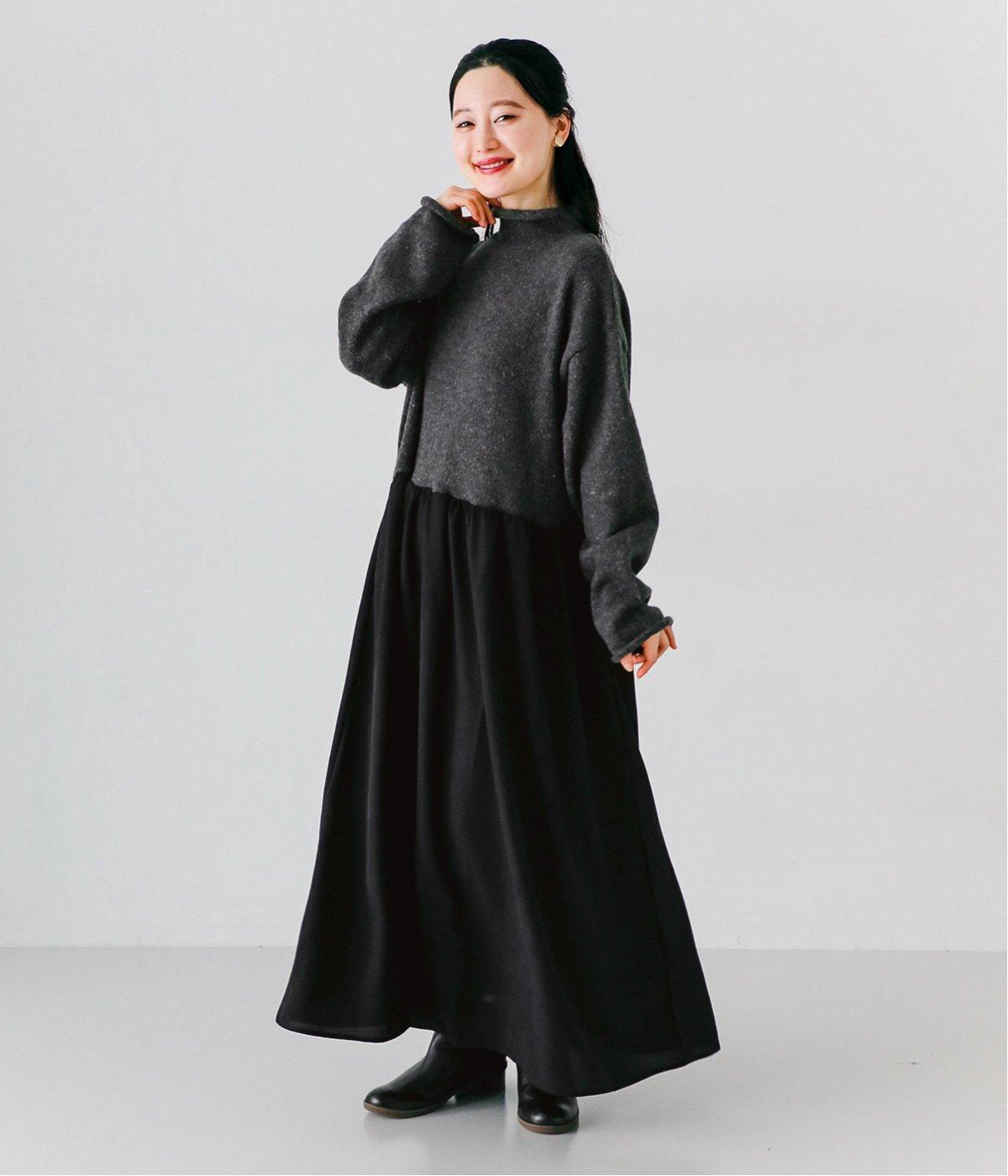 ニットとスカートを合わせたようなデザインで、1枚でコーディネートが完成。ニットはハイネックになっており、詰まりすぎない絶妙なネック丈がポイント。落ち感のあるスカート部分の生地と合わせることで、ドレッシーな雰囲気に仕上げました。