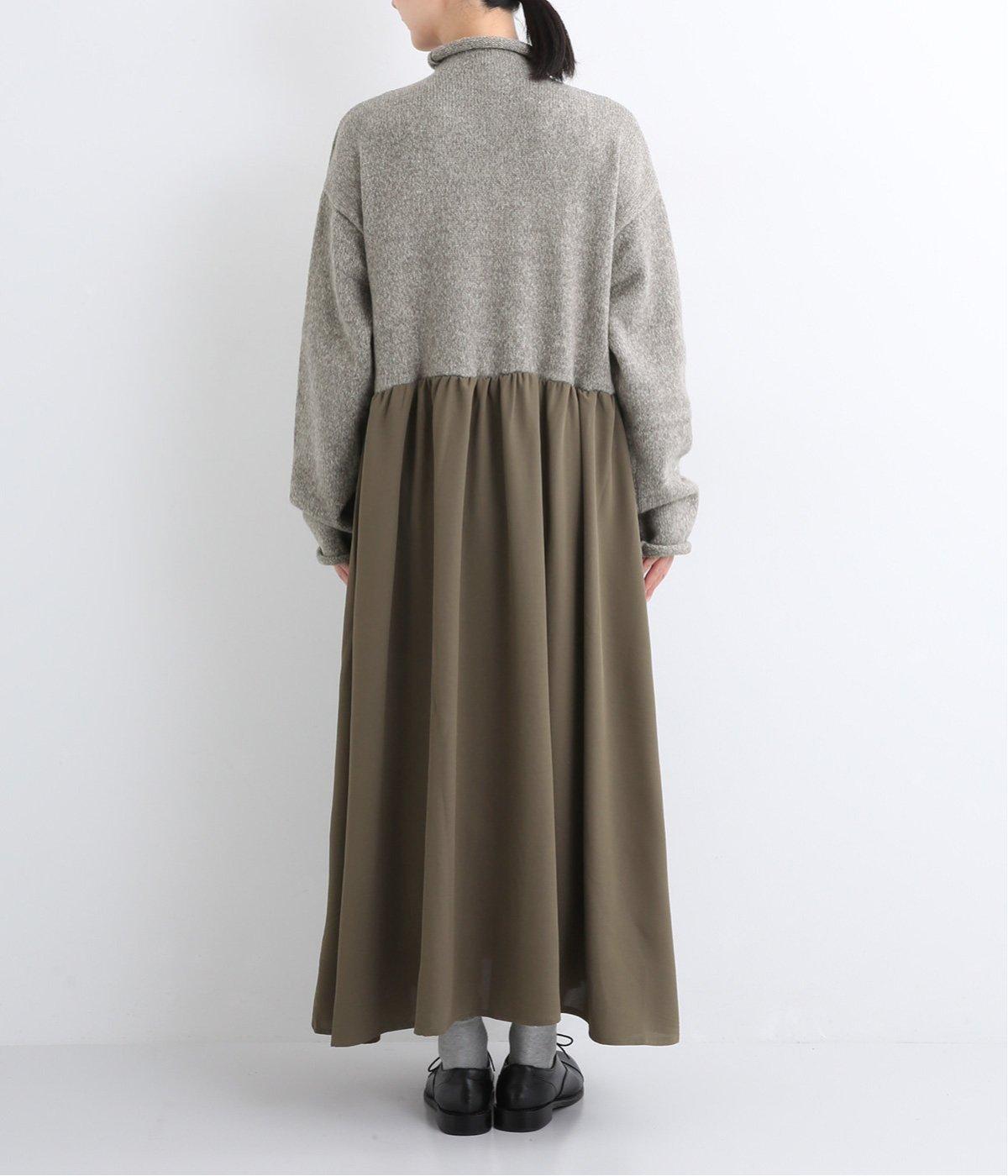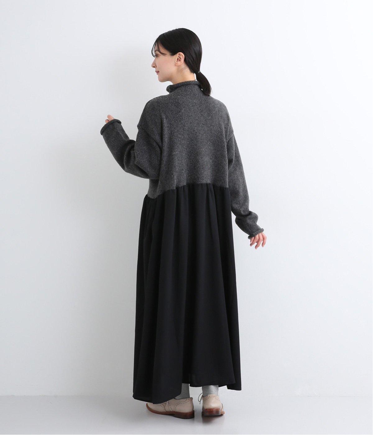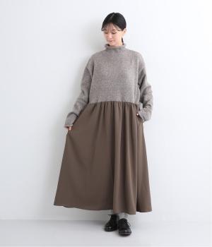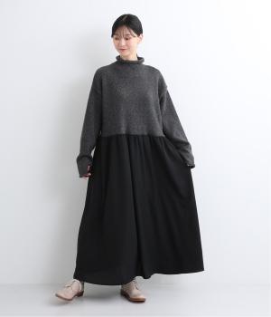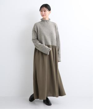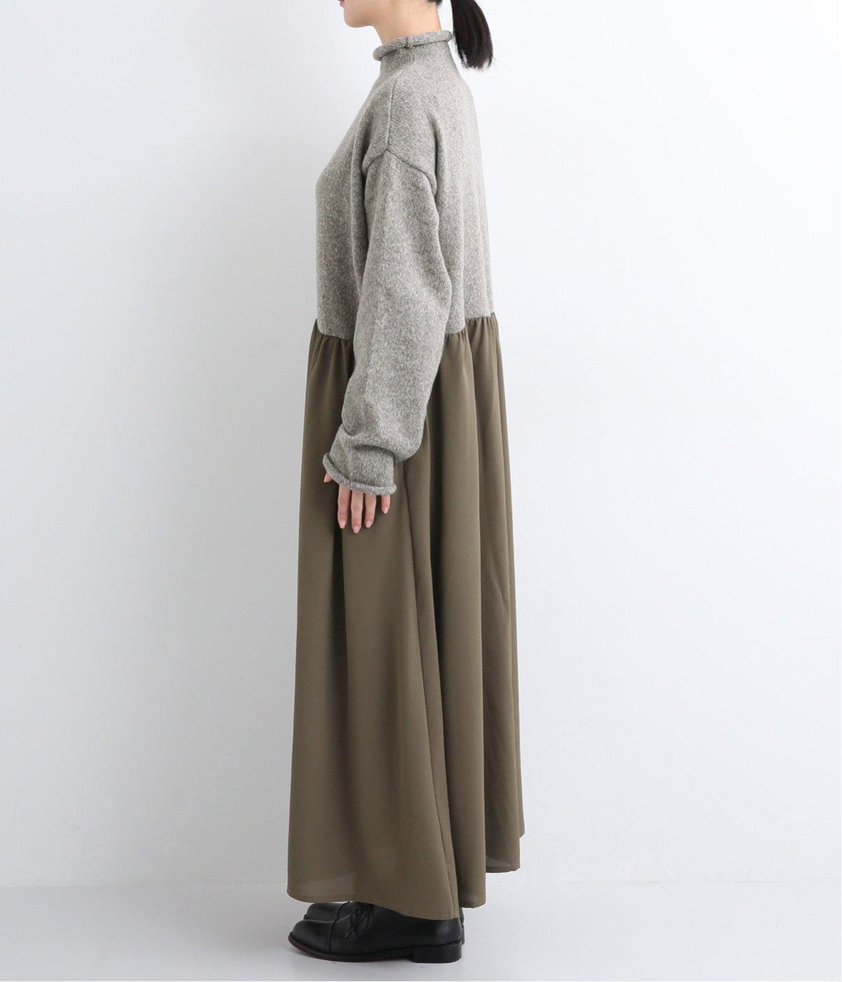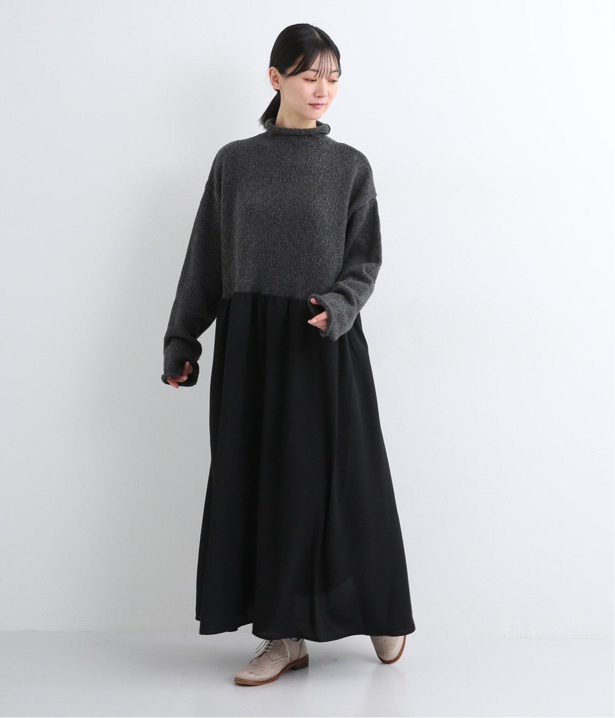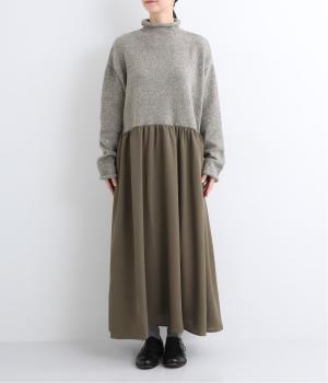 ニットとスカートを合わせたようなデザインで、1枚でコーディネートが完成。ニットはハイネックになっており、詰まりすぎない絶妙なネック丈がポイント。落ち感のあるスカート部分の生地と合わせることで、ドレッシーな雰囲気に仕上げました。