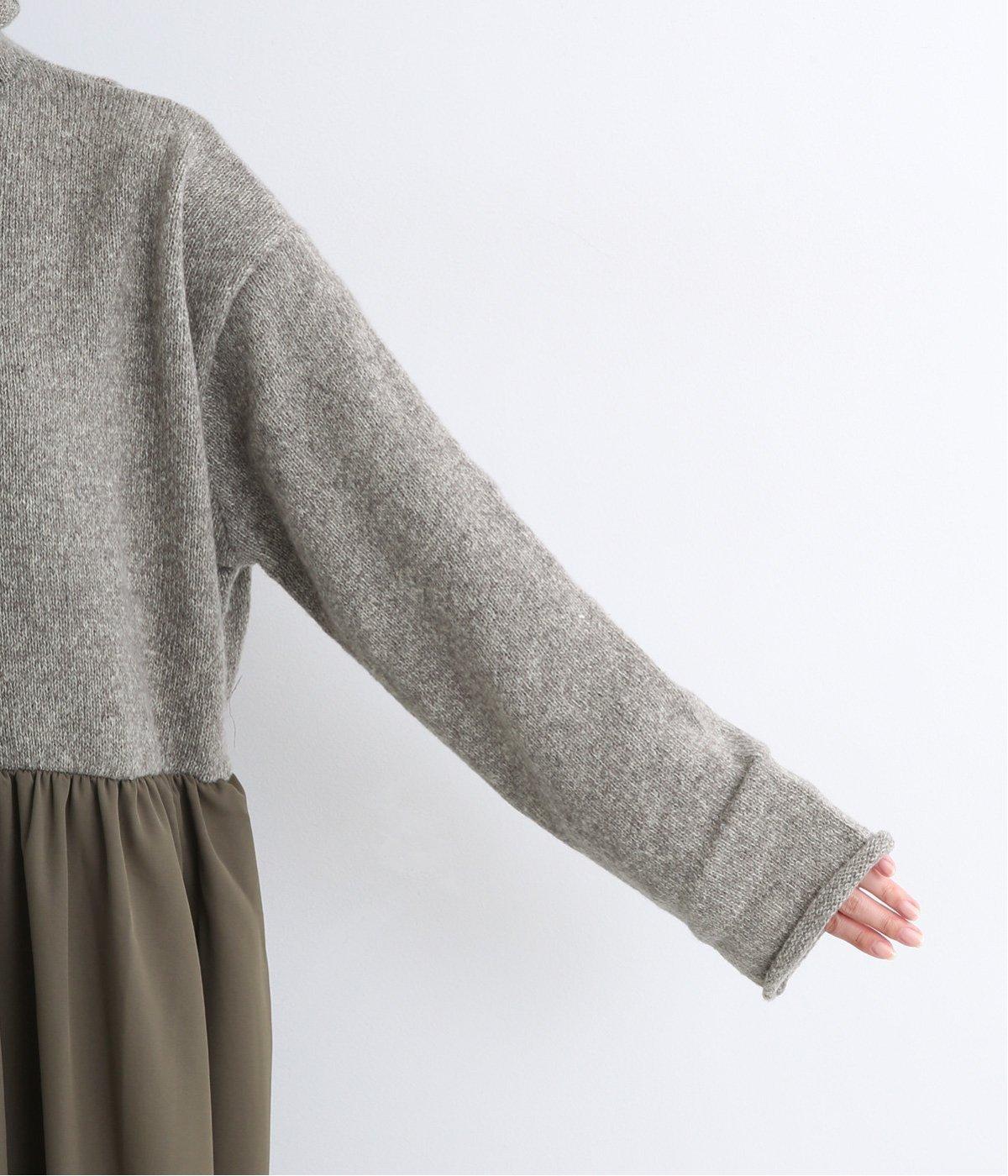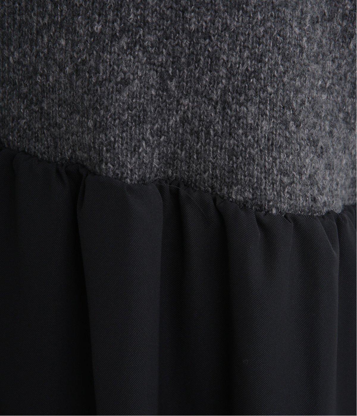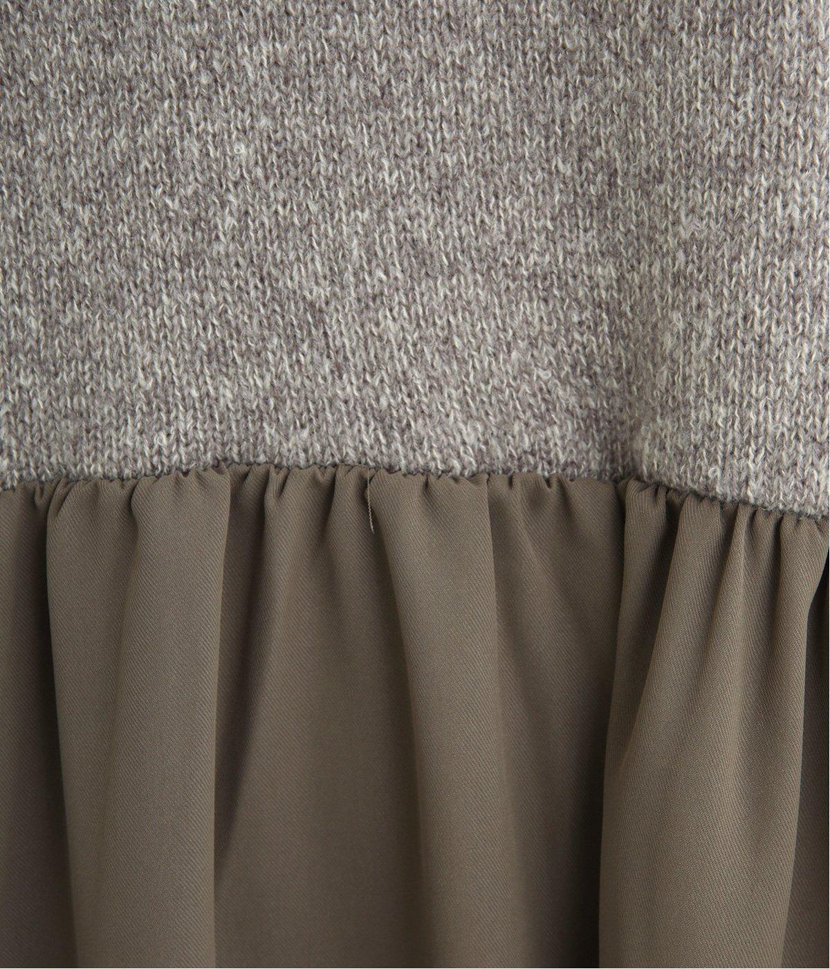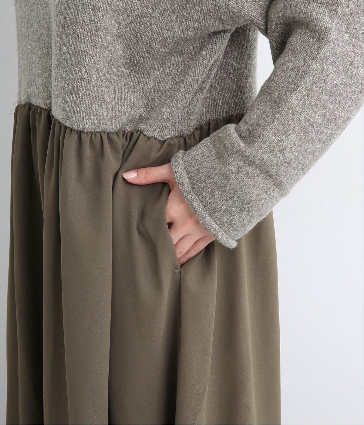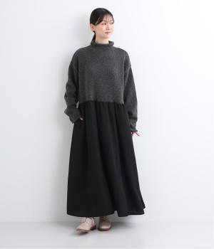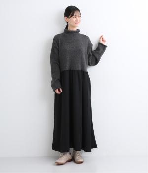 ニットとスカートを合わせたようなデザインで、1枚でコーディネートが完成。ニットはハイネックになっており、詰まりすぎない絶妙なネック丈がポイント。落ち感のあるスカート部分の生地と合わせることで、ドレッシーな雰囲気に仕上げました。