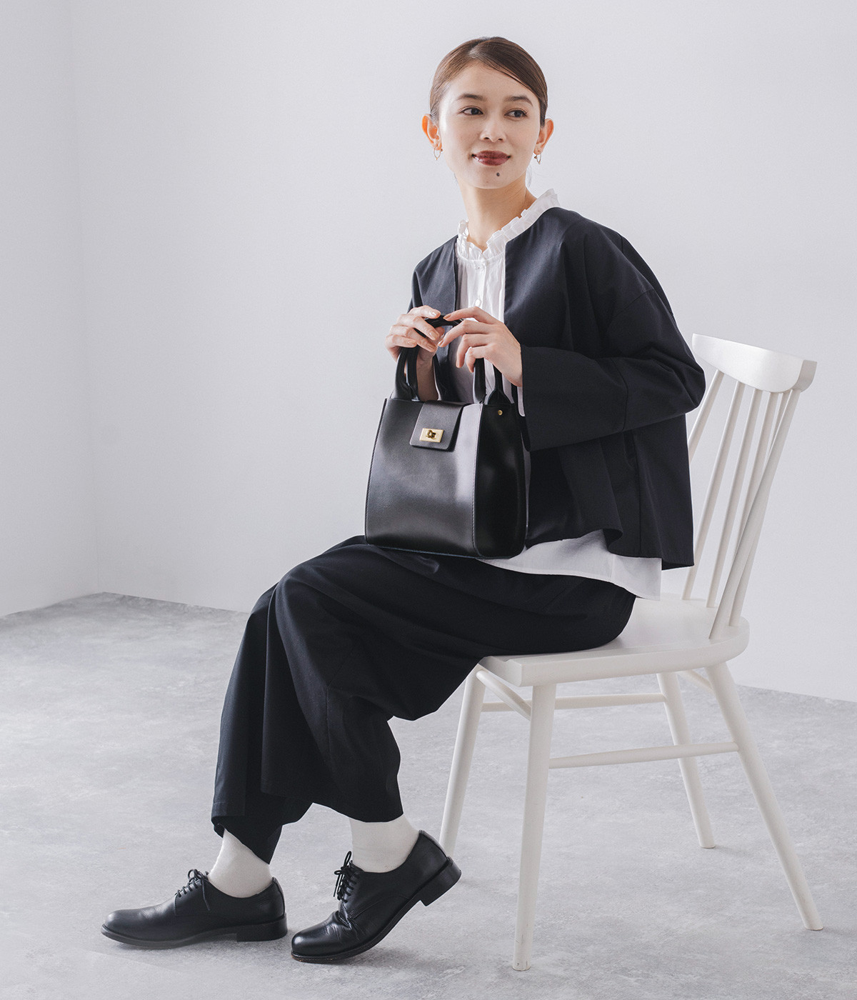 普段のスタイリングに合わせるだけで一気に大人っぽく、上品な雰囲気をプラスできるトートバッグです。フロントについたひねり金具がポイントのデザイン。ボディにはほどよい光沢感のあるレザーを使用しており、金具はツヤを抑えたアンティーク調のゴールドを合わせました。小ぶりなサイジングですが、マチがあるので見た目以上の収納力があります。ハンドルは丸みがあり、しっかりと手に馴染む作りに。